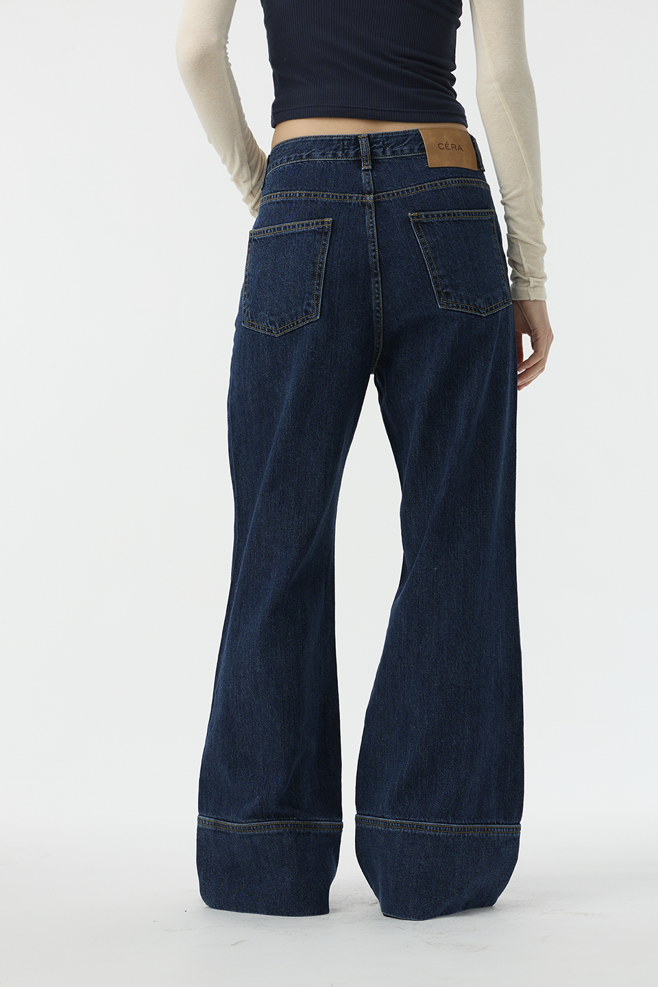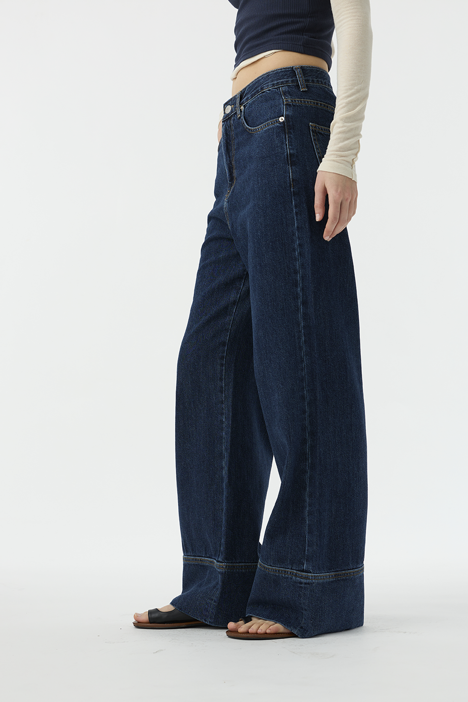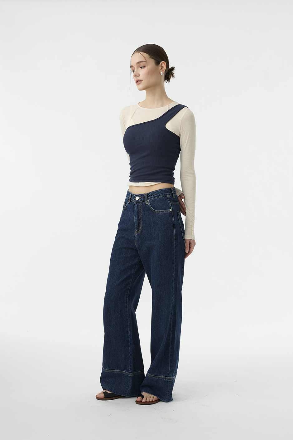 中高腰牛仔褲,加強修飾腰部比例以及腿部線條,落地設計褲管,讓整體身形視覺更加長。