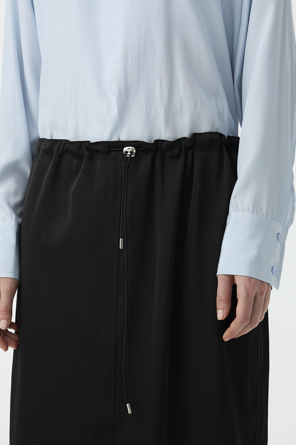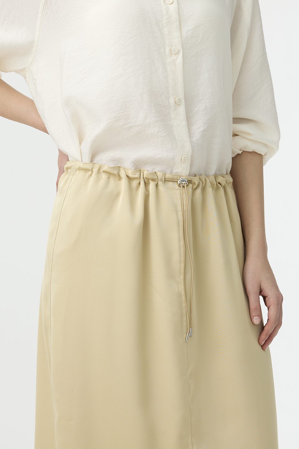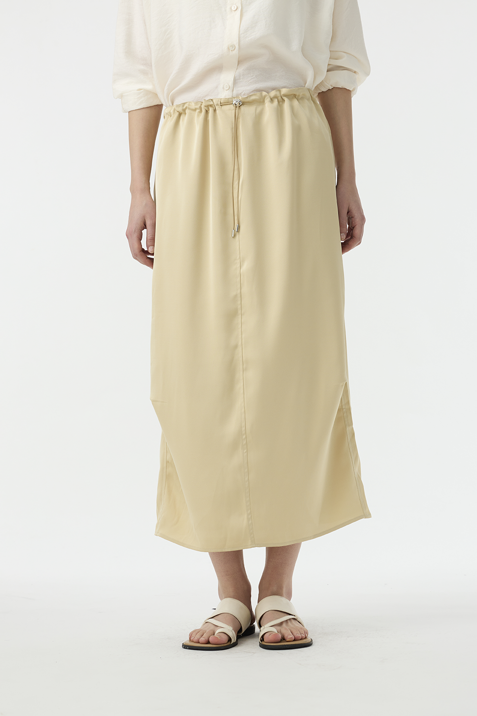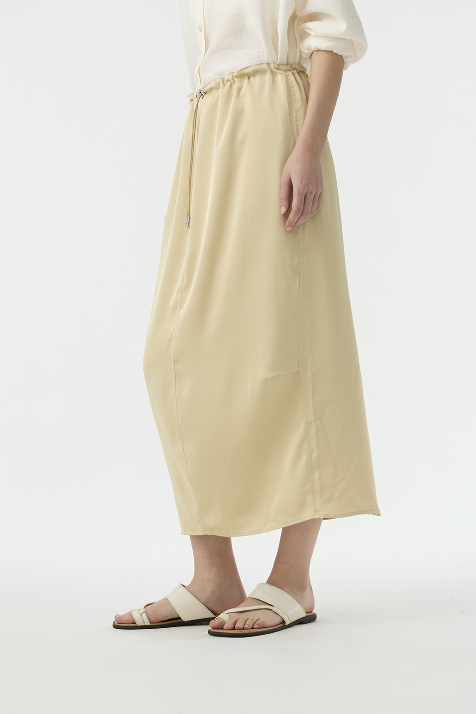 清透光澤面料,讓長裙多了份輕盈感,腰部抽繩設計,讓此單品能夠適應各種腰圍,能夠高腰穿著,也能低腰呈現浪漫感。