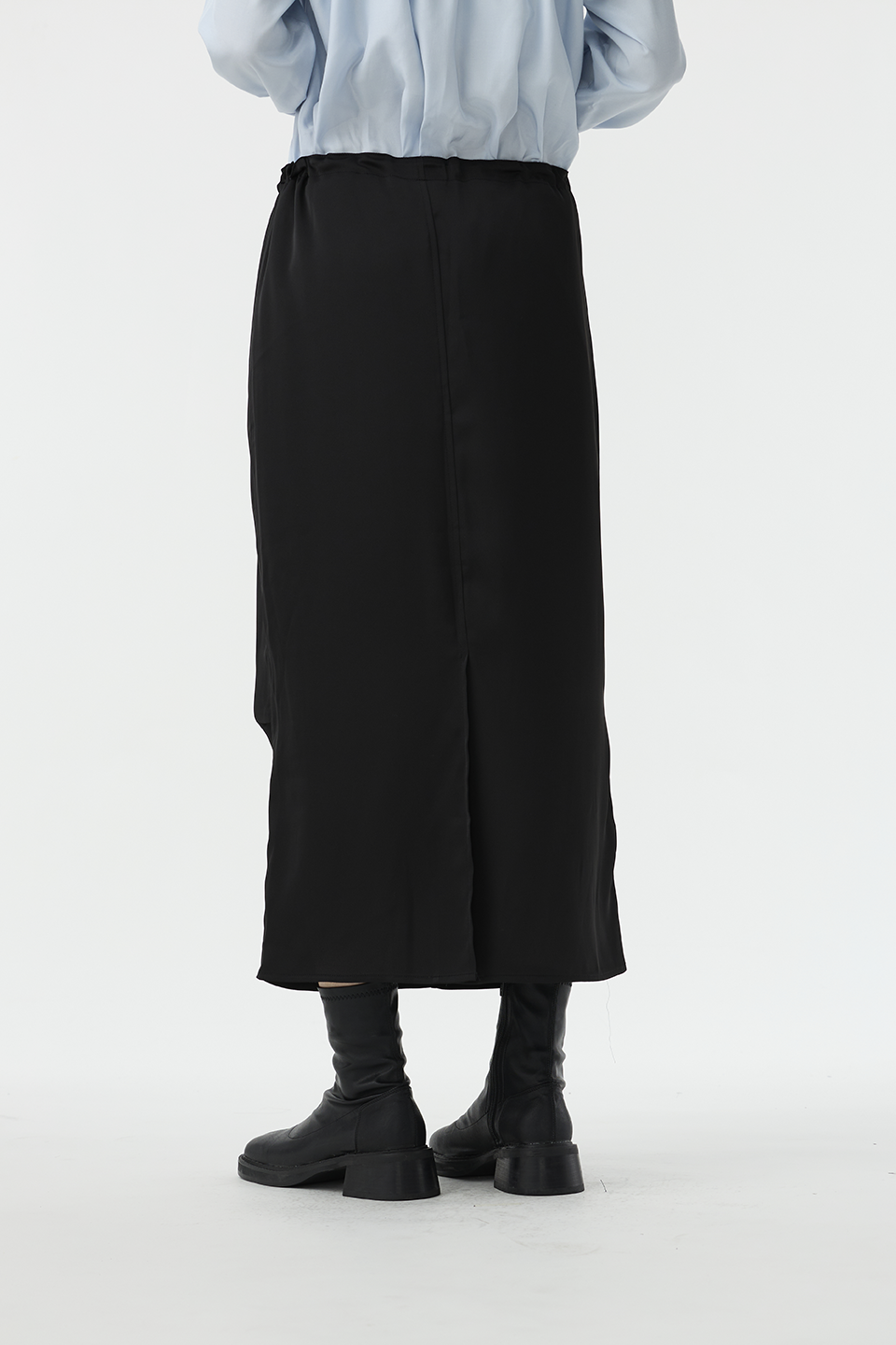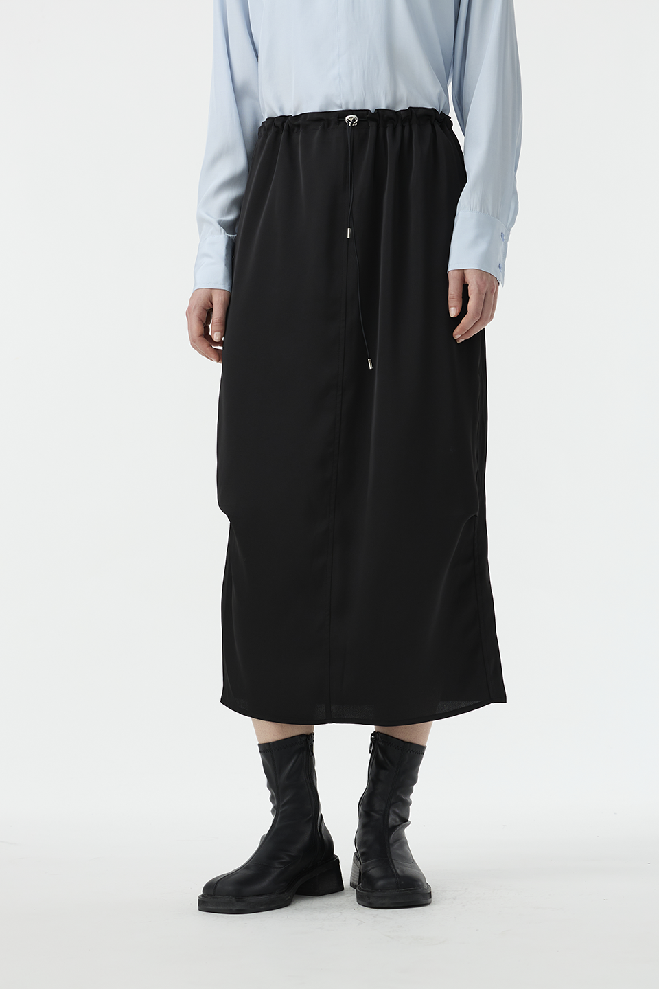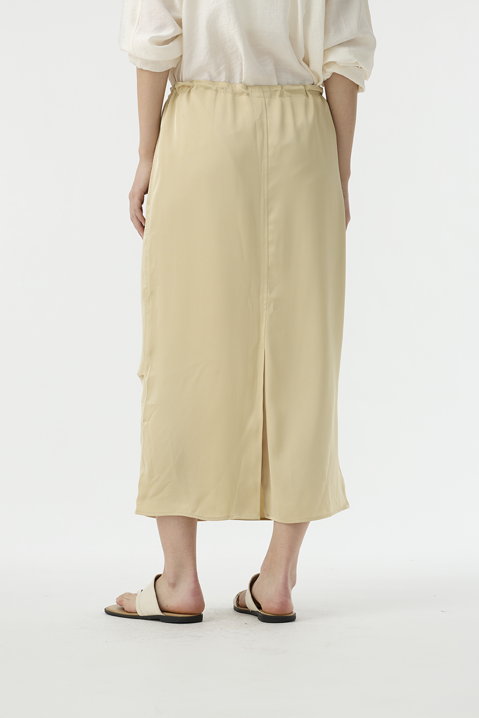 清透光澤面料,讓長裙多了份輕盈感,腰部抽繩設計,讓此單品能夠適應各種腰圍,能夠高腰穿著,也能低腰呈現浪漫感。