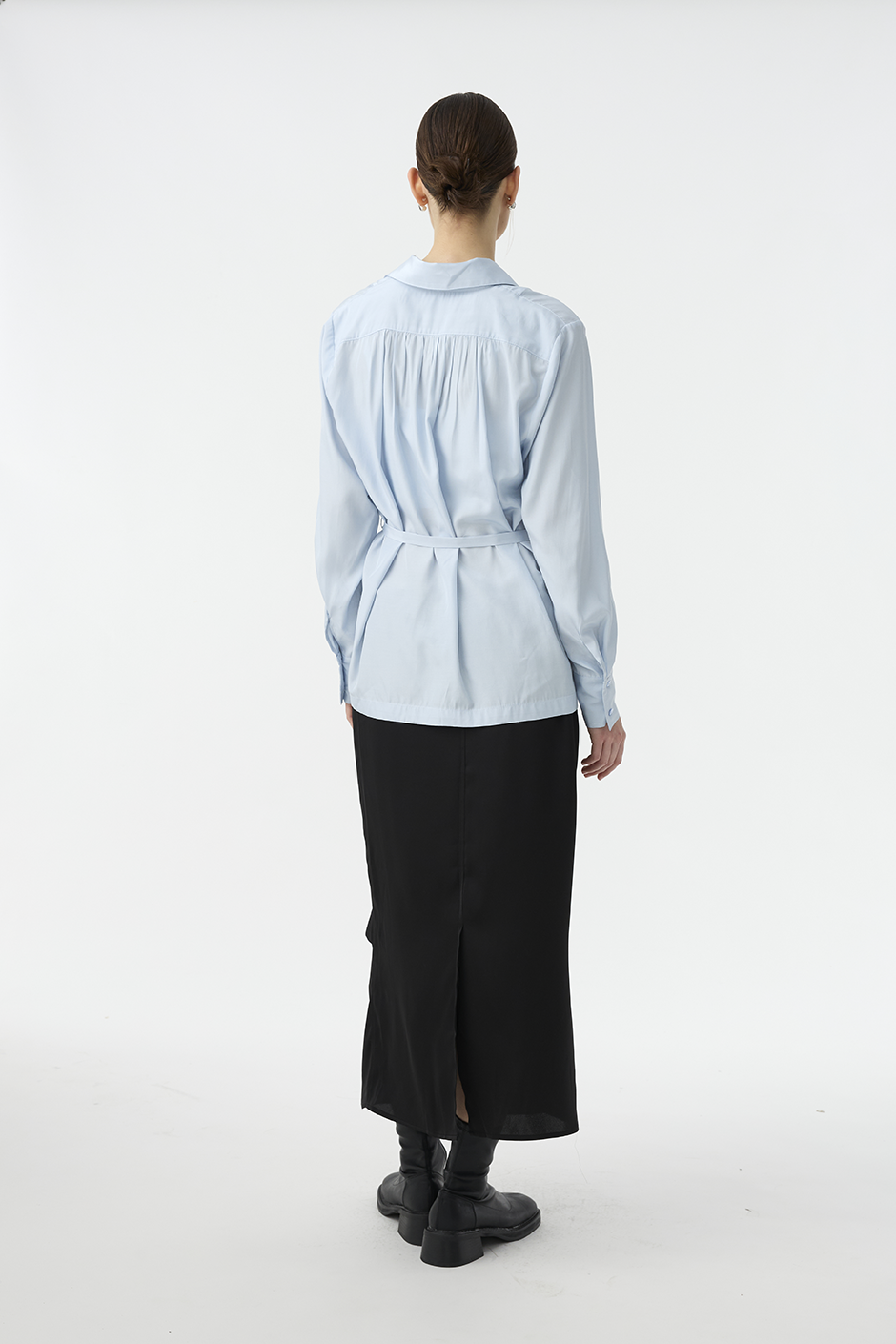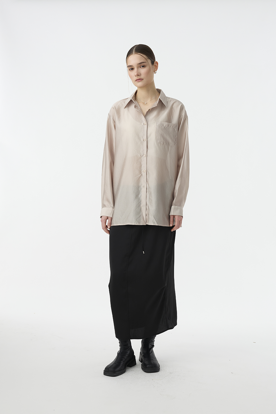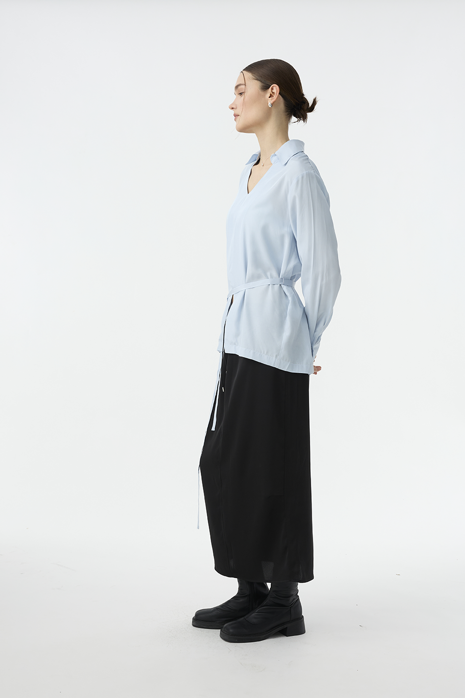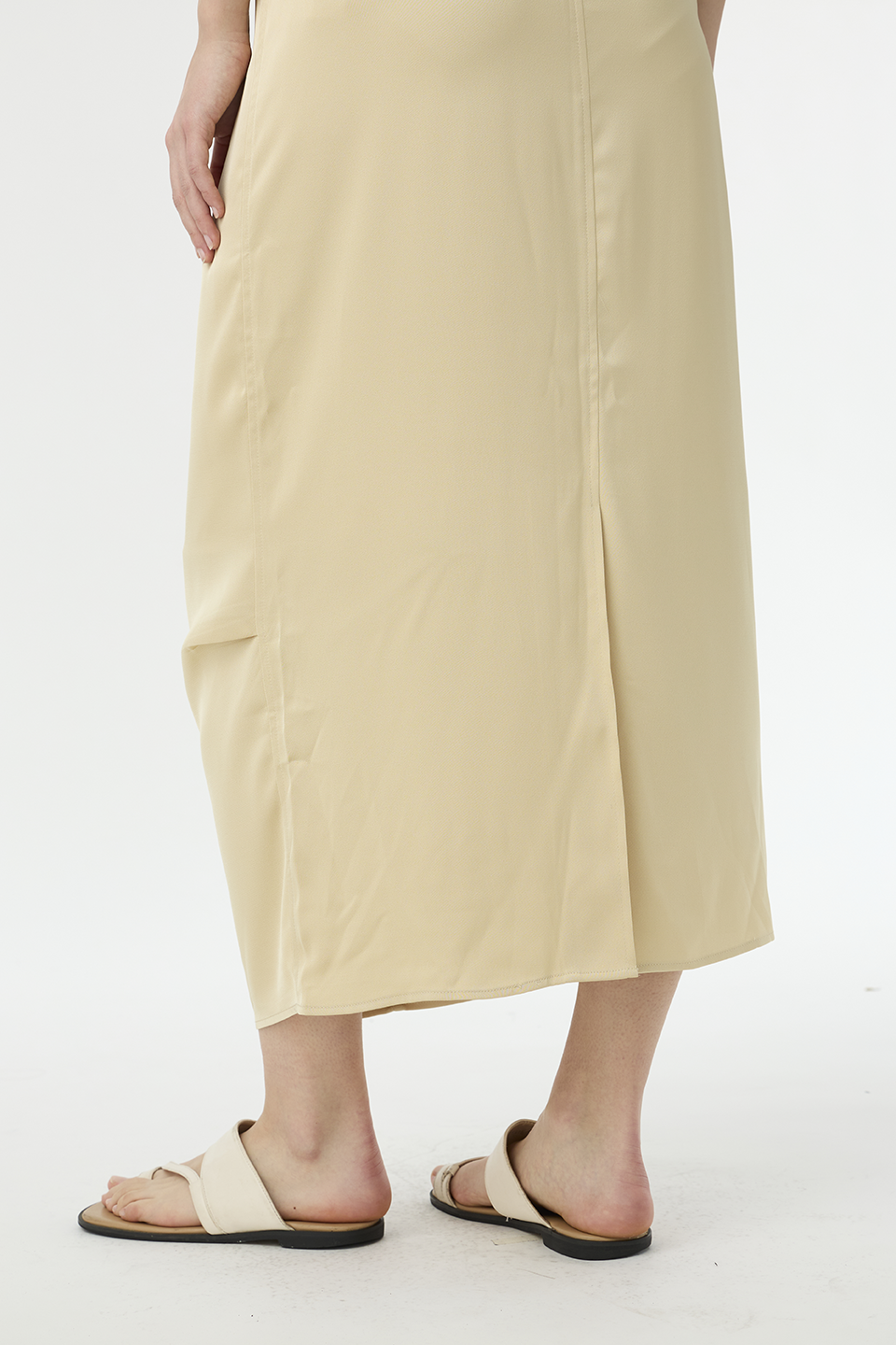 清透光澤面料,讓長裙多了份輕盈感,腰部抽繩設計,讓此單品能夠適應各種腰圍,能夠高腰穿著,也能低腰呈現浪漫感。