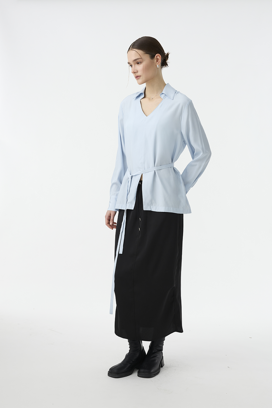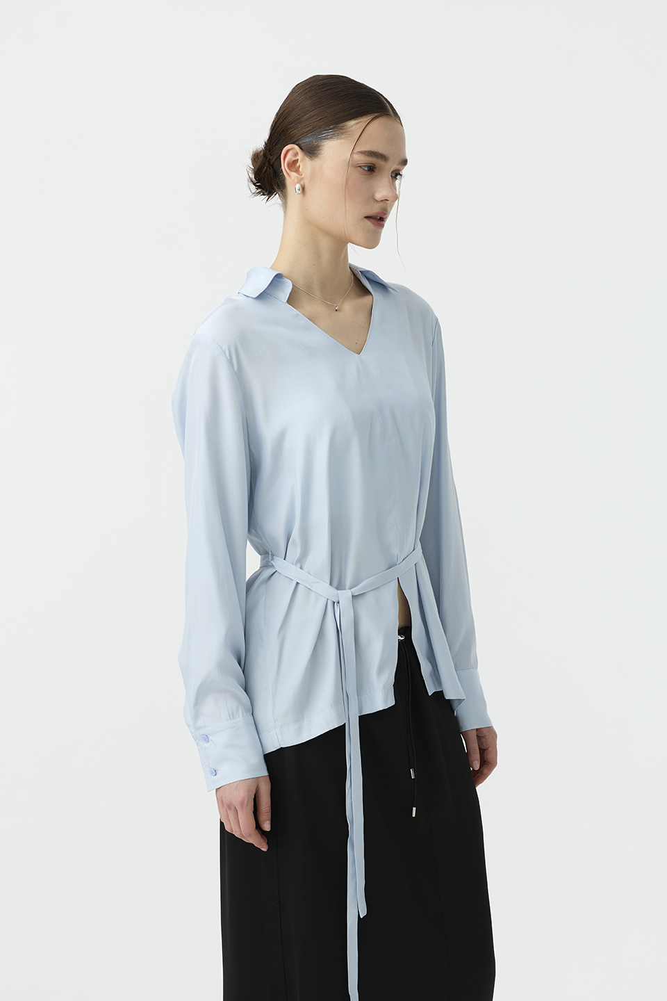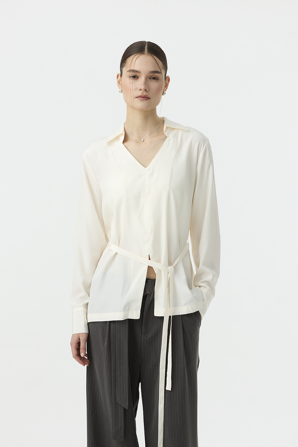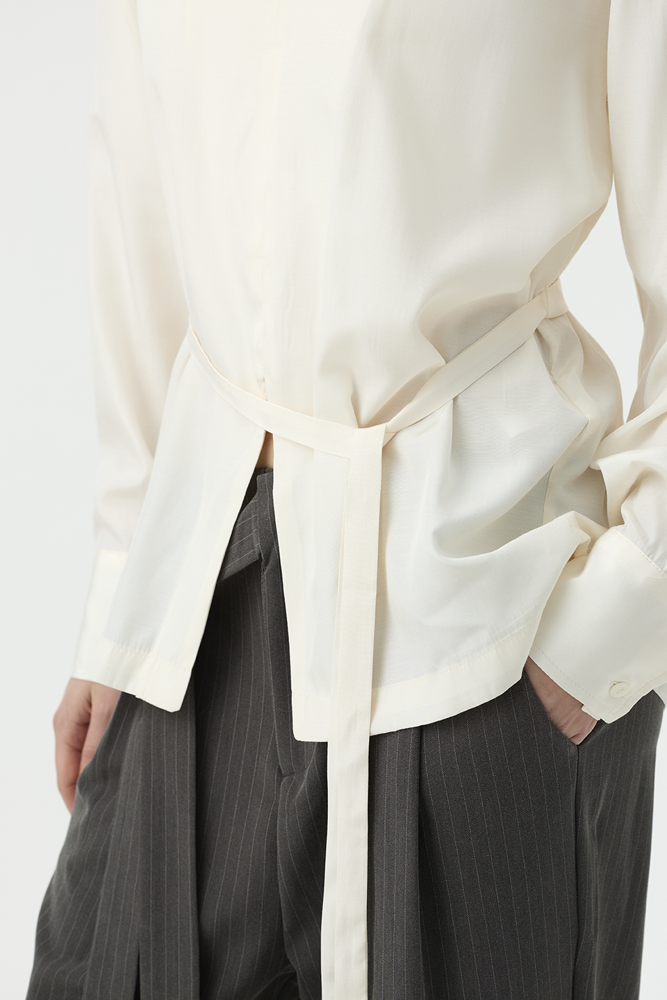 綁帶設計讓腰身突出,可紮進褲內呈現俐落感,也可以放出來綁上緞面腰帶呈現時尚鬆弛感!