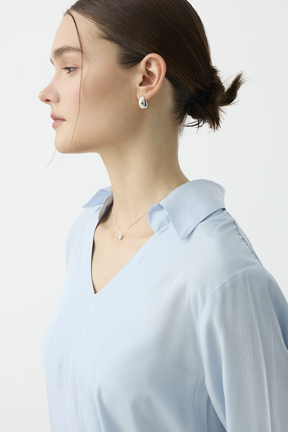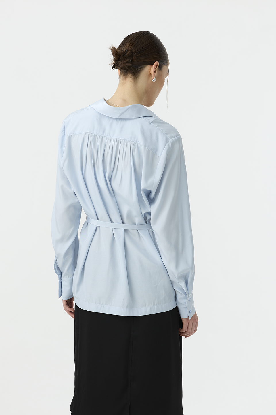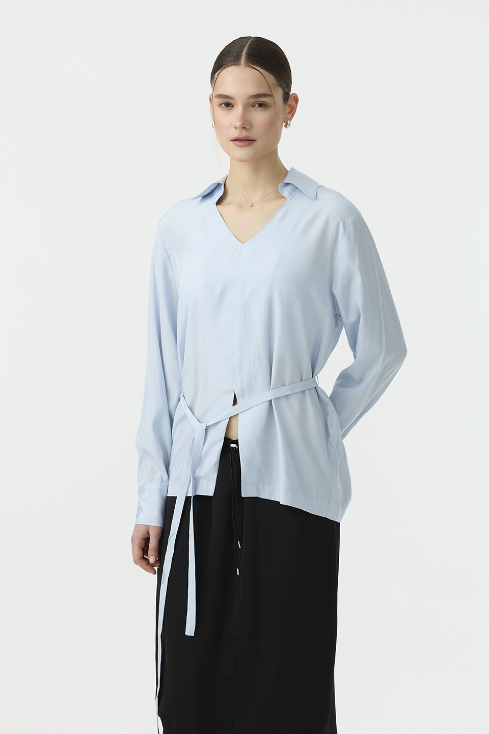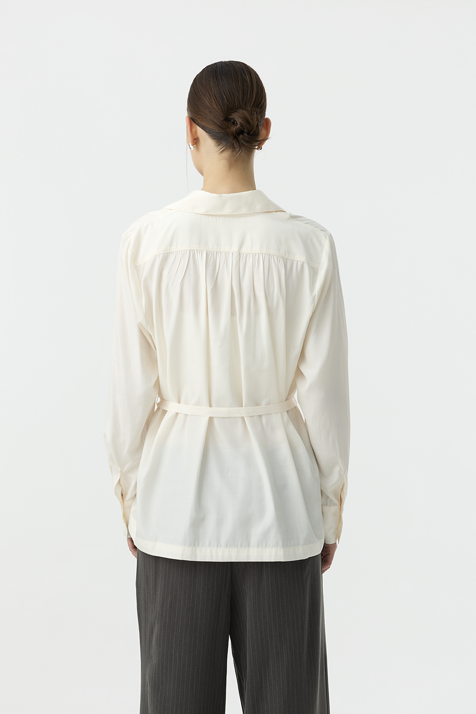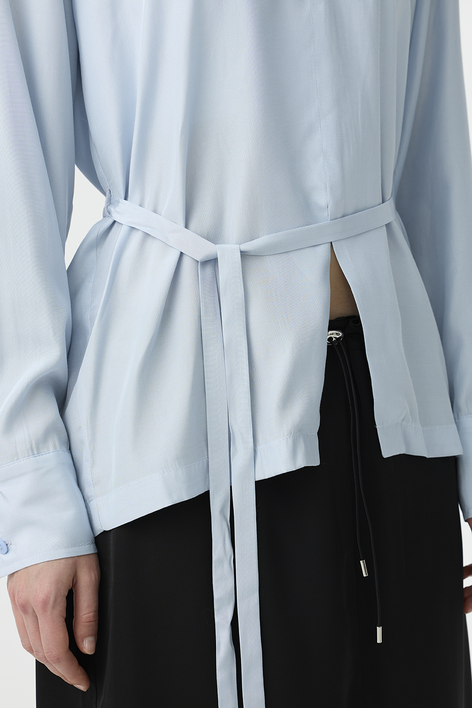 綁帶設計讓腰身突出,可紮進褲內呈現俐落感,也可以放出來綁上緞面腰帶呈現時尚鬆弛感!
