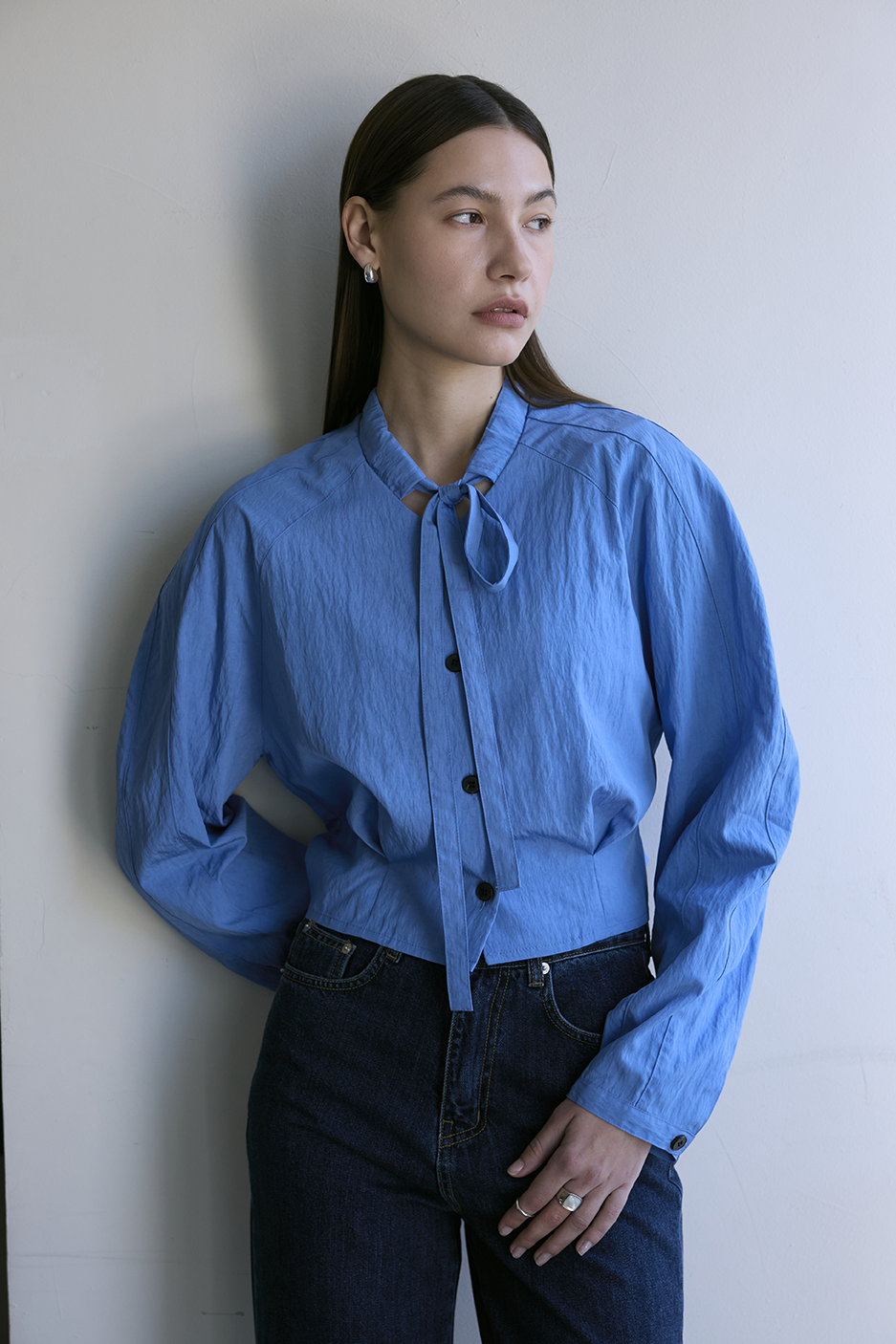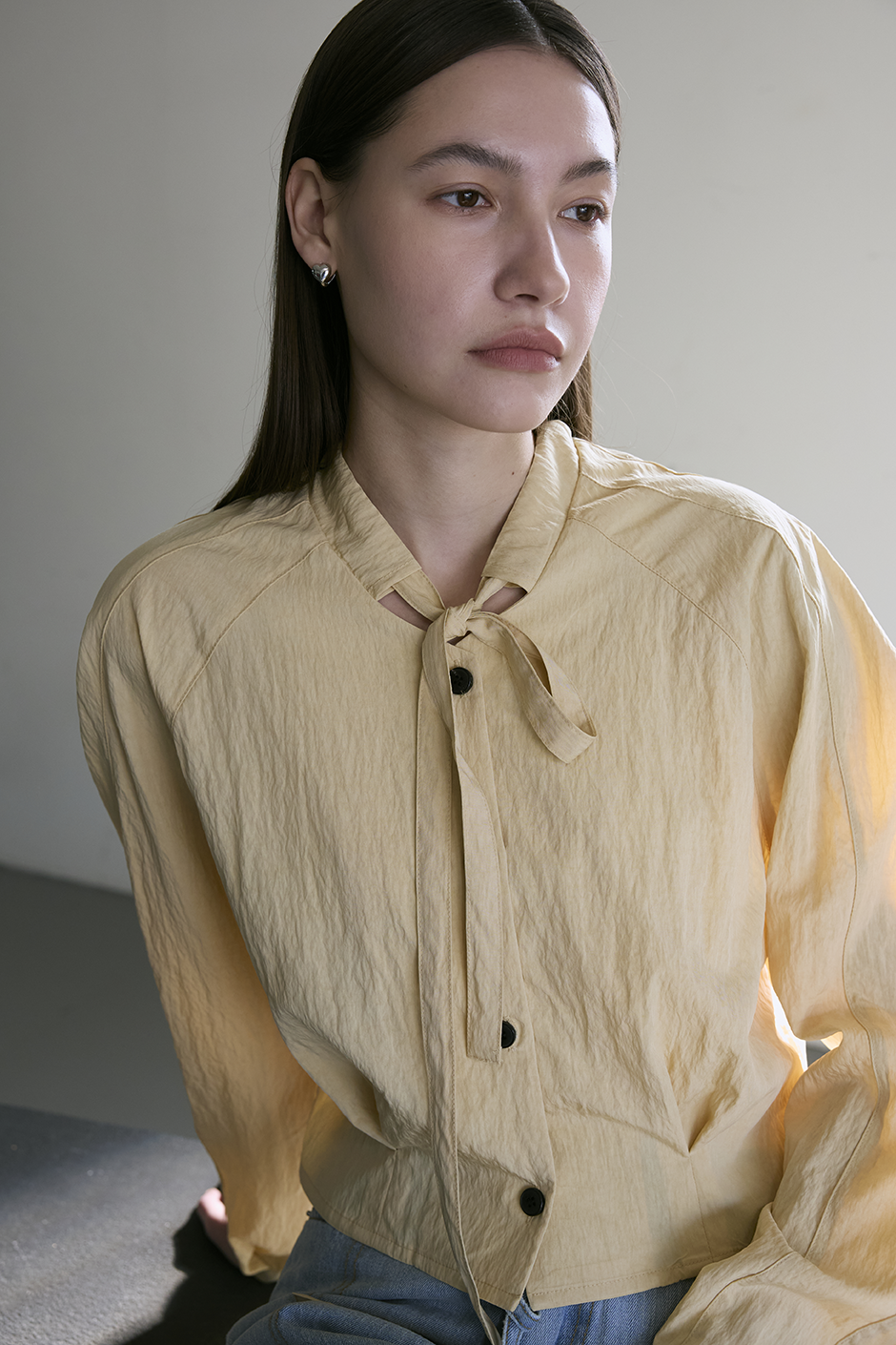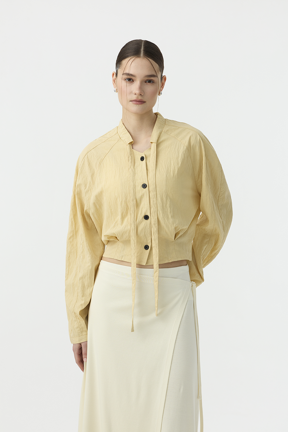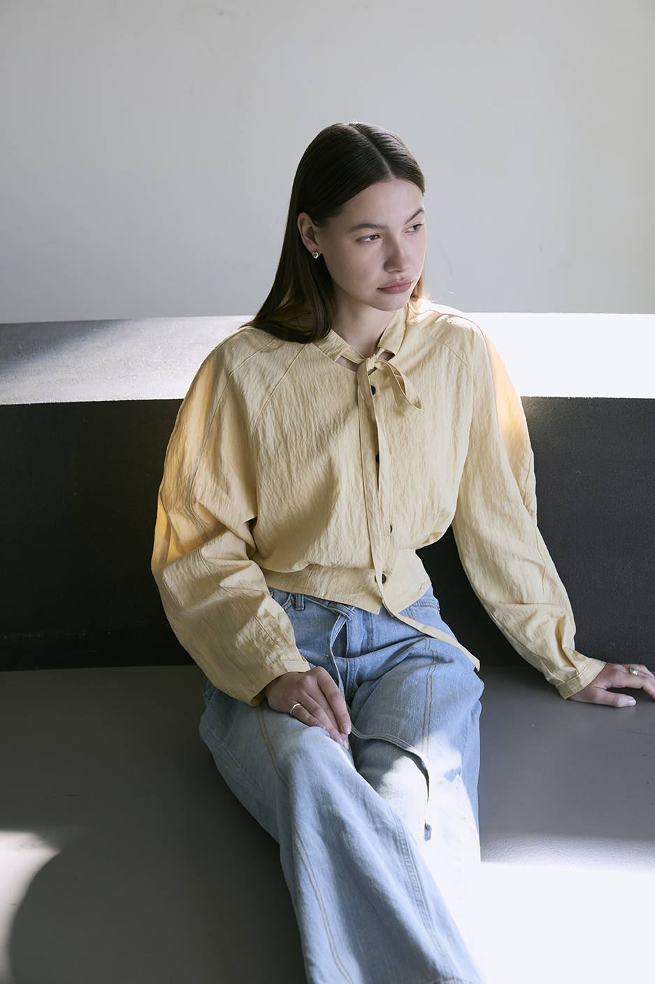 落肩設計,無肩線,微皺輕盈布料是最大的特色,呈現慵懶鬆弛感,綁帶點綴及短版設計讓視覺身形更加修長!