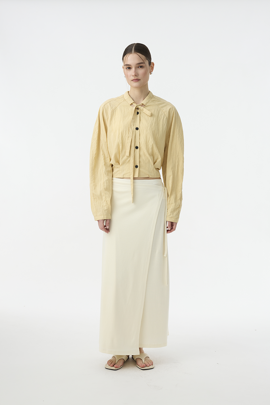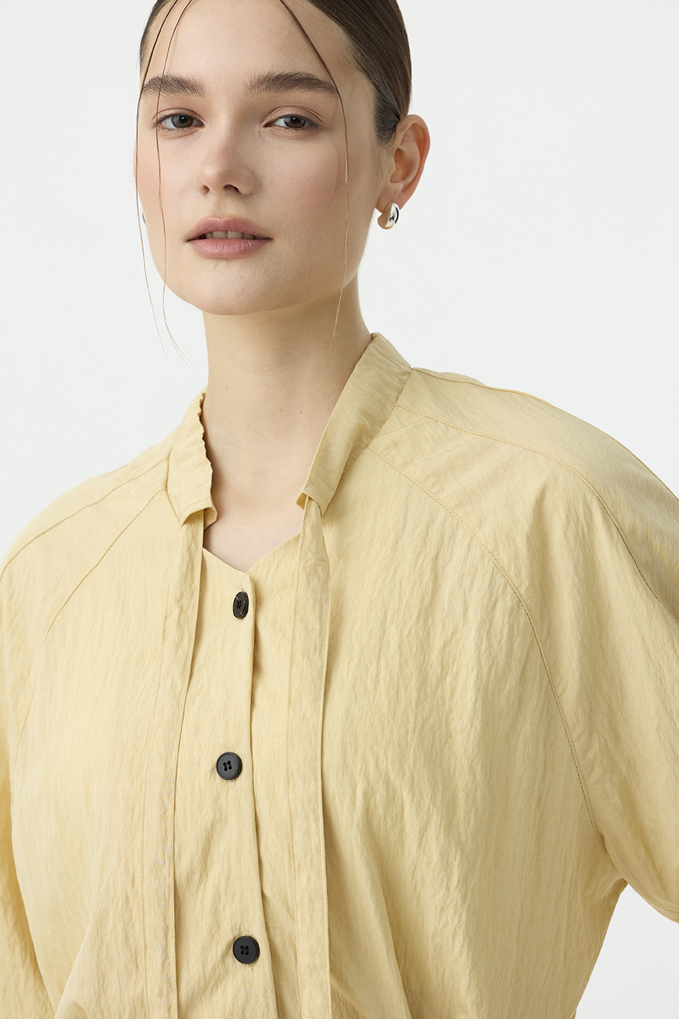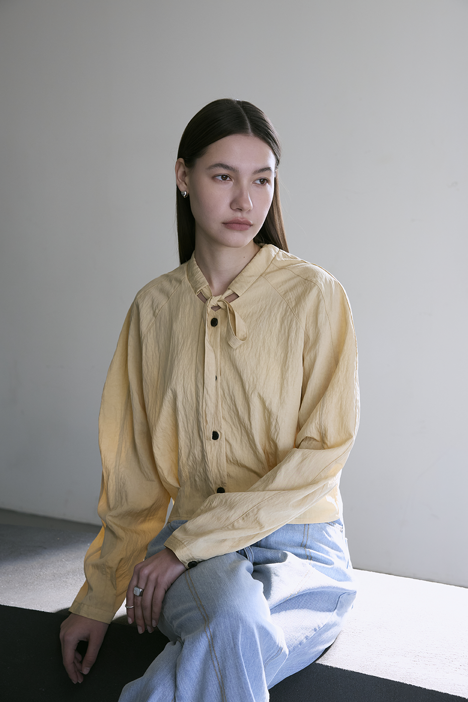 落肩設計,無肩線,微皺輕盈布料是最大的特色,呈現慵懶鬆弛感,綁帶點綴及短版設計讓視覺身形更加修長!