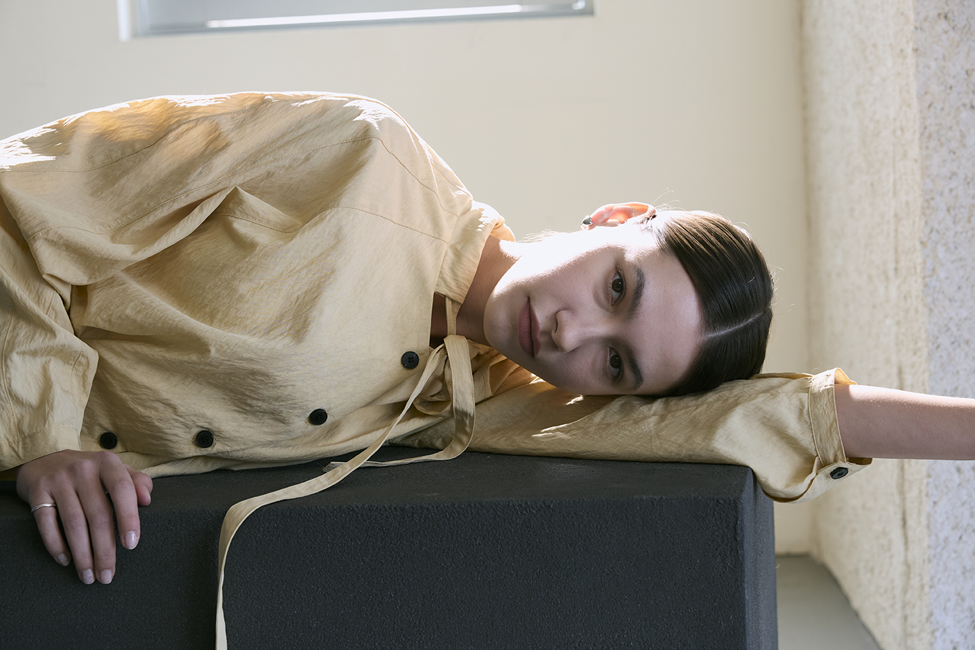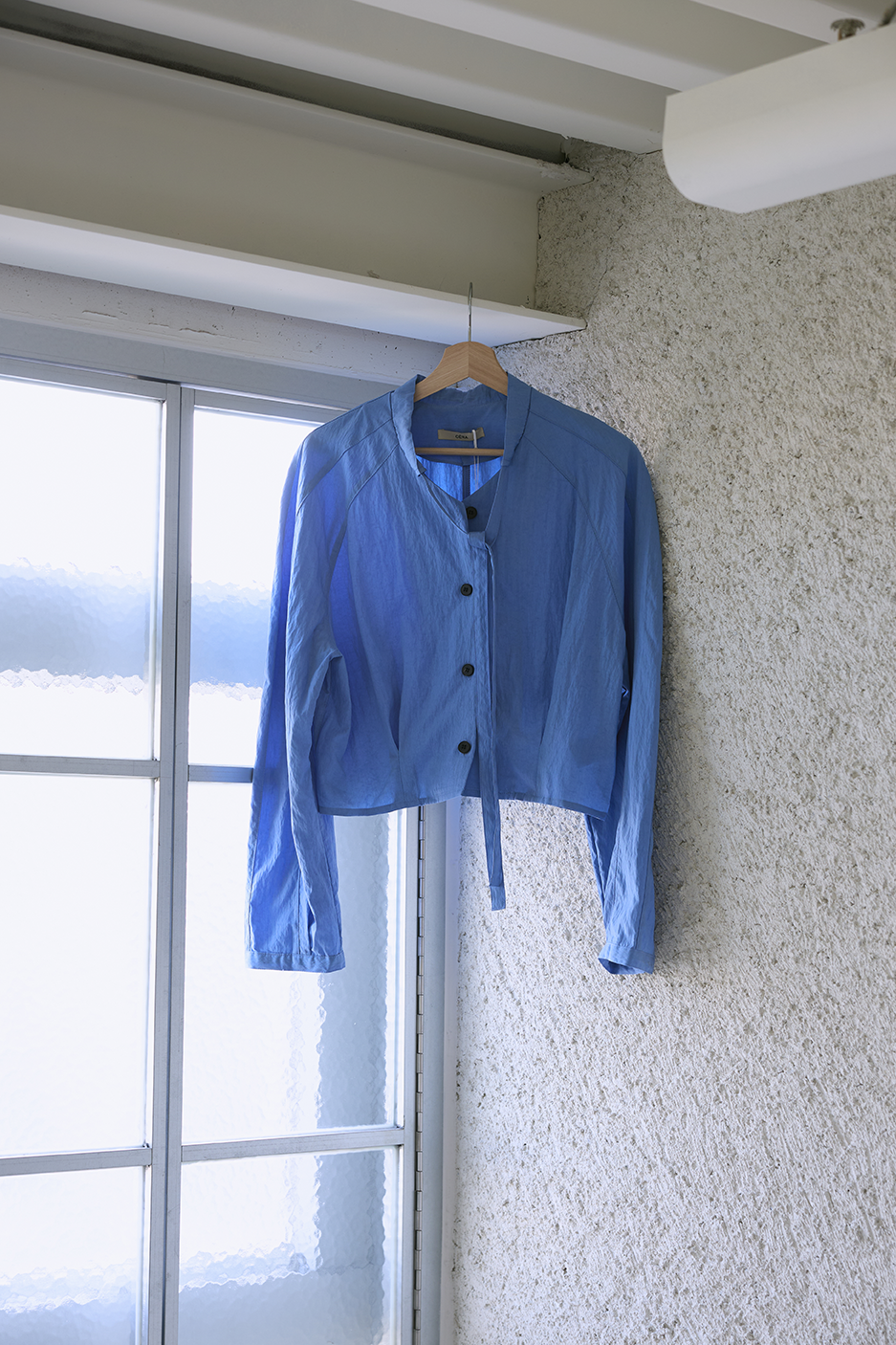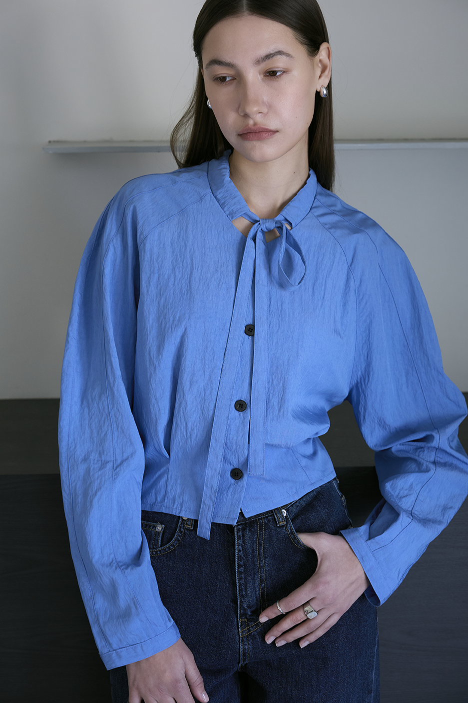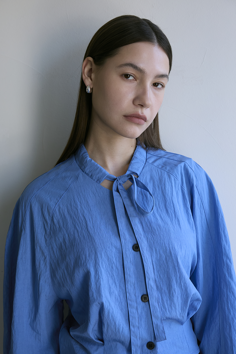 落肩設計,無肩線,微皺輕盈布料是最大的特色,呈現慵懶鬆弛感,綁帶點綴及短版設計讓視覺身形更加修長!