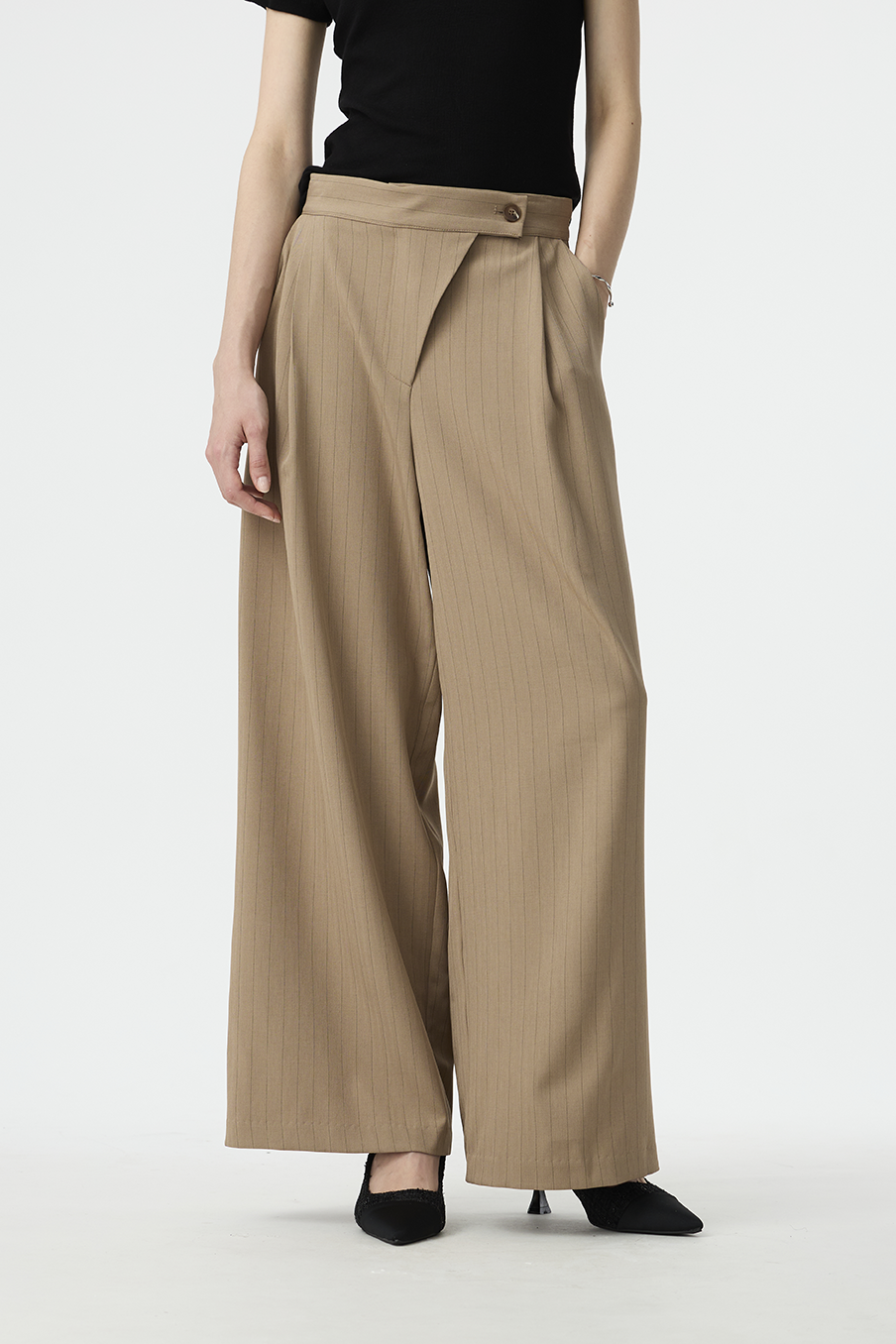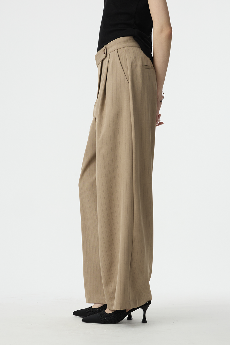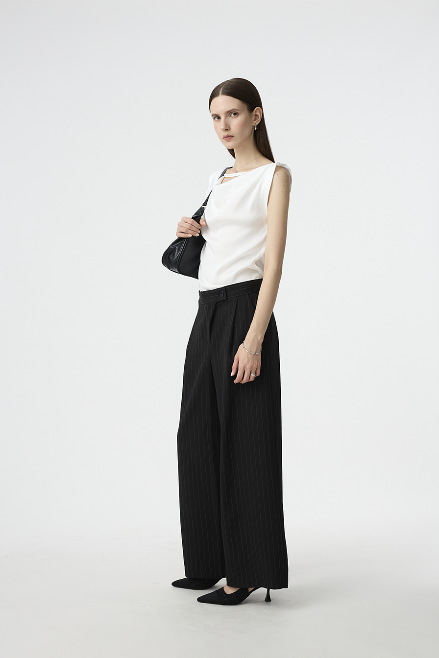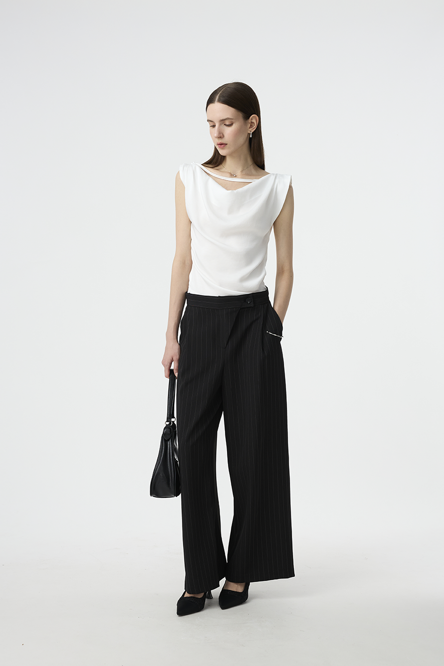 以結構線條勾勒現代女性的率性輪廓,這款寬褲採用不對稱腰封設計,營造錯視層次,結合細緻的垂直細條紋與俐落褶線,打造俐落又有造型感的下身單品!