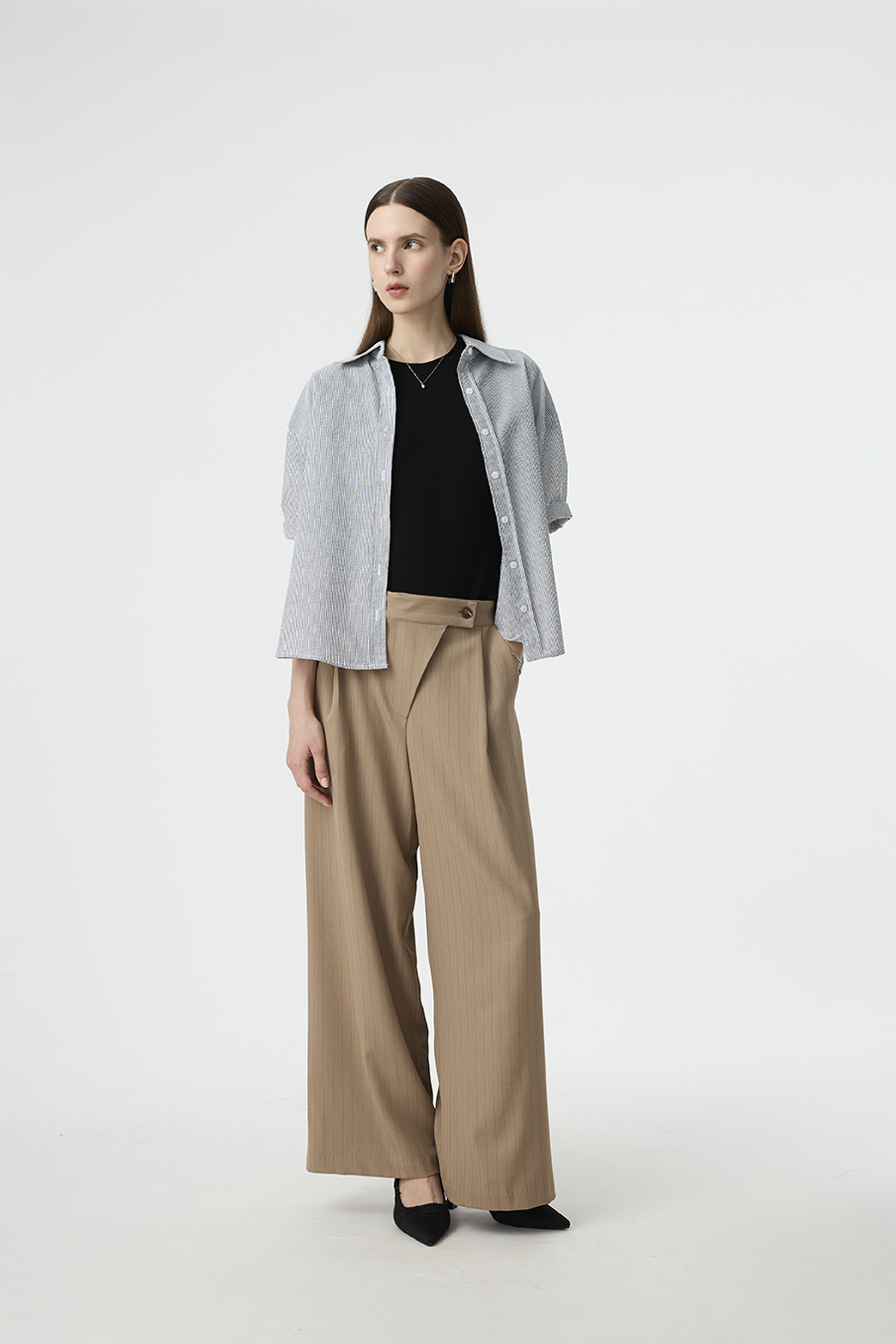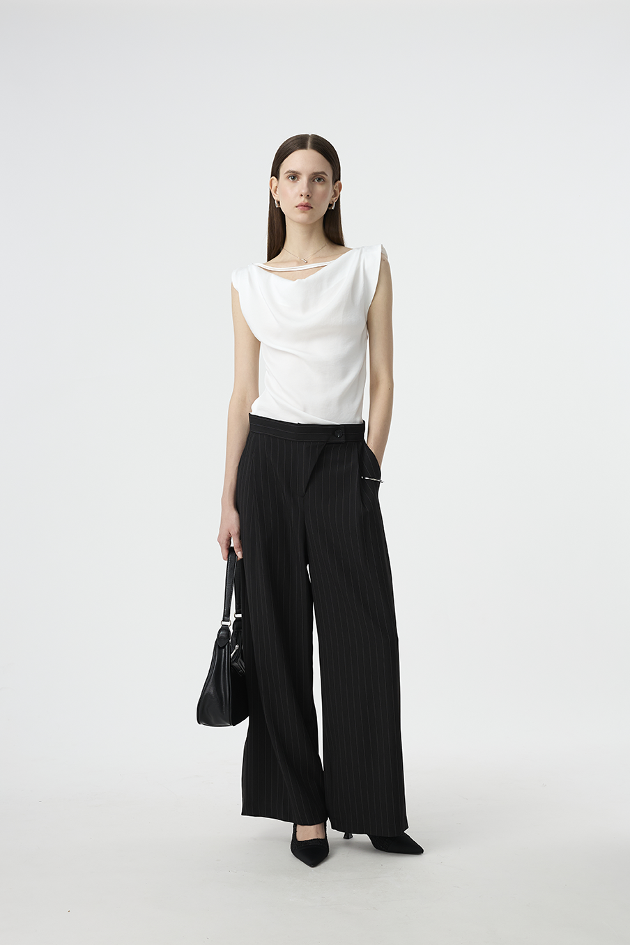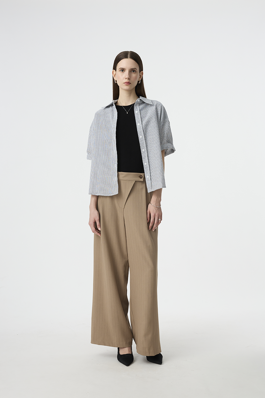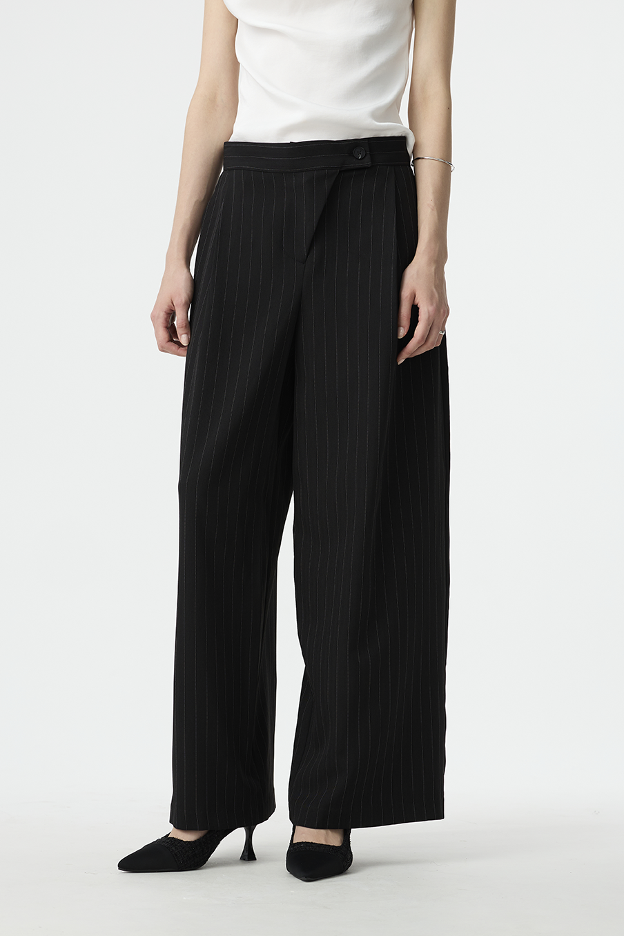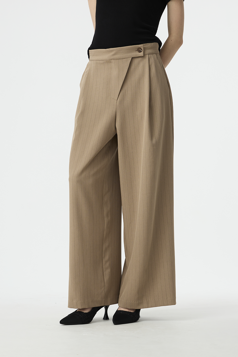 以結構線條勾勒現代女性的率性輪廓,這款寬褲採用不對稱腰封設計,營造錯視層次,結合細緻的垂直細條紋與俐落褶線,打造俐落又有造型感的下身單品!