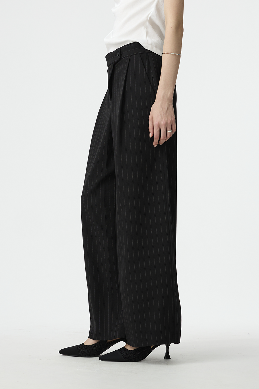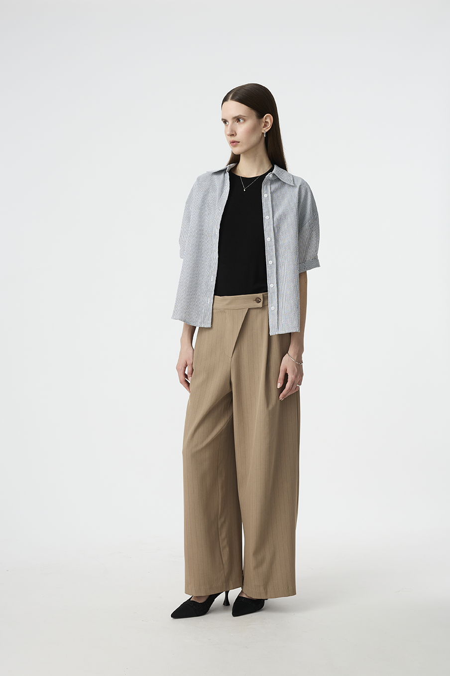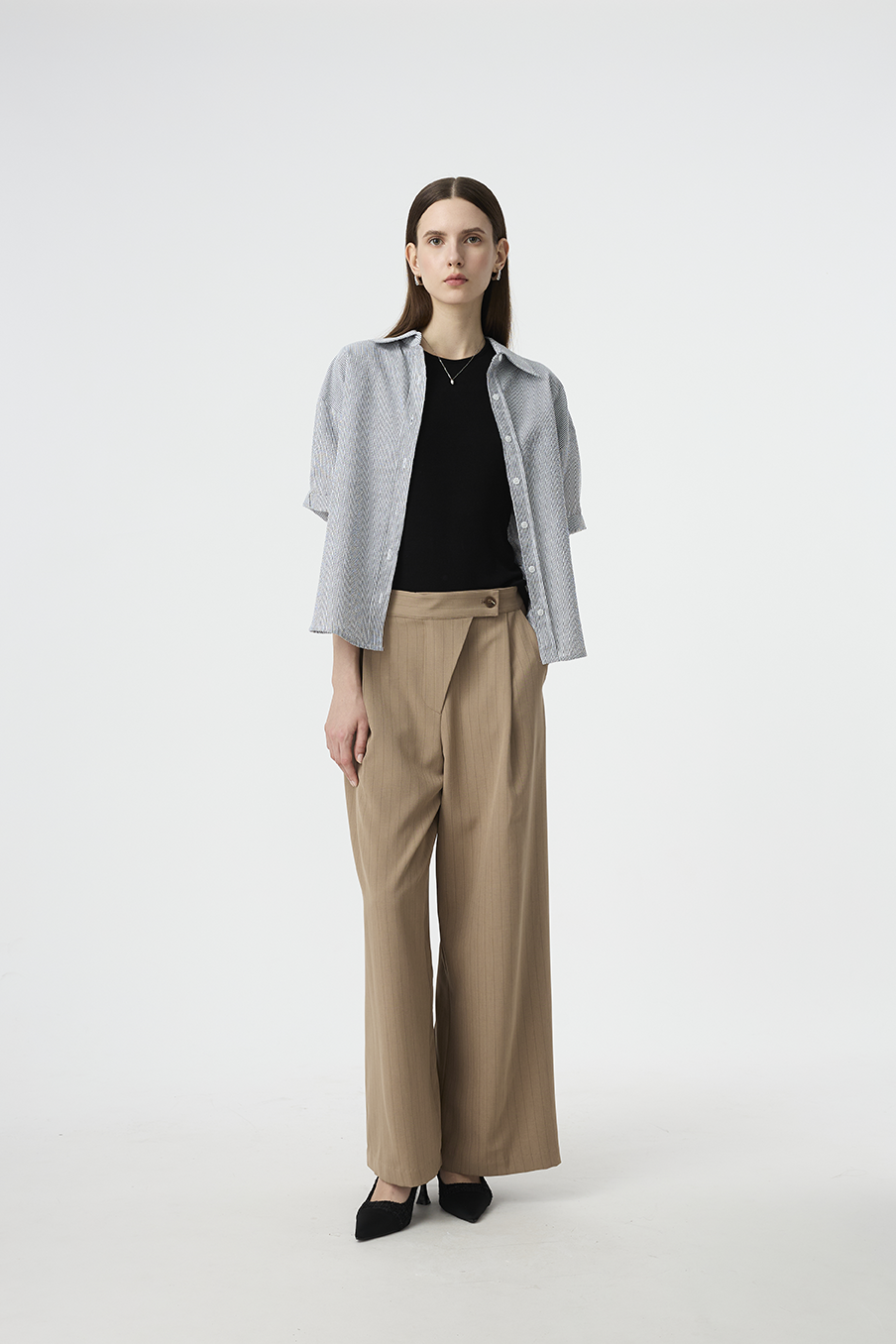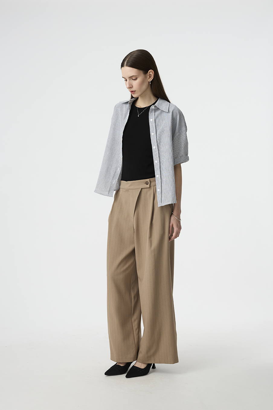 以結構線條勾勒現代女性的率性輪廓,這款寬褲採用不對稱腰封設計,營造錯視層次,結合細緻的垂直細條紋與俐落褶線,打造俐落又有造型感的下身單品!