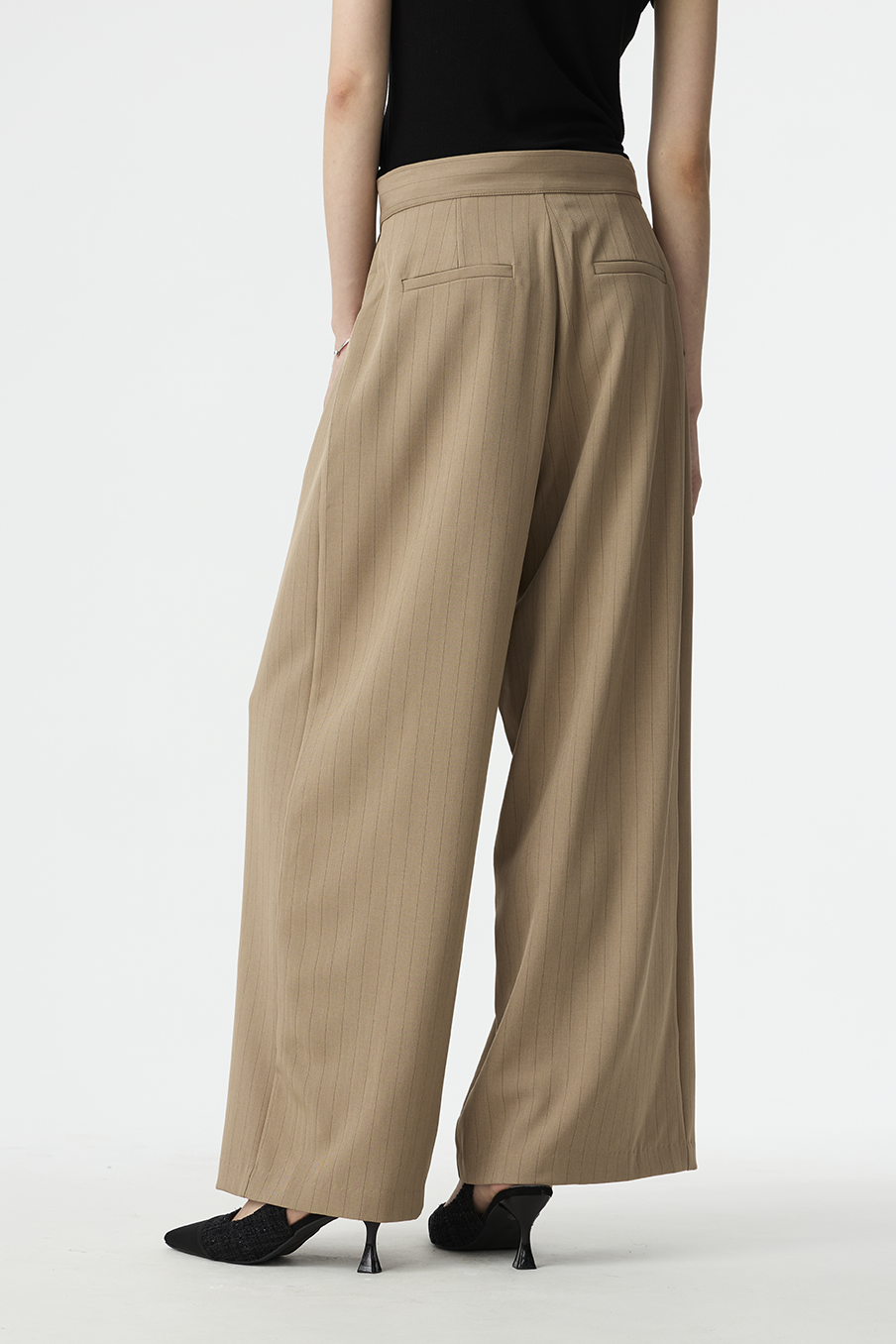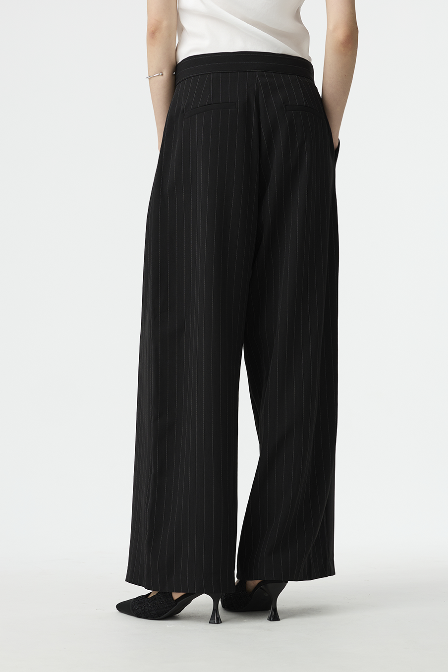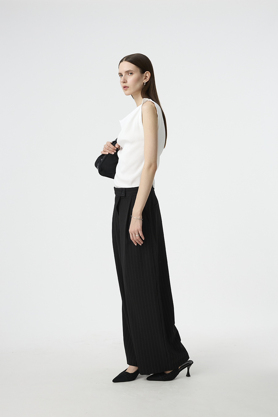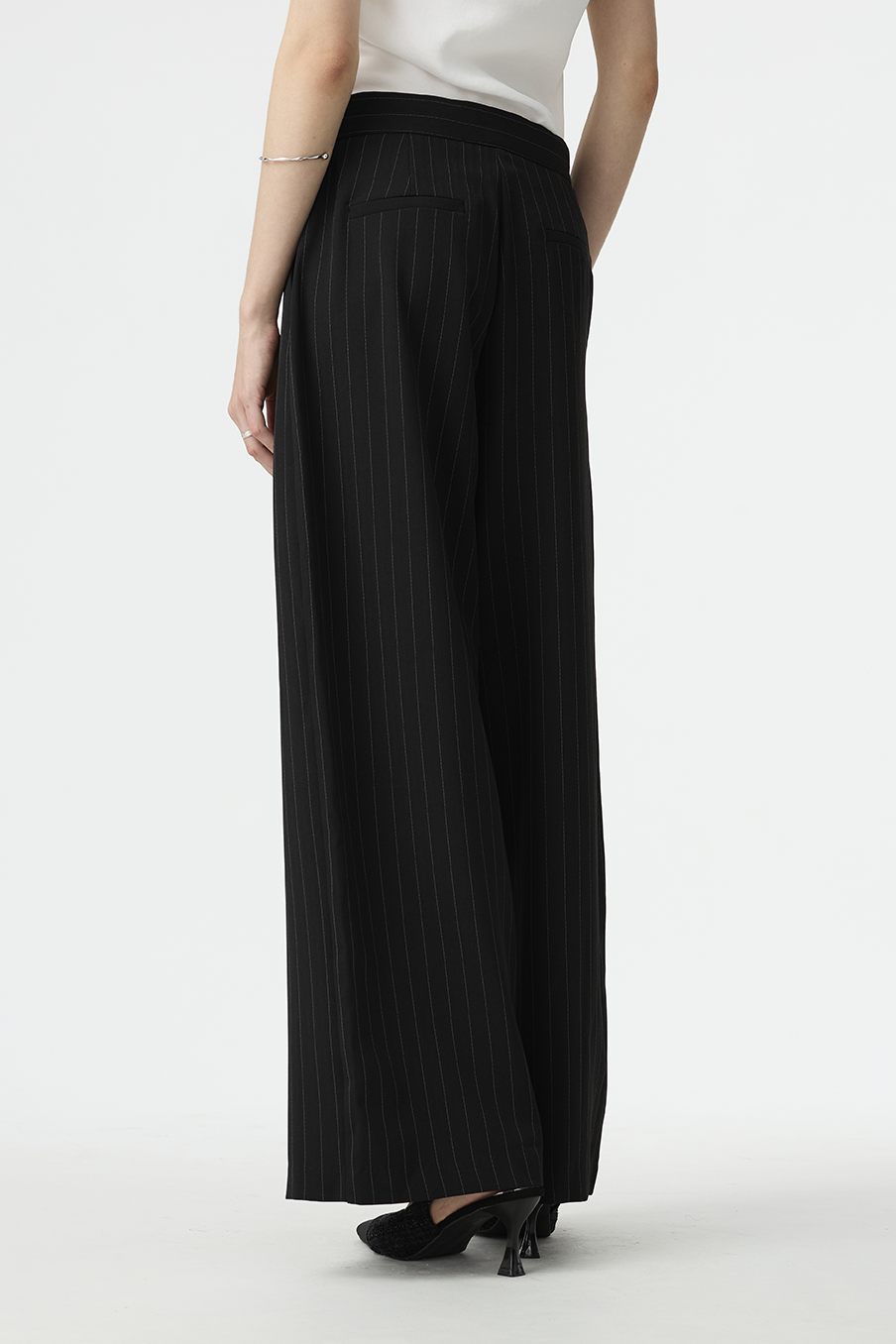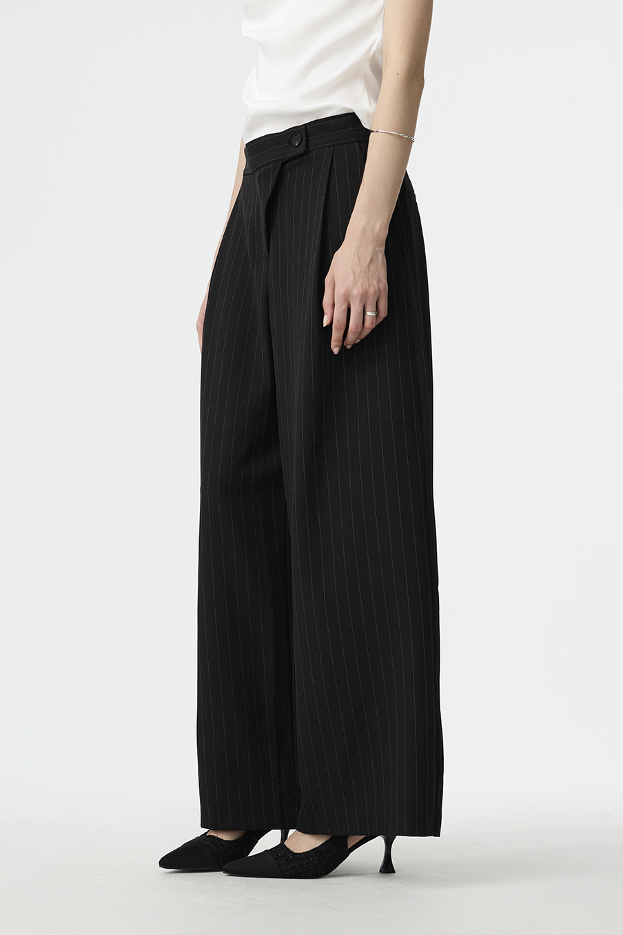 以結構線條勾勒現代女性的率性輪廓,這款寬褲採用不對稱腰封設計,營造錯視層次,結合細緻的垂直細條紋與俐落褶線,打造俐落又有造型感的下身單品!