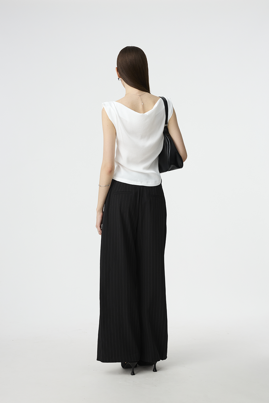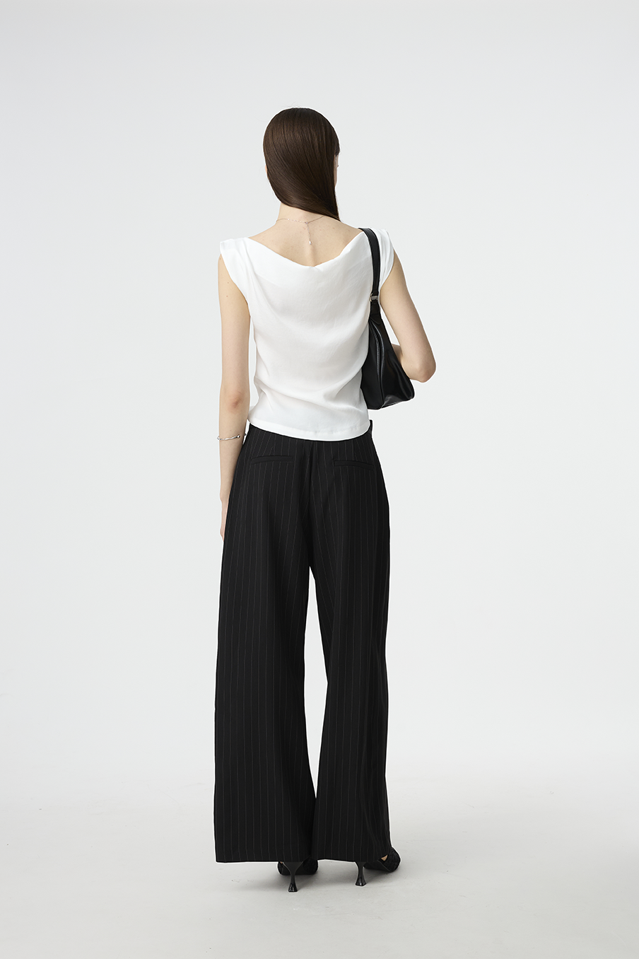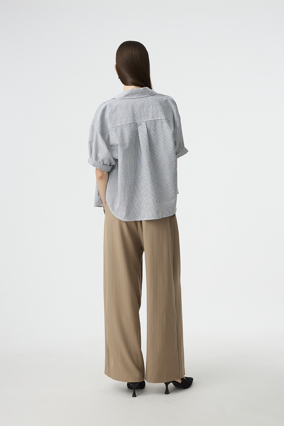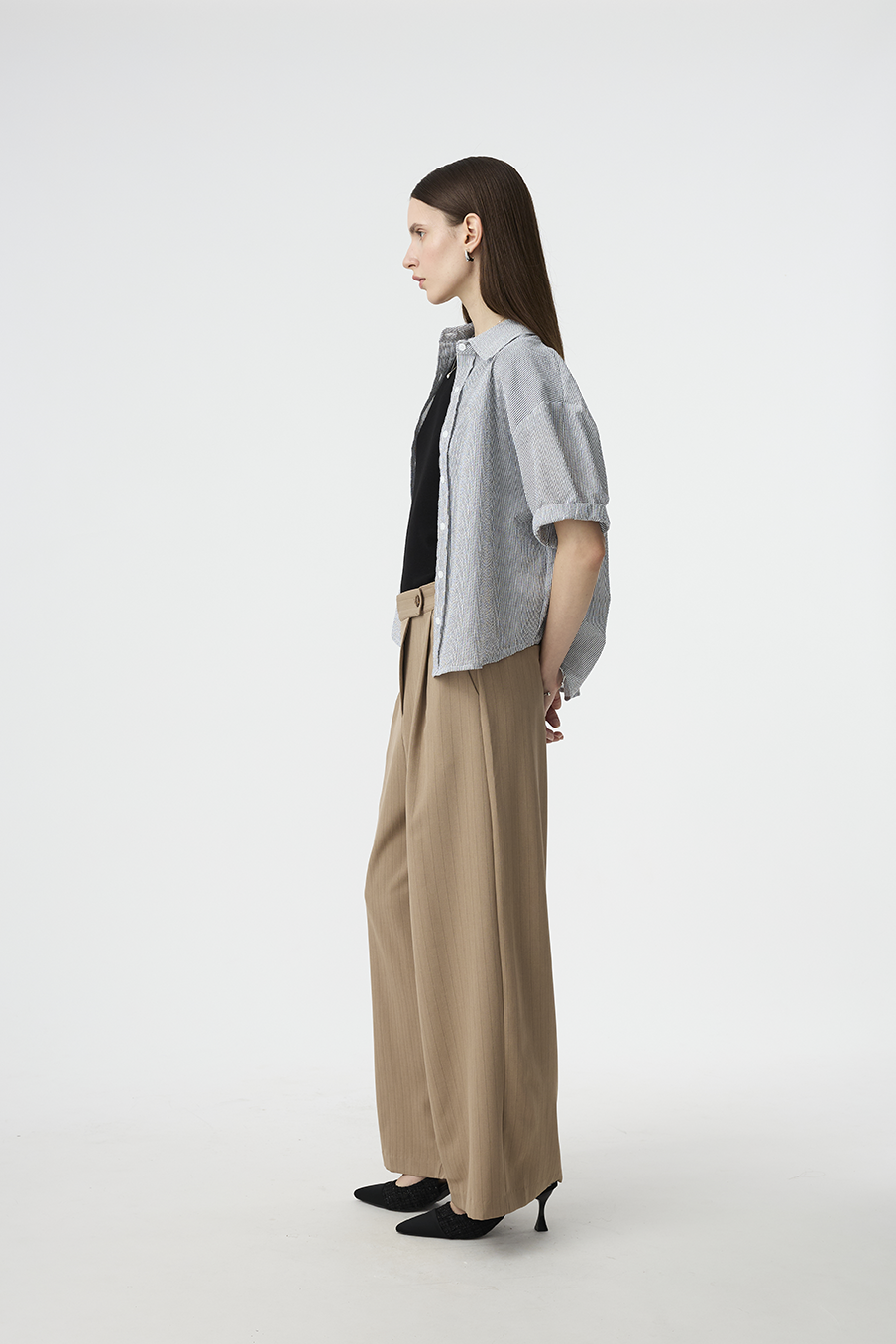 以結構線條勾勒現代女性的率性輪廓,這款寬褲採用不對稱腰封設計,營造錯視層次,結合細緻的垂直細條紋與俐落褶線,打造俐落又有造型感的下身單品!
