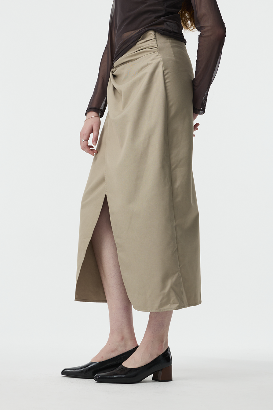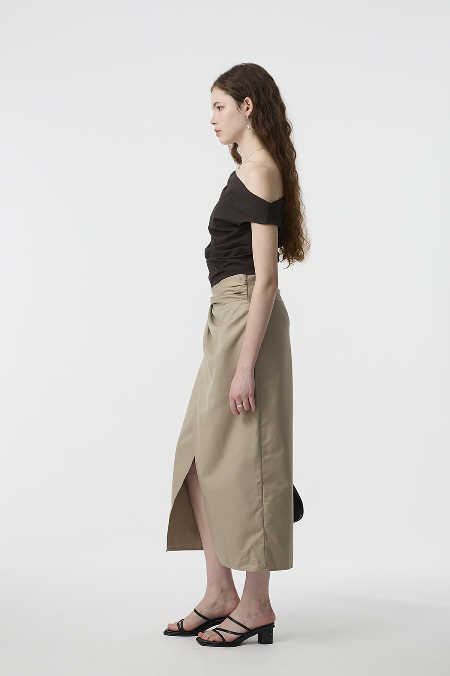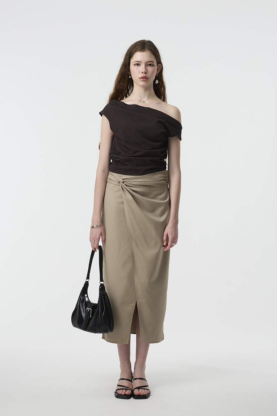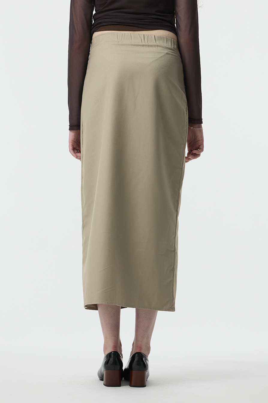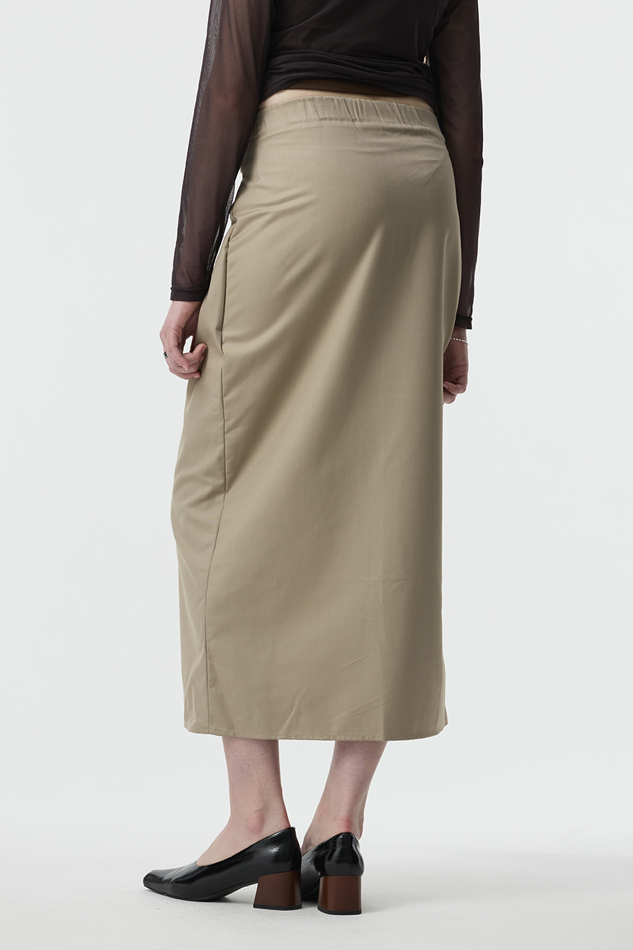 中長裙長度展現成熟俐落氛圍,前開衩設計在行走間散發率性氣息。
