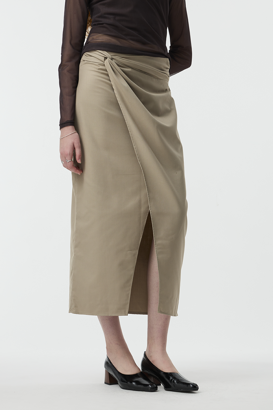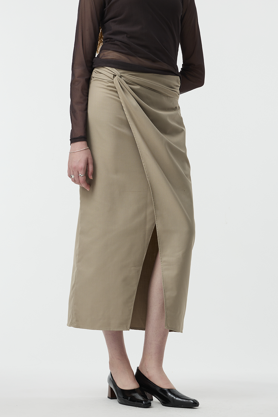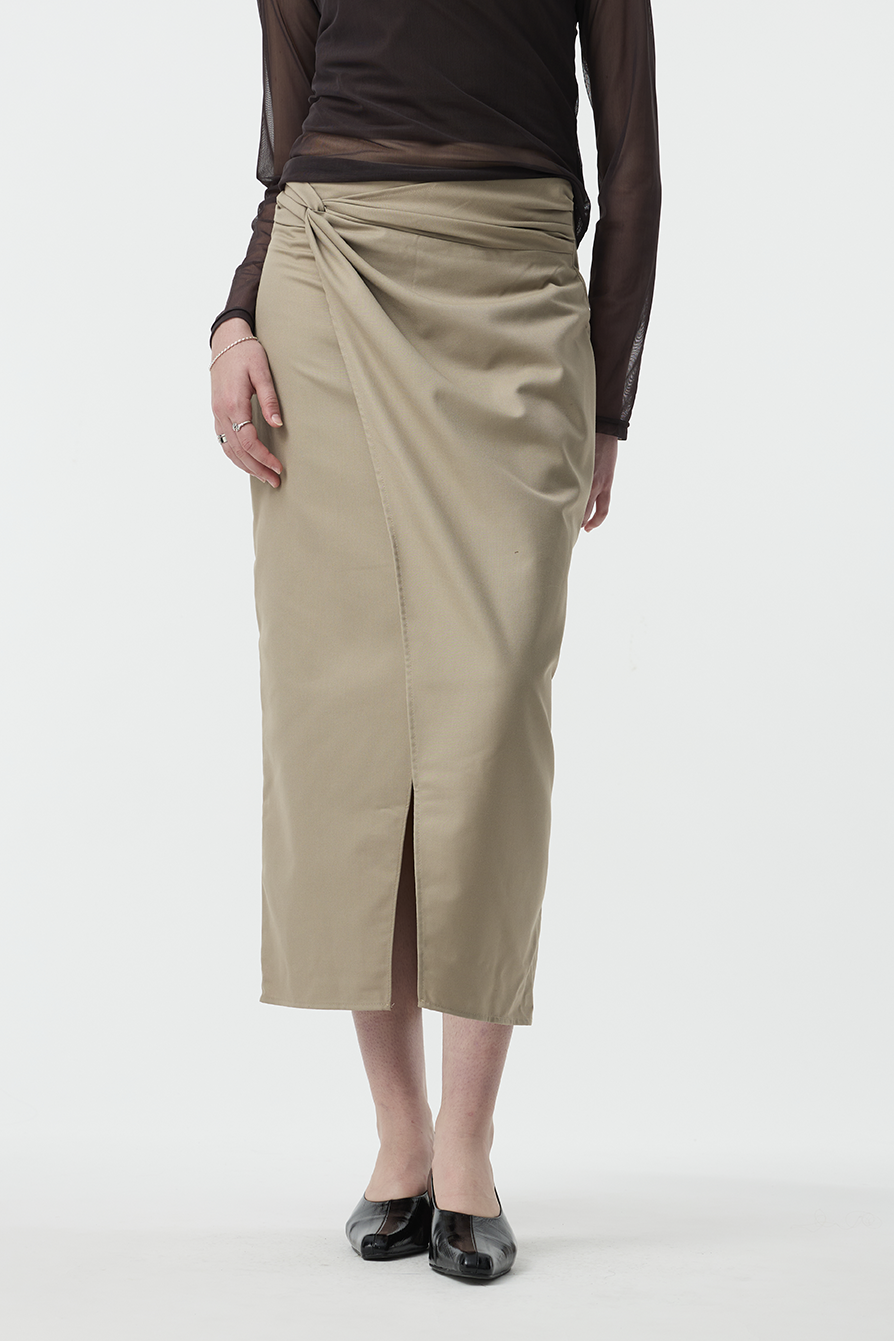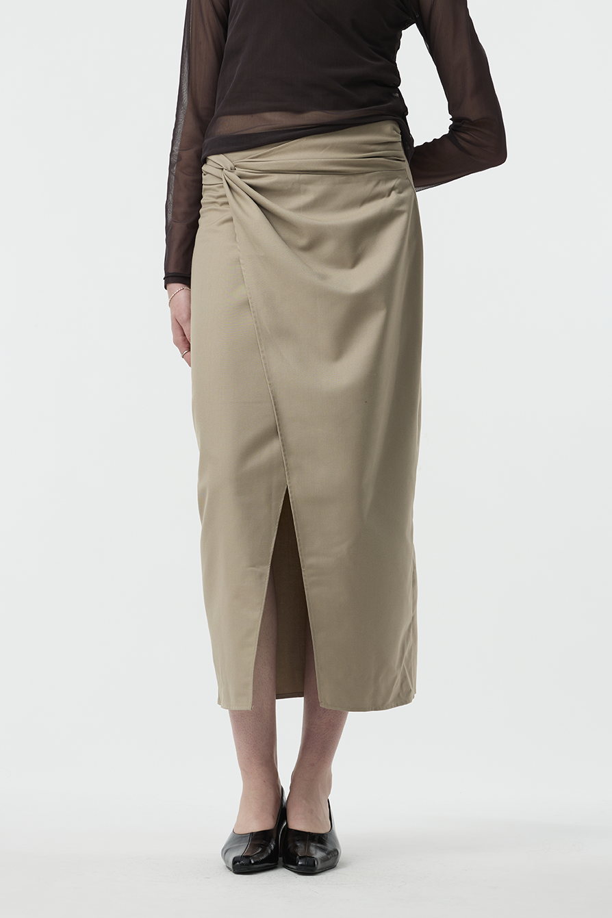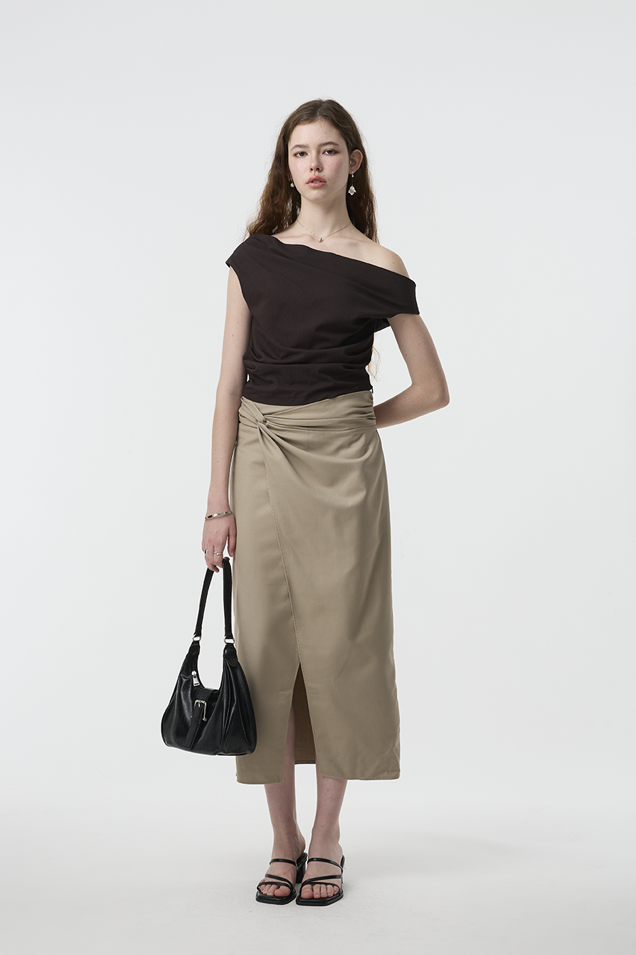 中長裙長度展現成熟俐落氛圍,前開衩設計在行走間散發率性氣息。