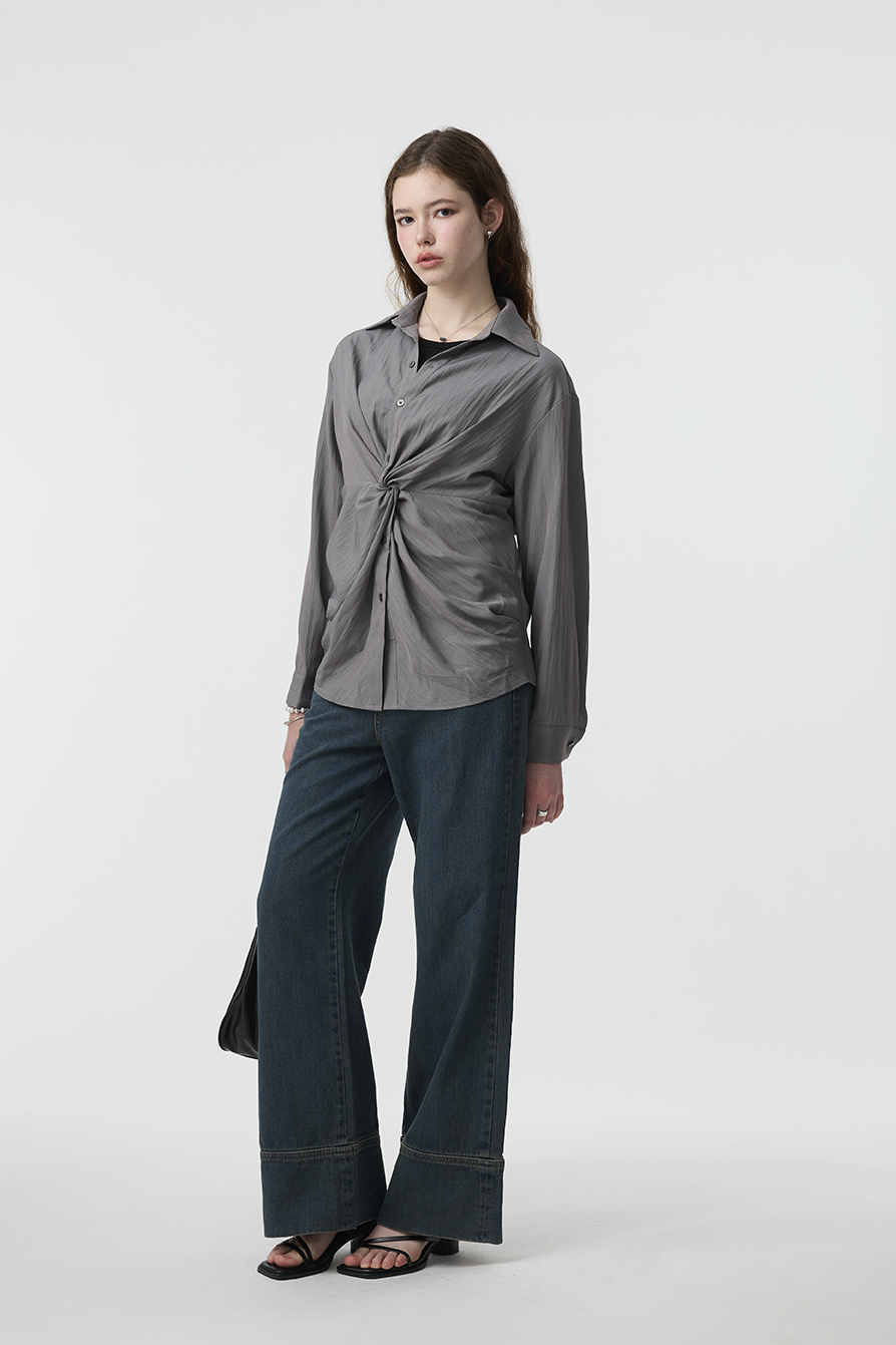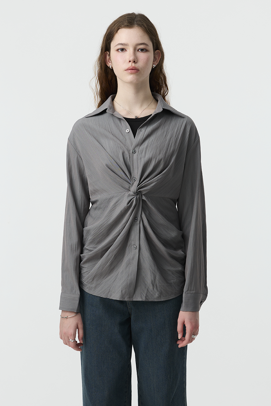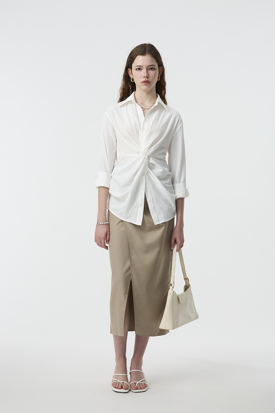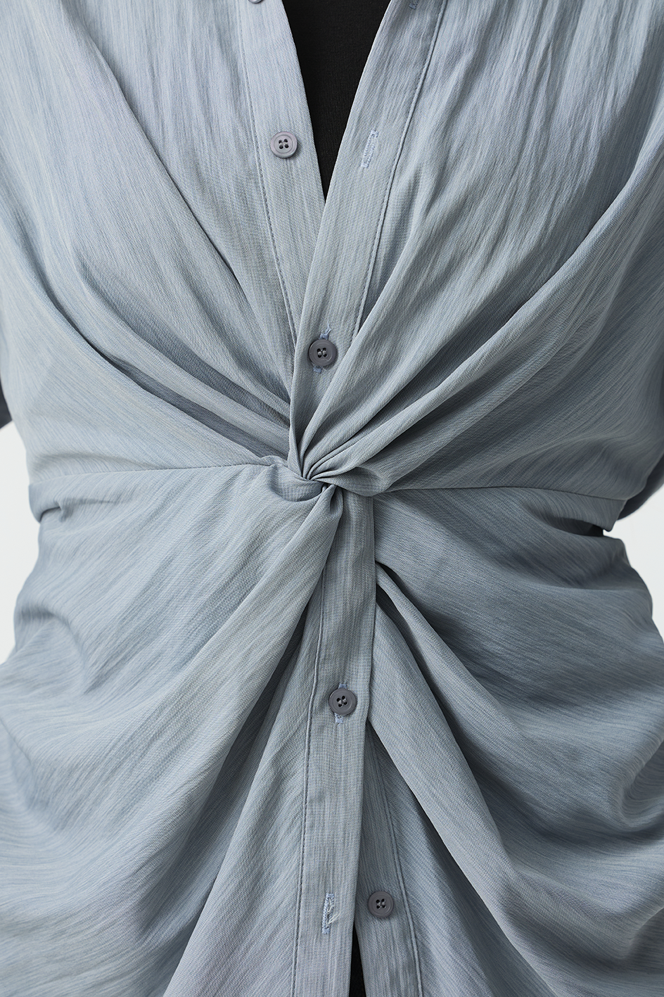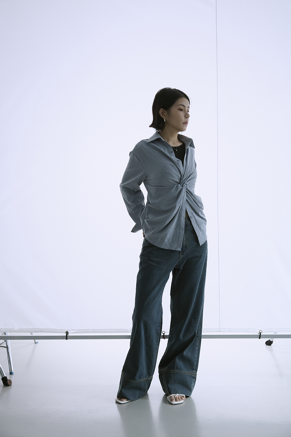 以俐落剪裁搭配前中扭結設計,巧妙修飾身形比例,展現低調卻獨特的時尚態度!