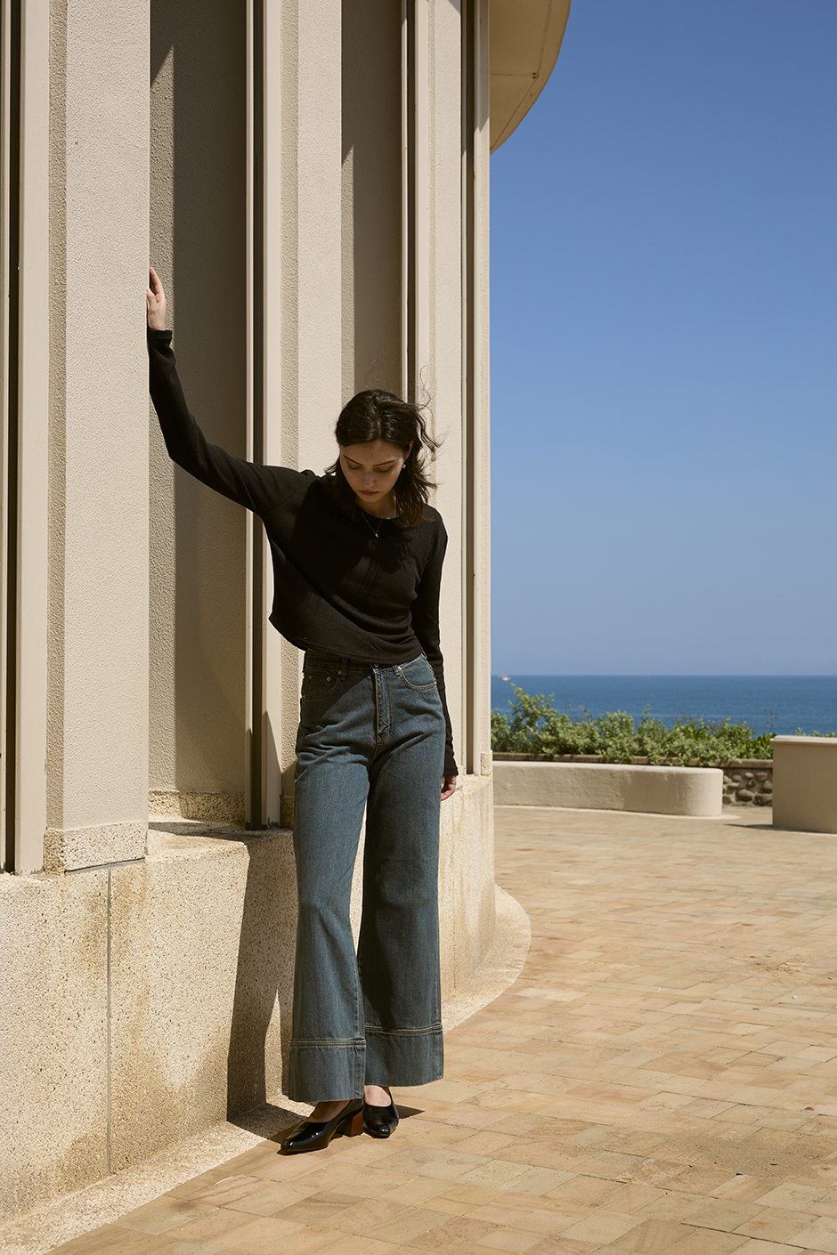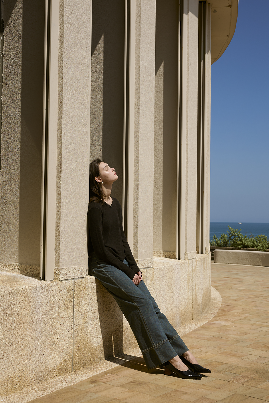 自然垂墜的布料光澤在光影下呈現柔和光感,展現秋冬極簡美學,後方有品牌刺繡設計