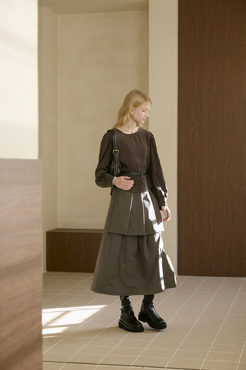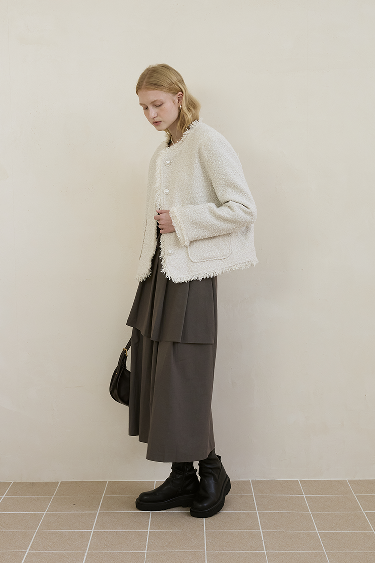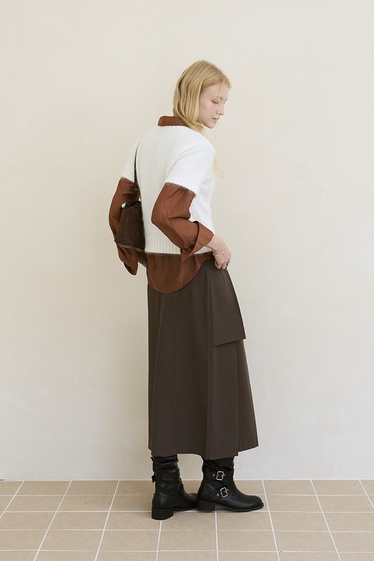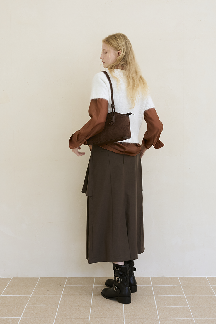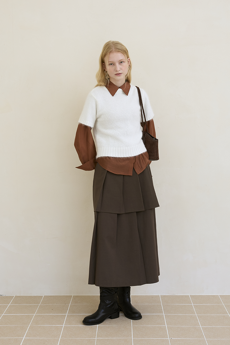 這件長裙以 雙層錯落式摺片結構 做出層次感,下擺自然展開時帶有份量與柔軟弧度,