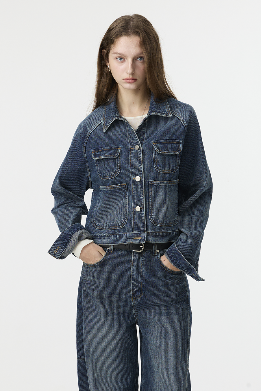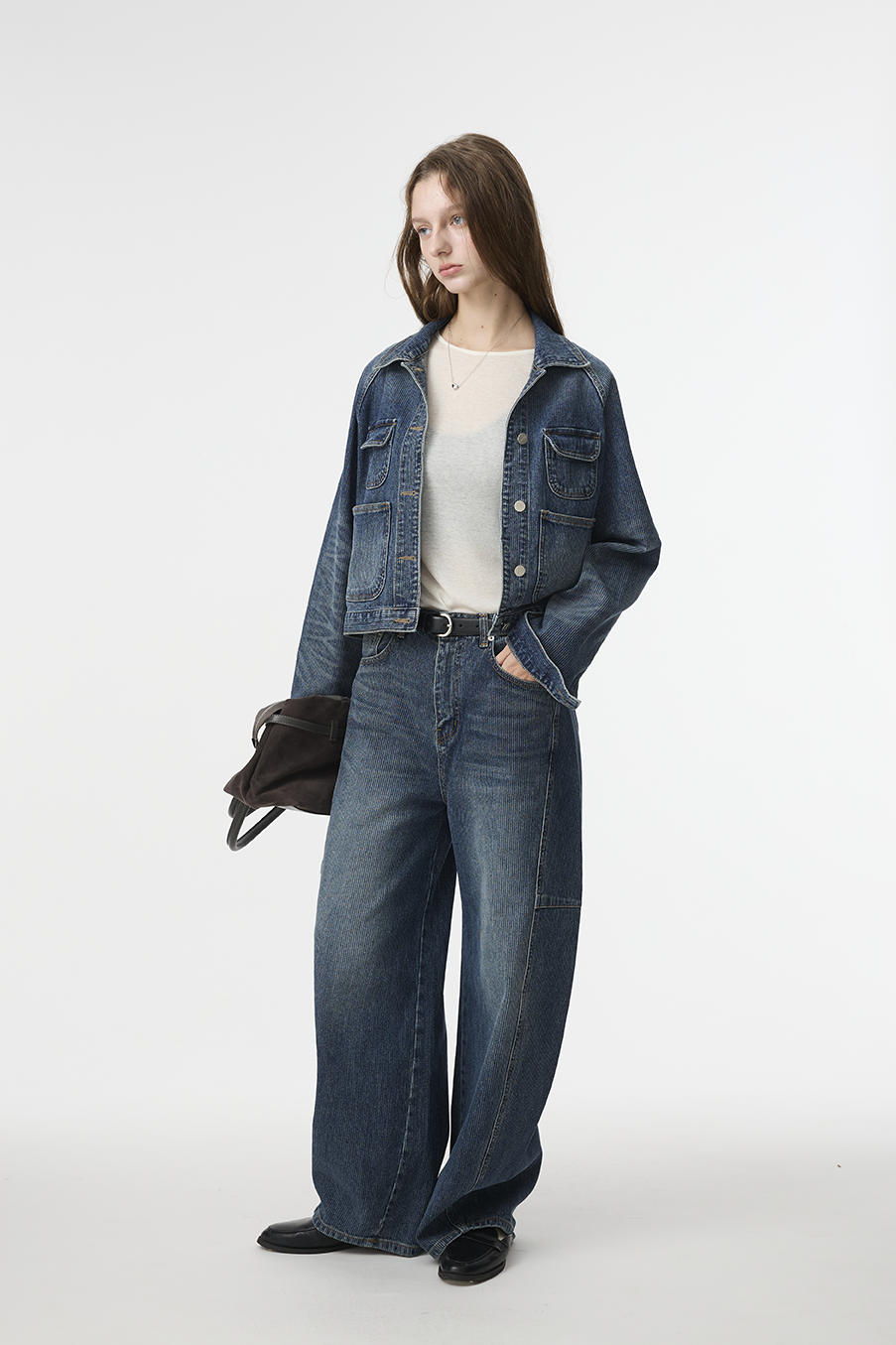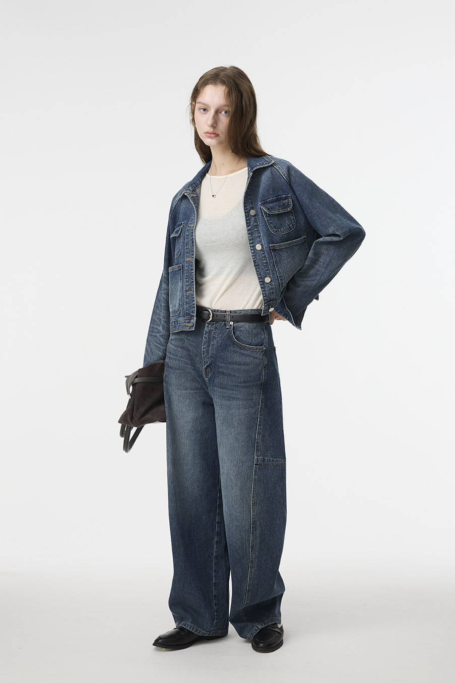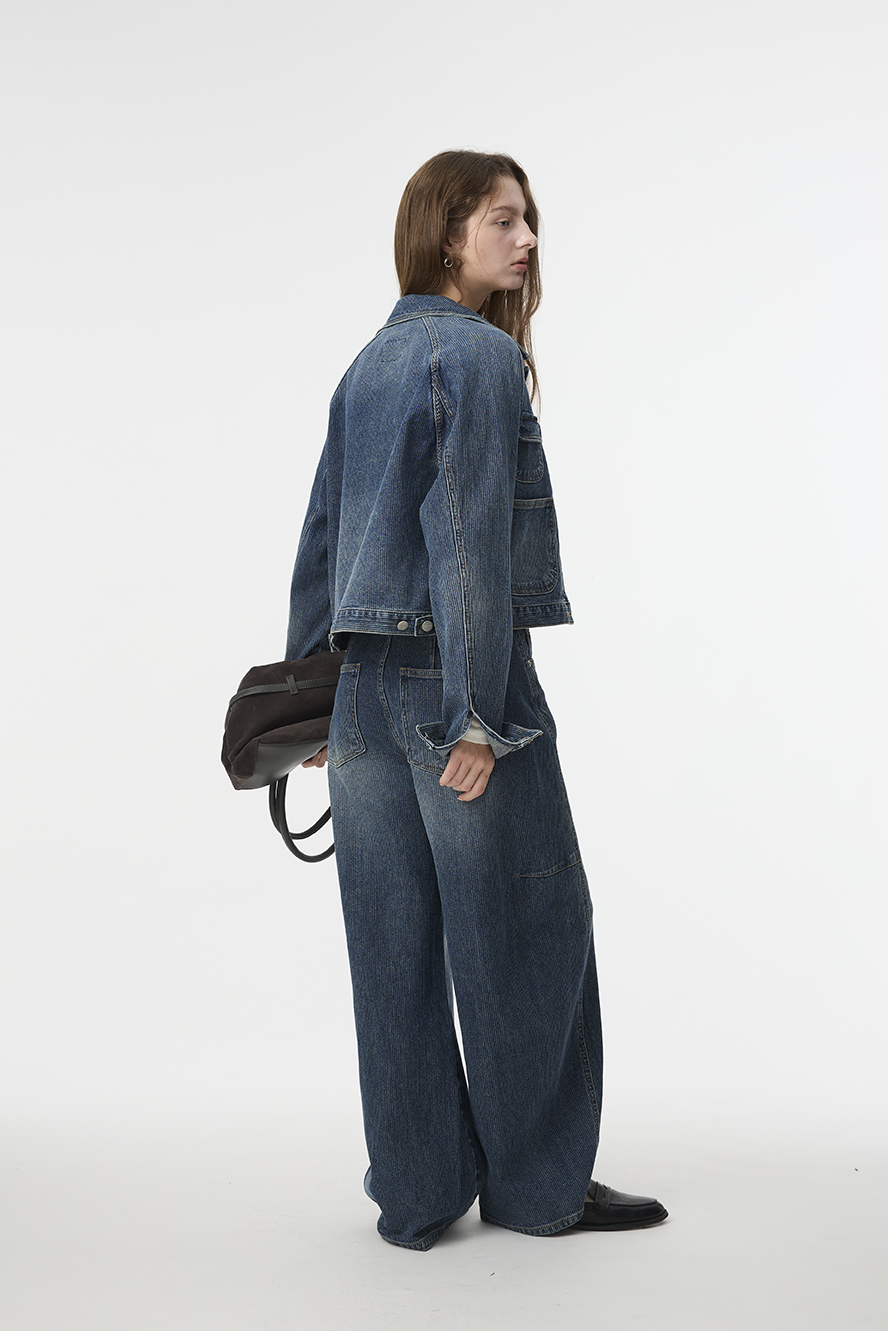 布料經過三次細緻水洗處理,呈現低飽和微霧藍色調,在光線下帶出柔和層次。