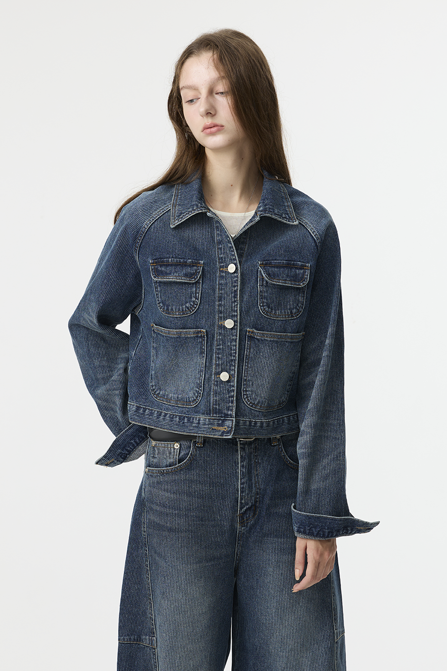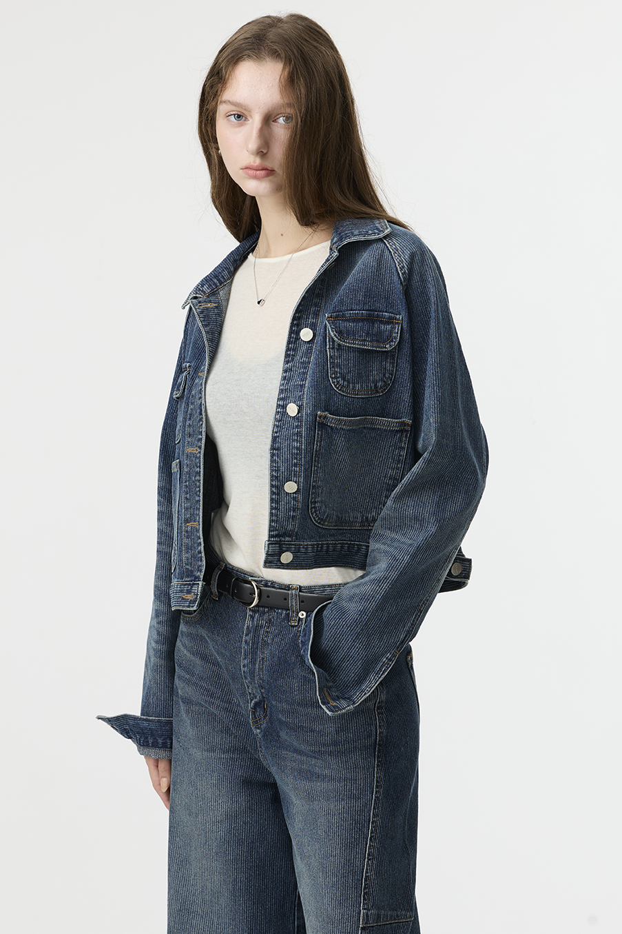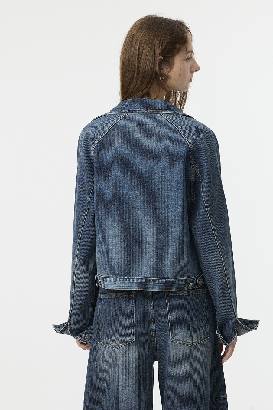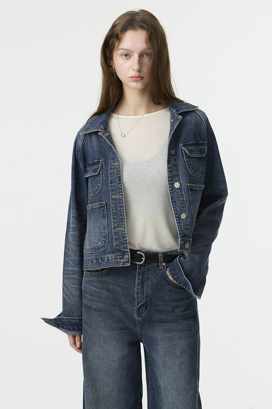 布料經過三次細緻水洗處理,呈現低飽和微霧藍色調,在光線下帶出柔和層次。