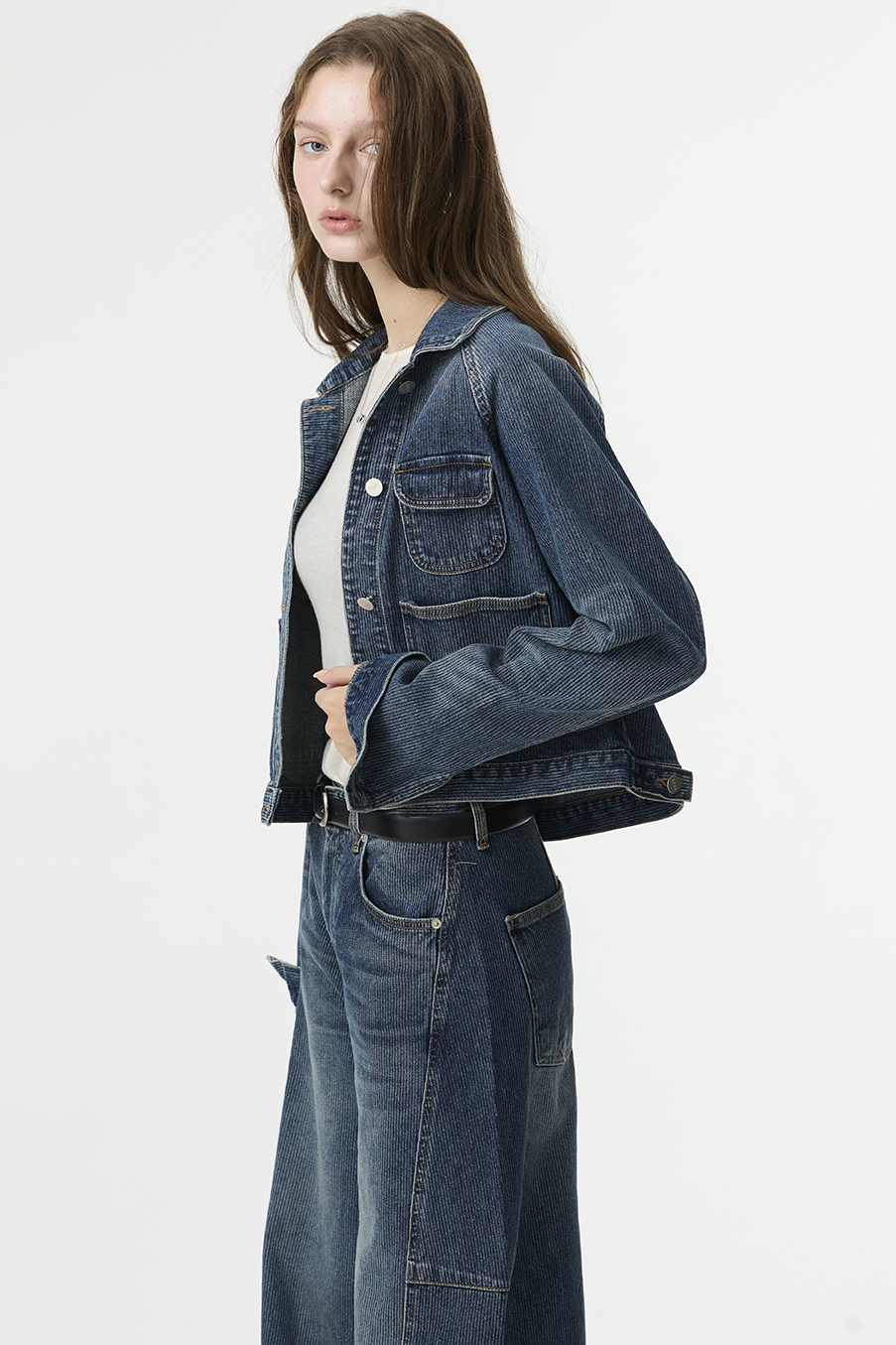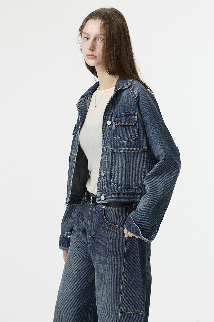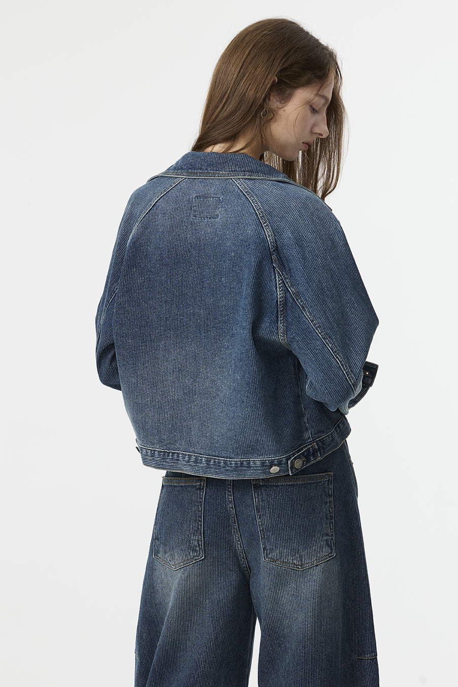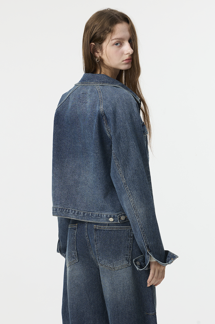 布料經過三次細緻水洗處理,呈現低飽和微霧藍色調,在光線下帶出柔和層次。