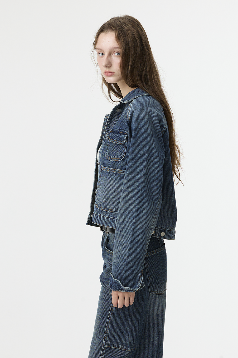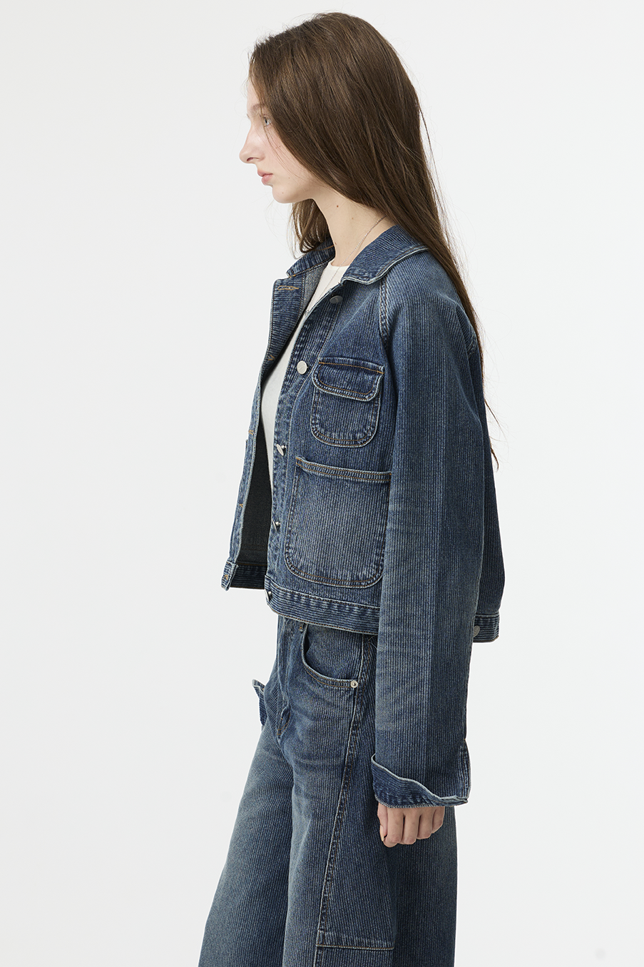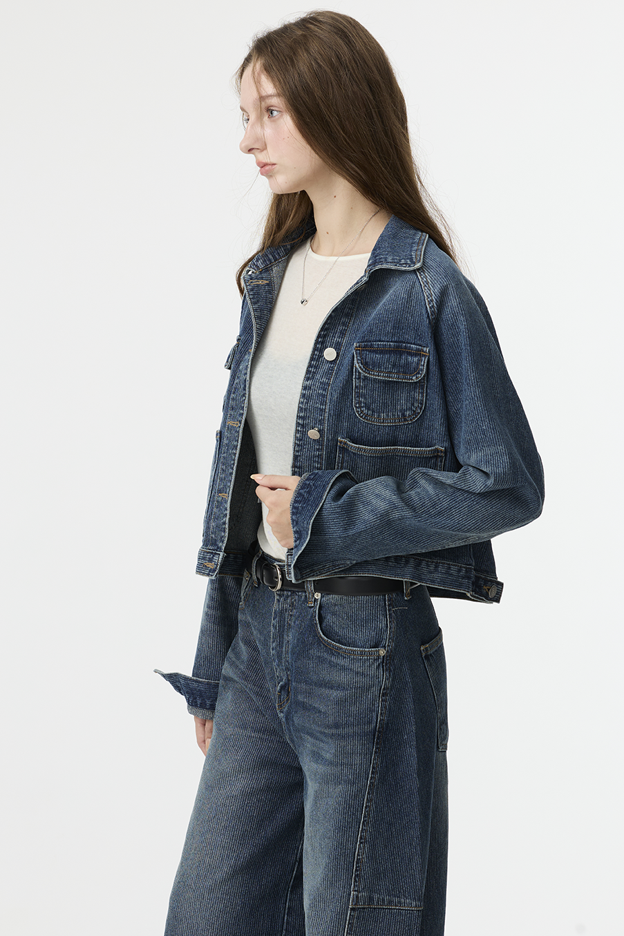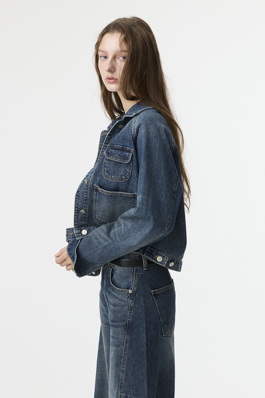 布料經過三次細緻水洗處理,呈現低飽和微霧藍色調,在光線下帶出柔和層次。