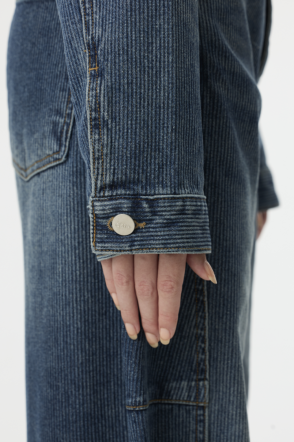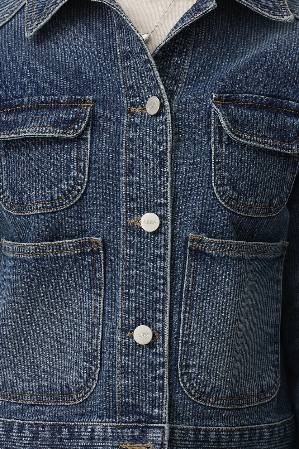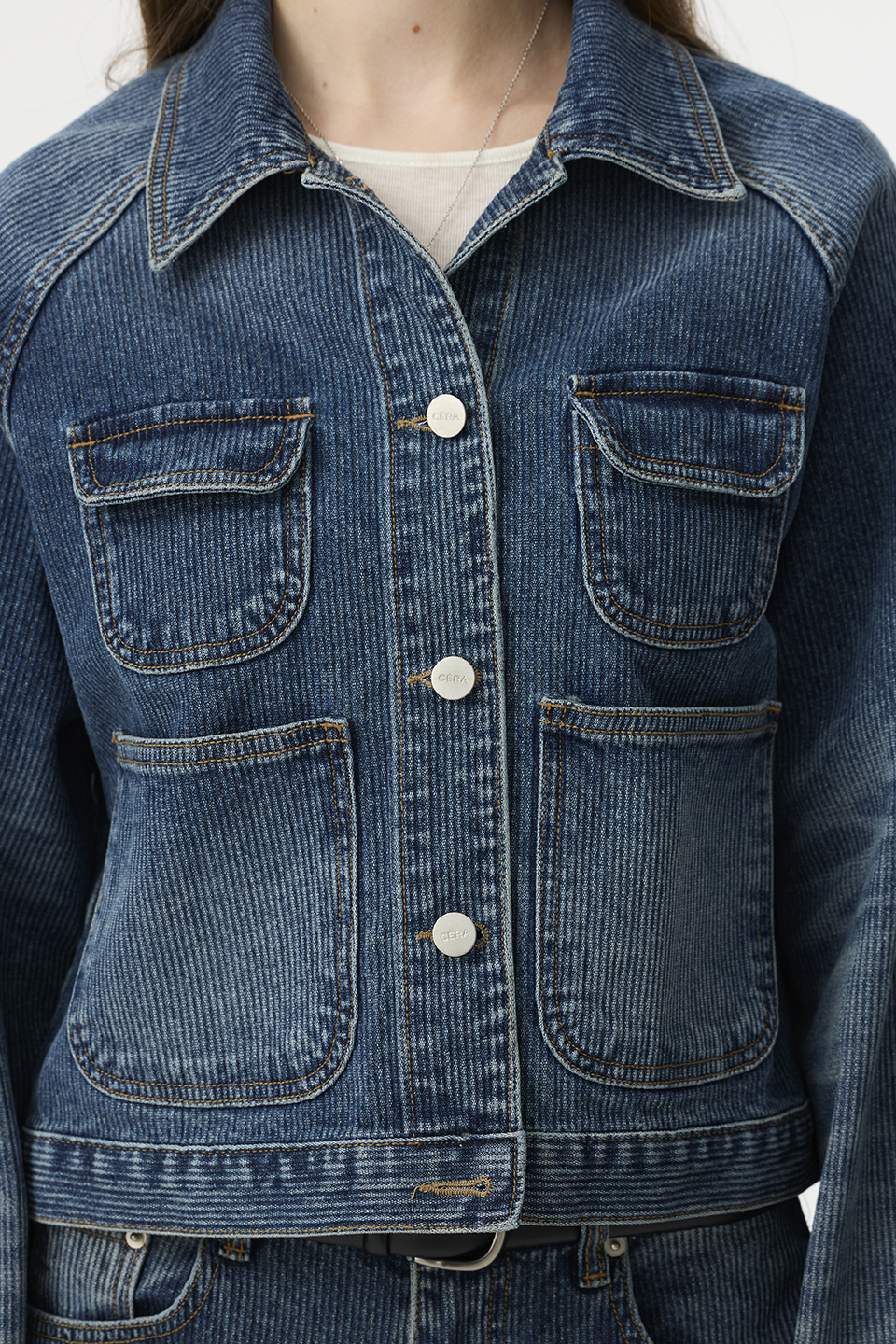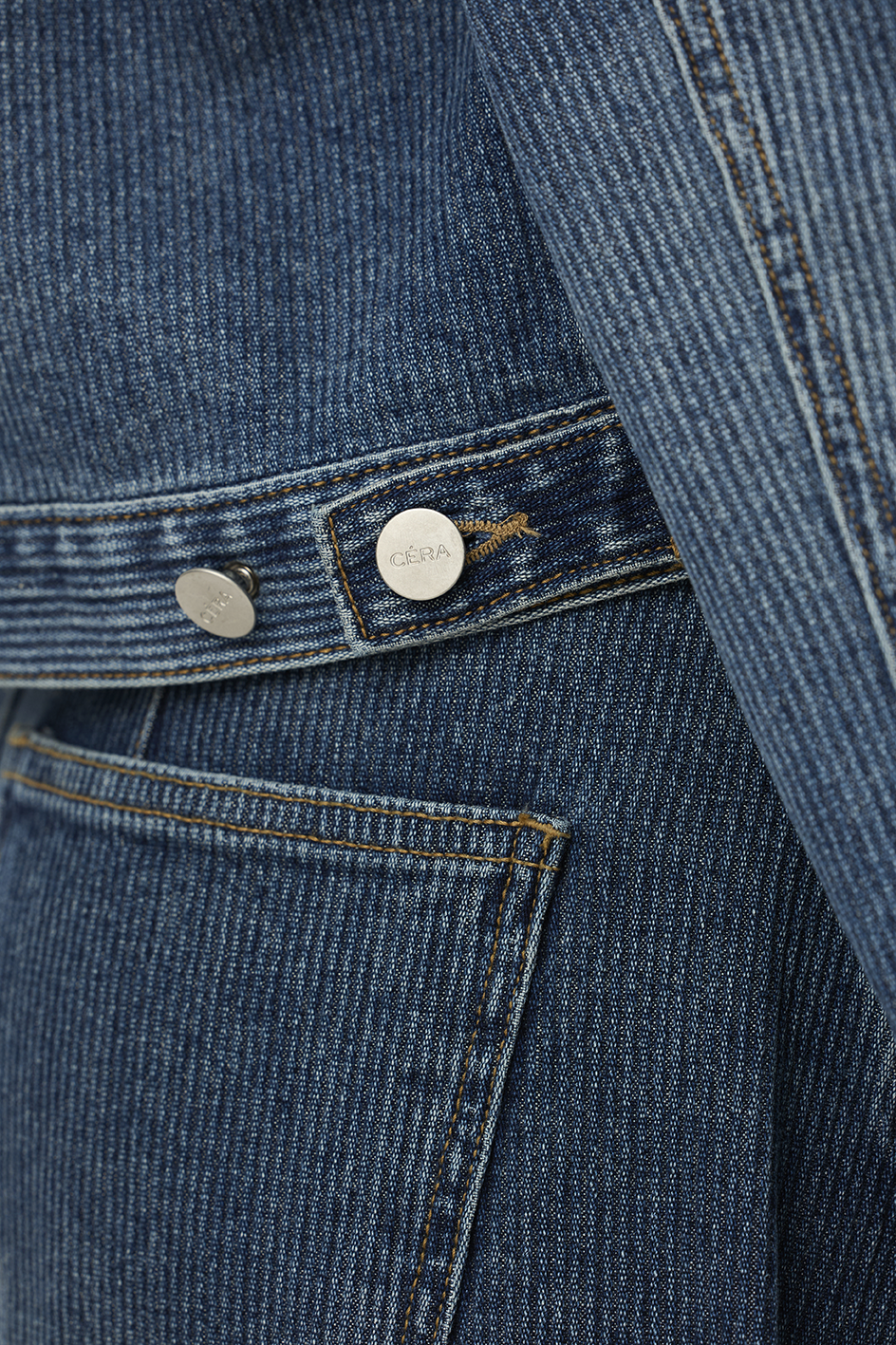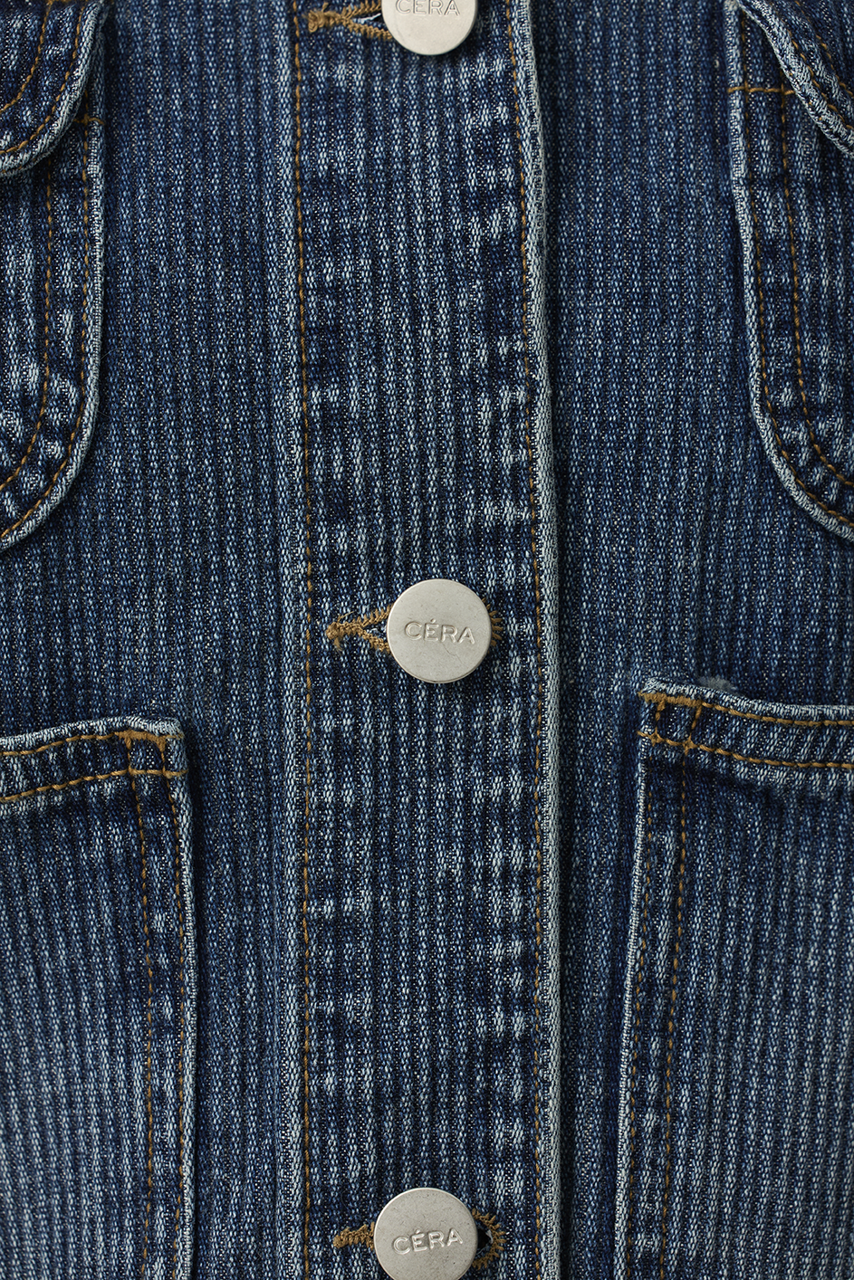 "延續 CÉRA 一貫的俐落線條與結構設計,以高密度丹寧布料打造出立體挺版輪廓,穿上後能自然撐起肩線與身形比例,散發出「不費力的高級感」!