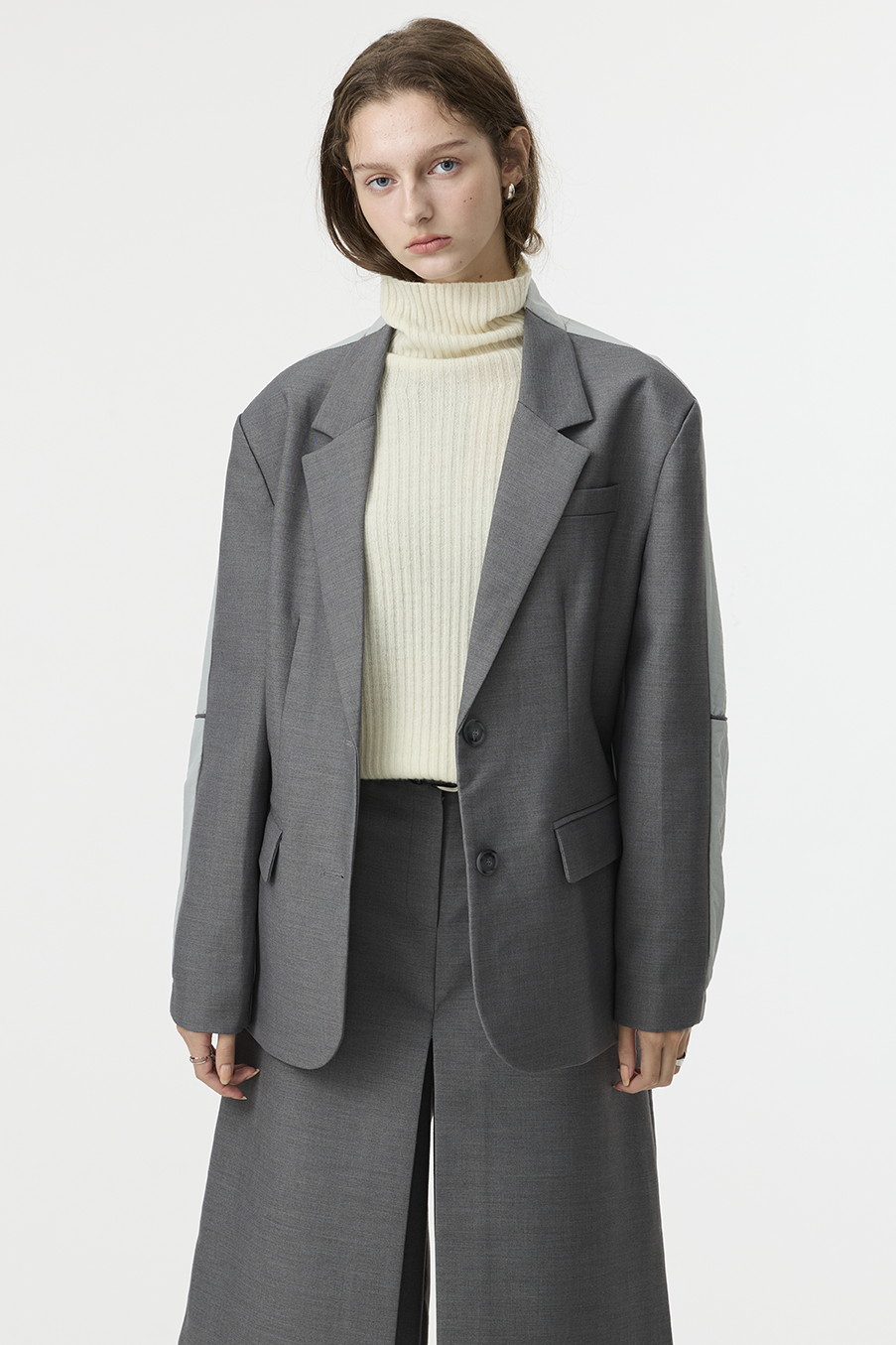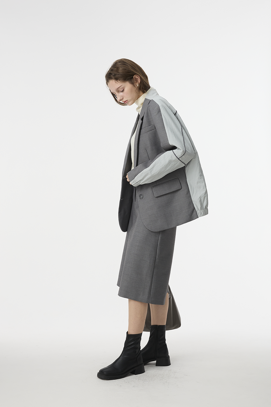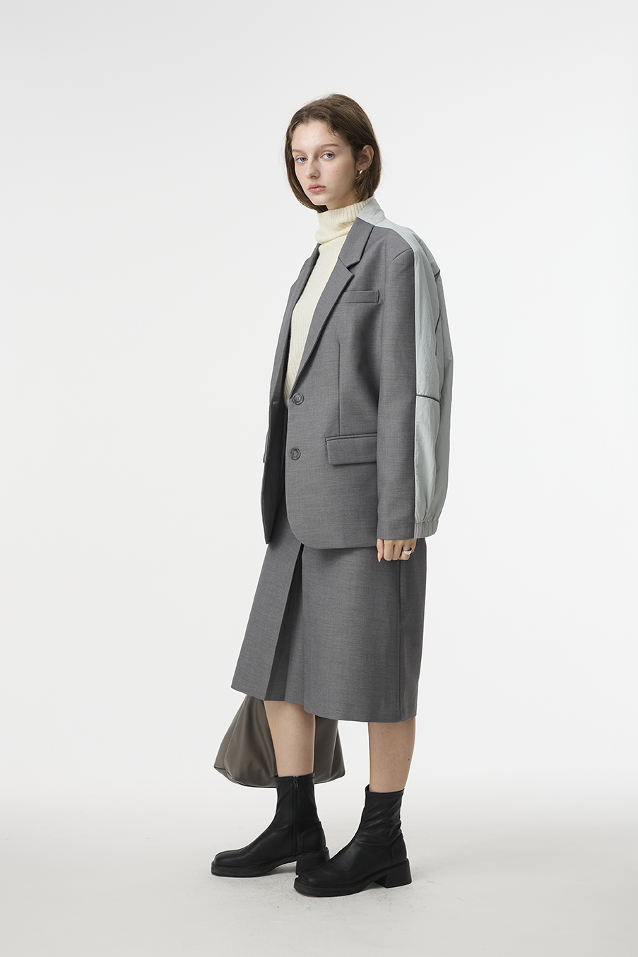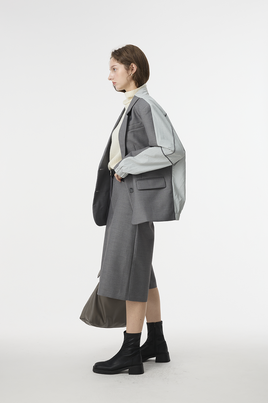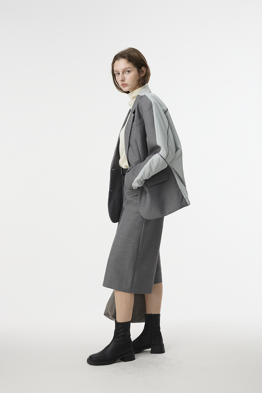 "採用 西裝混紡高級布料 製成,正面以霧面挺版質地展現俐落線條,背面拼接微光澤材質,延續 CÉRA 的極簡剪裁語彙,