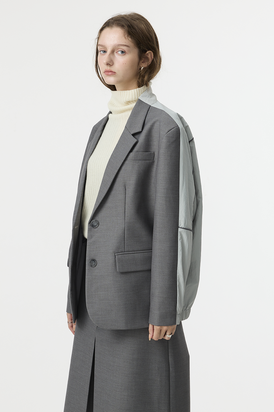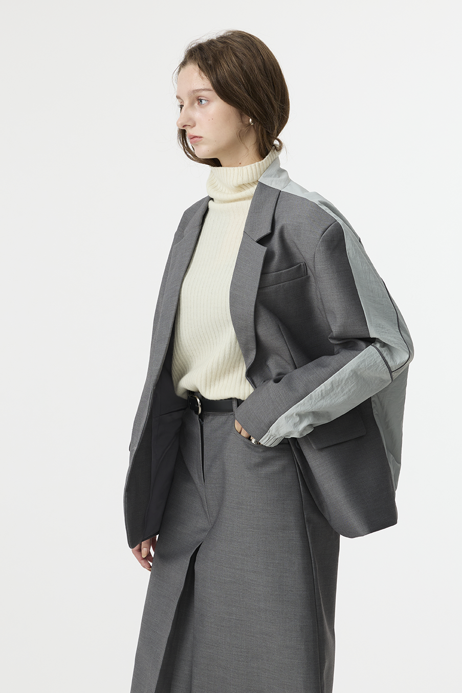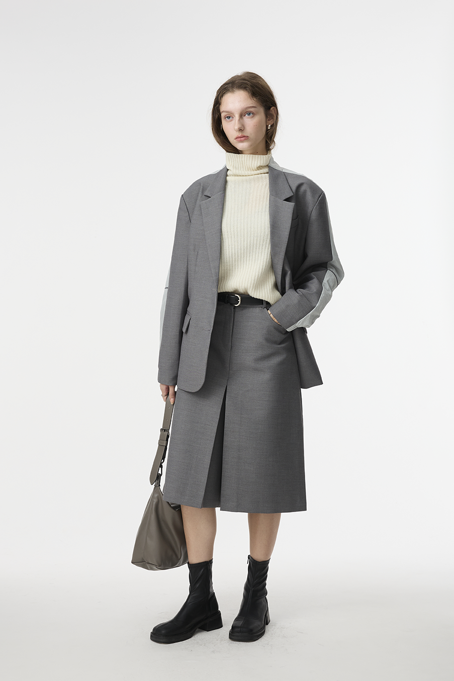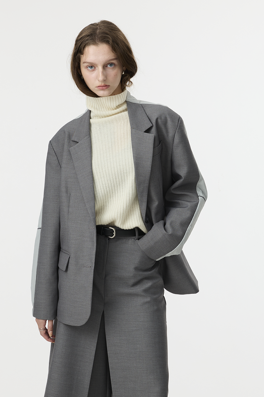 "採用 西裝混紡高級布料 製成,正面以霧面挺版質地展現俐落線條,背面拼接微光澤材質,延續 CÉRA 的極簡剪裁語彙,