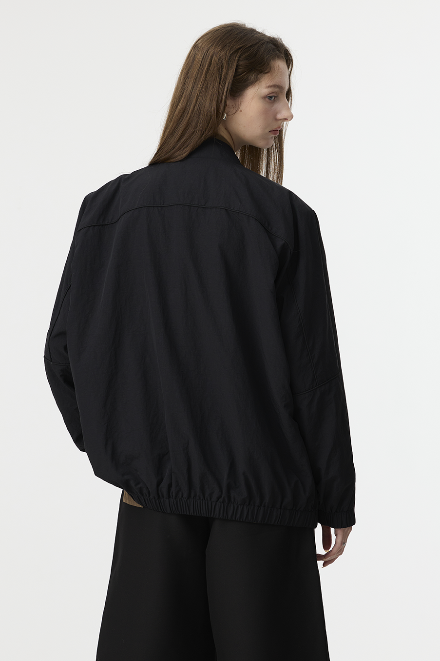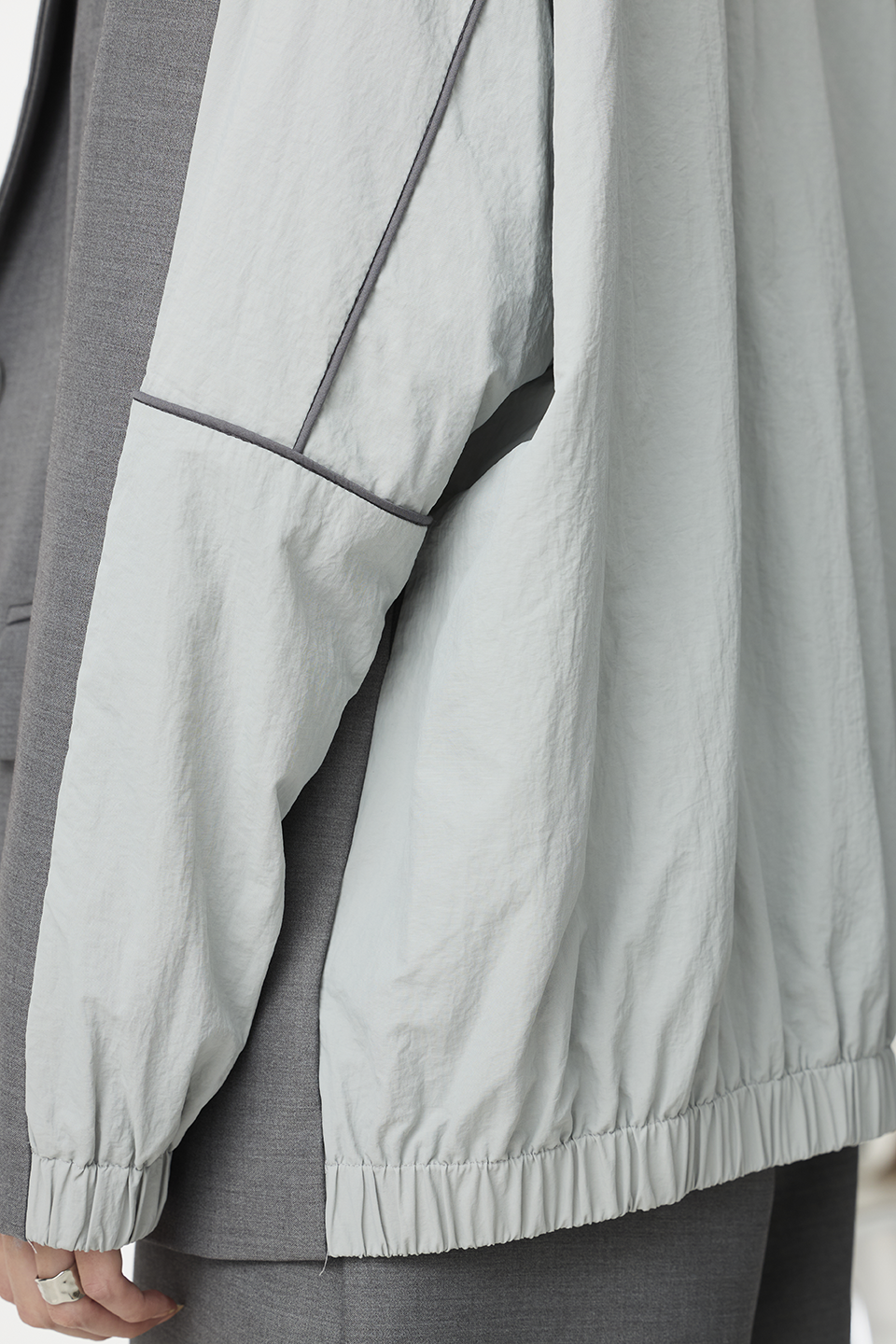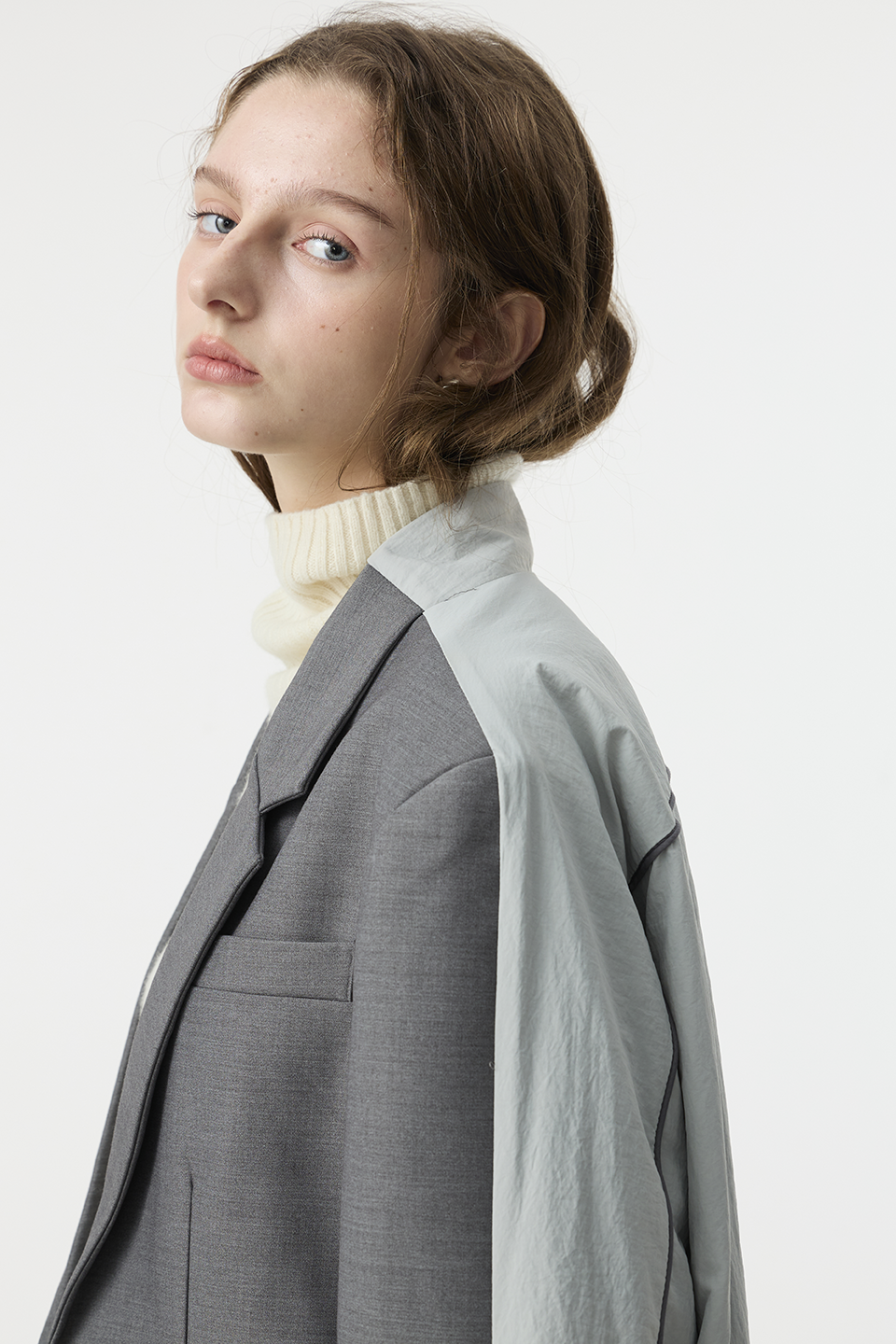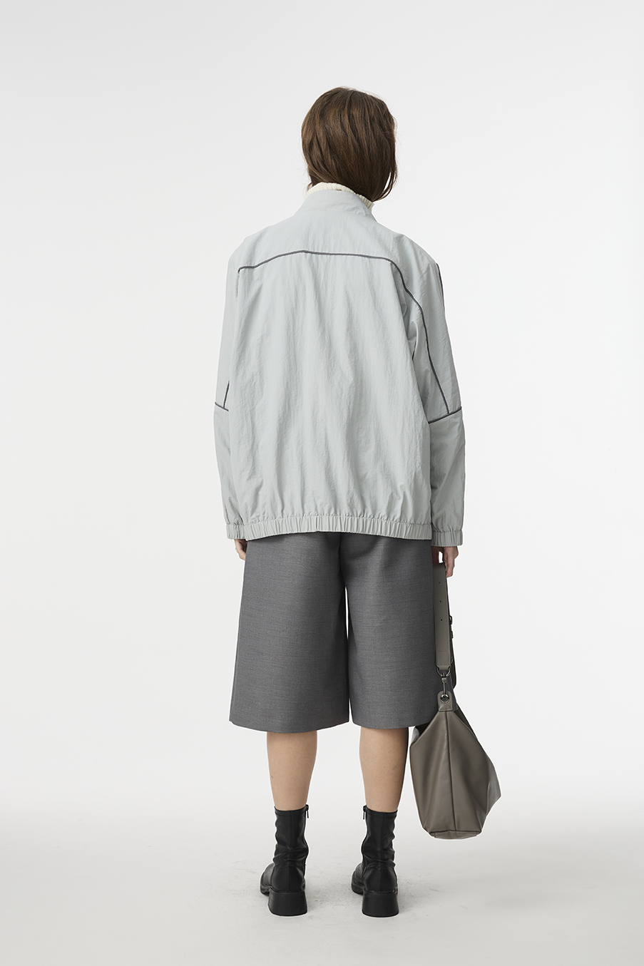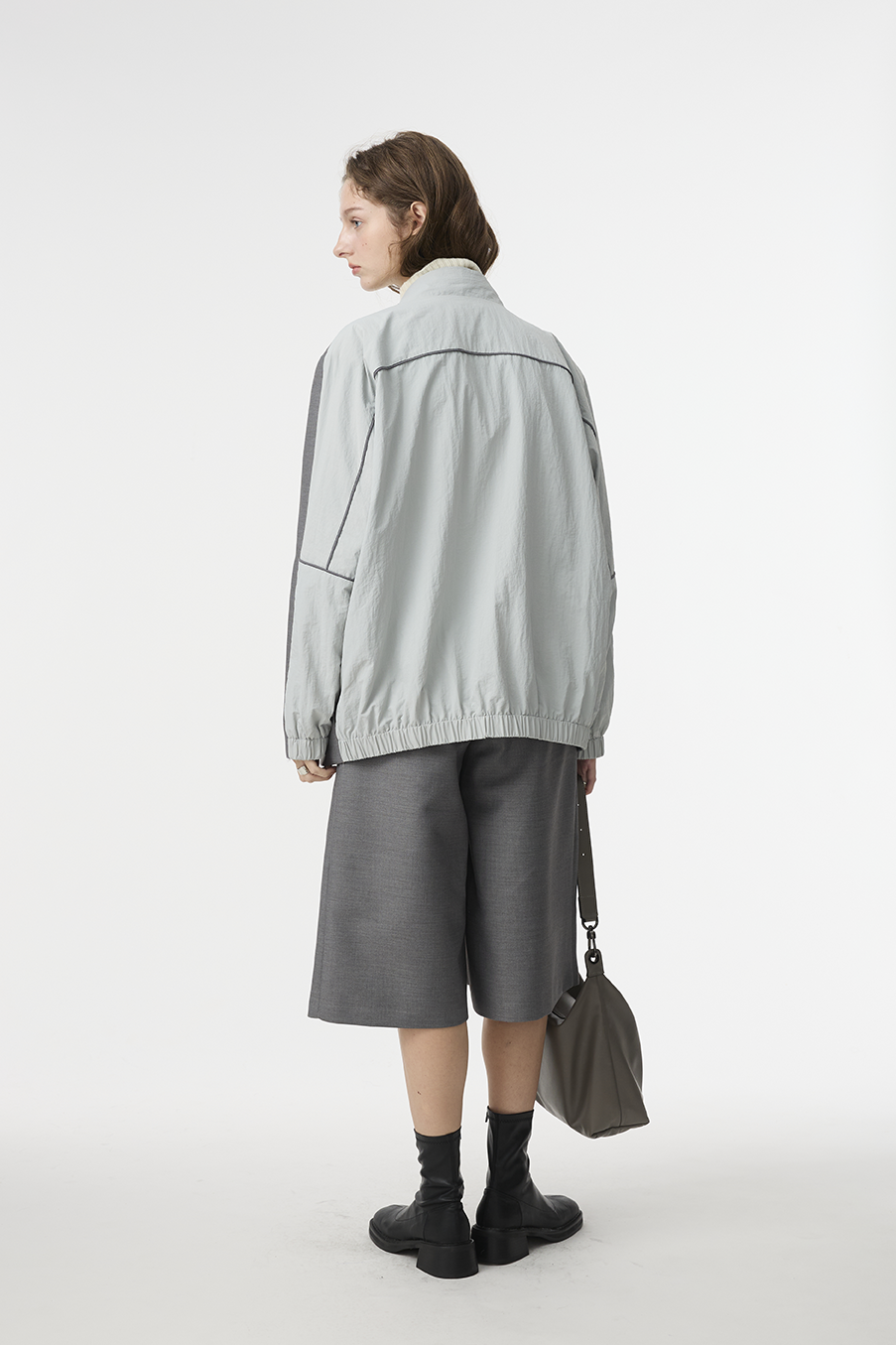 "採用 西裝混紡高級布料 製成,正面以霧面挺版質地展現俐落線條,背面拼接微光澤材質,延續 CÉRA 的極簡剪裁語彙,