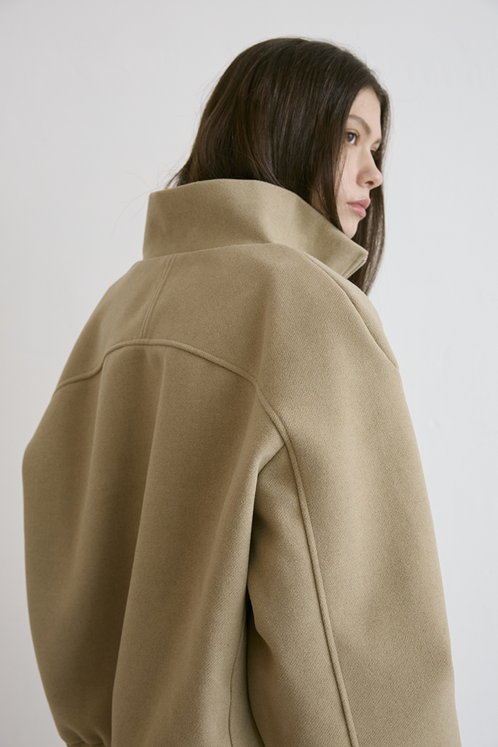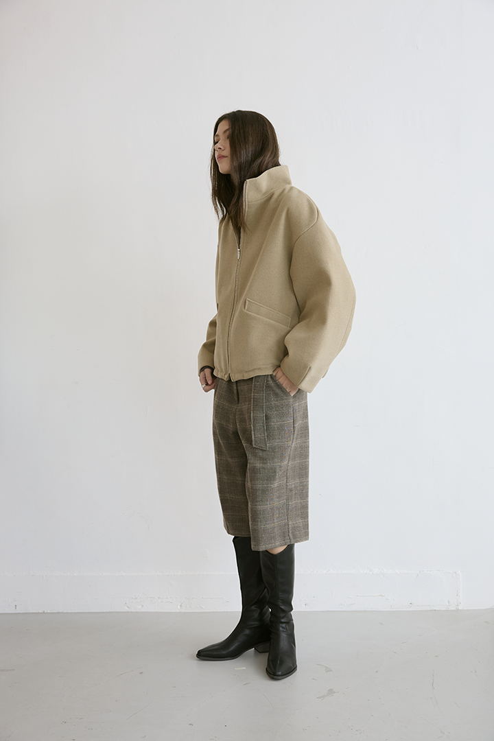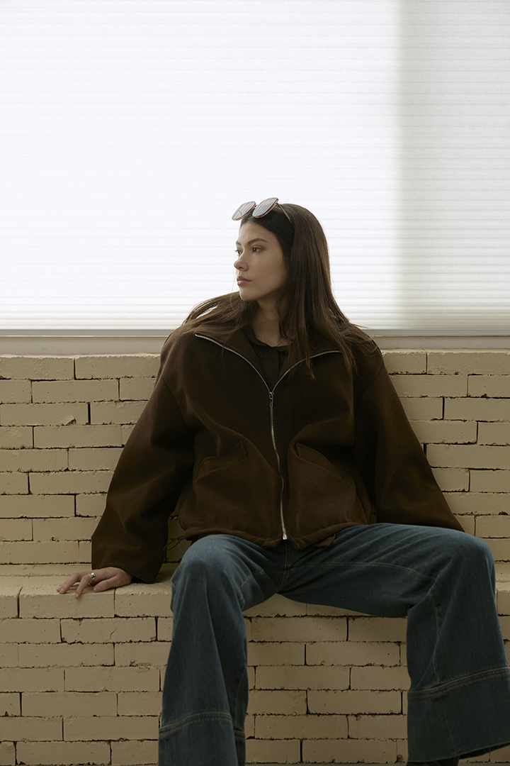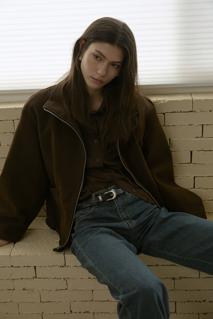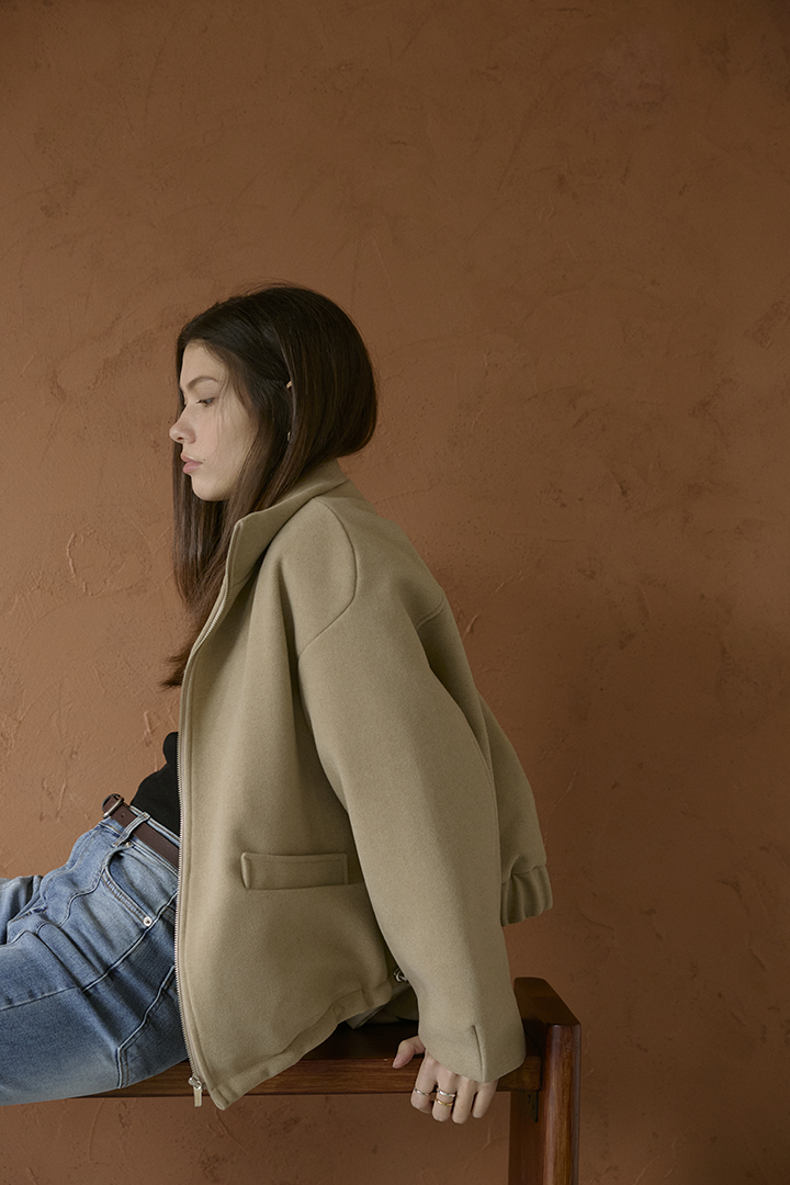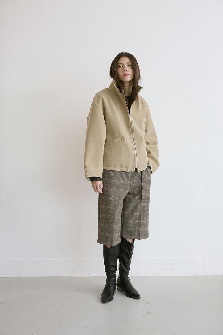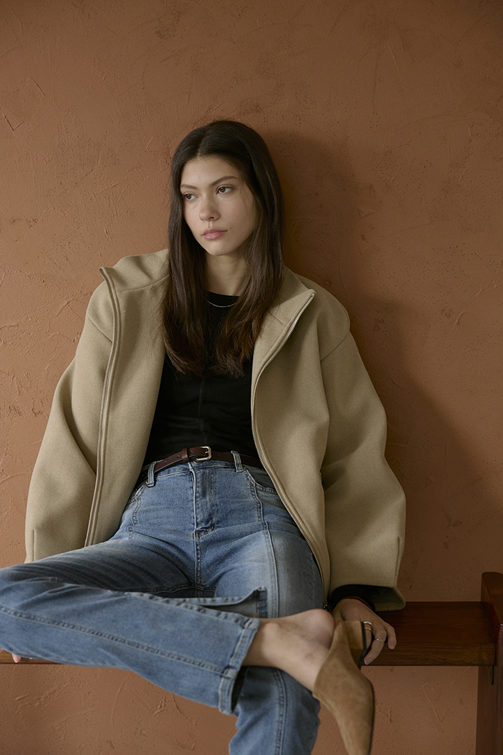 選用含羊毛的高質感混紡布料,觸摸手感紮實,穿上能明顯感受到布料的挺度與份量感,卻不顯厚重。
