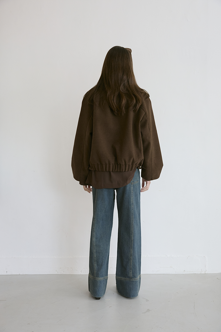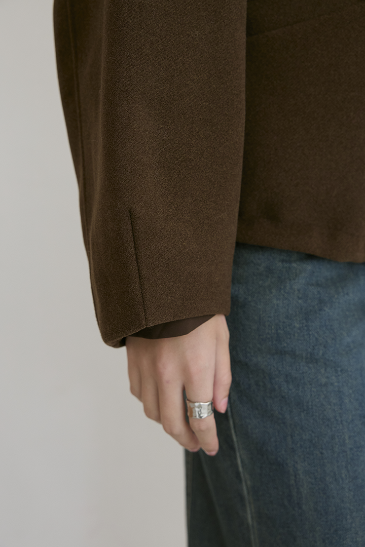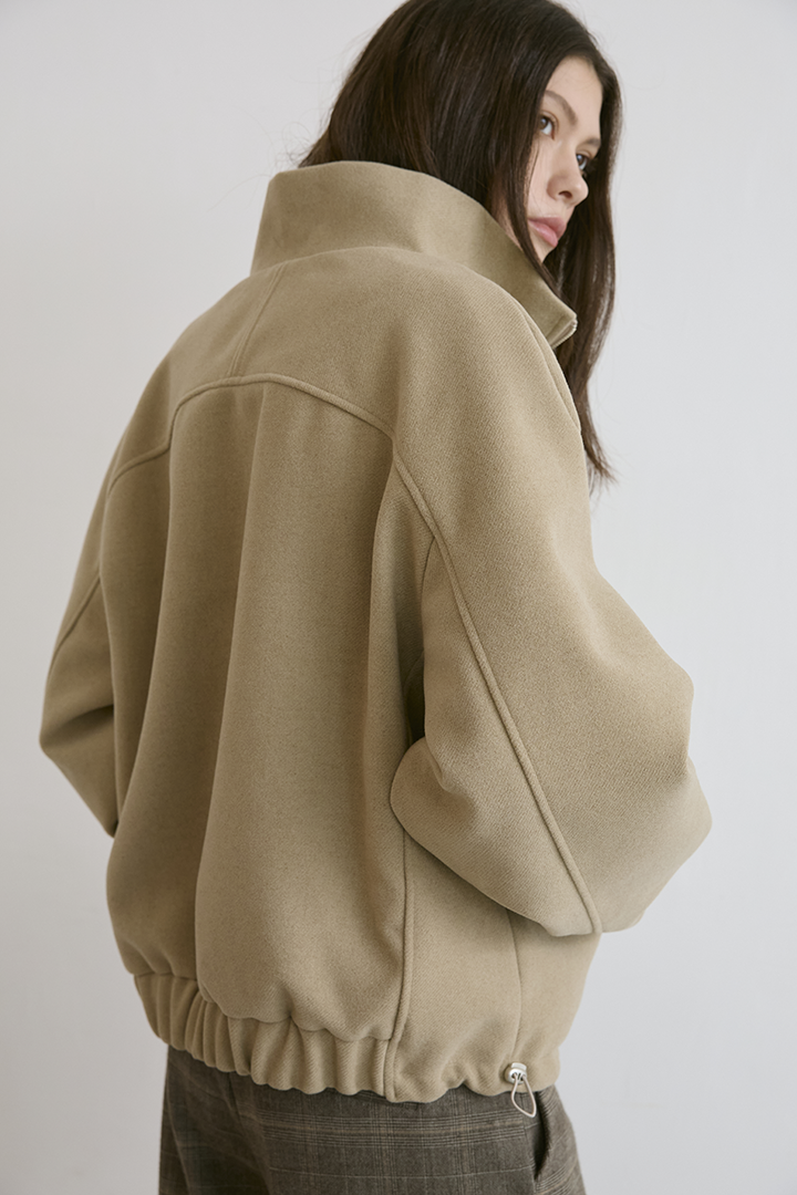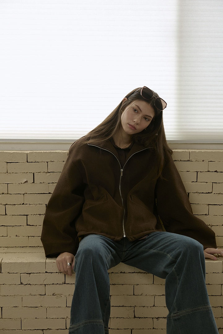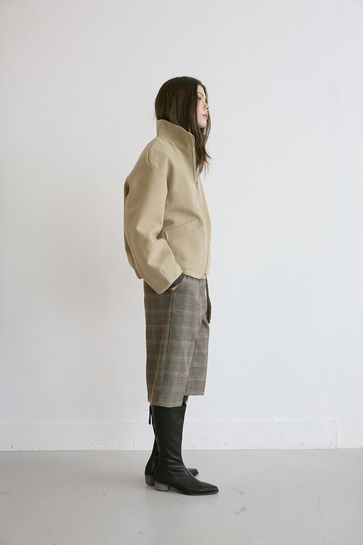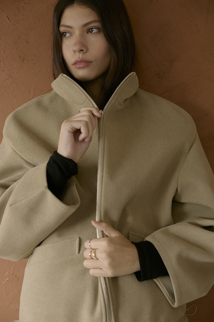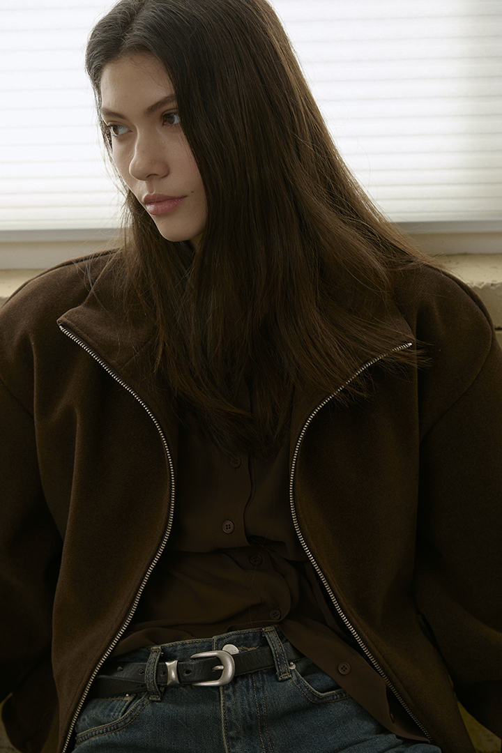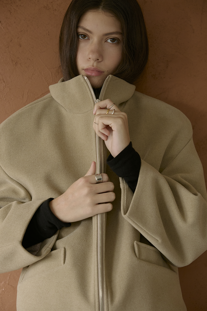 選用含羊毛的高質感混紡布料,觸摸手感紮實,穿上能明顯感受到布料的挺度與份量感,卻不顯厚重。