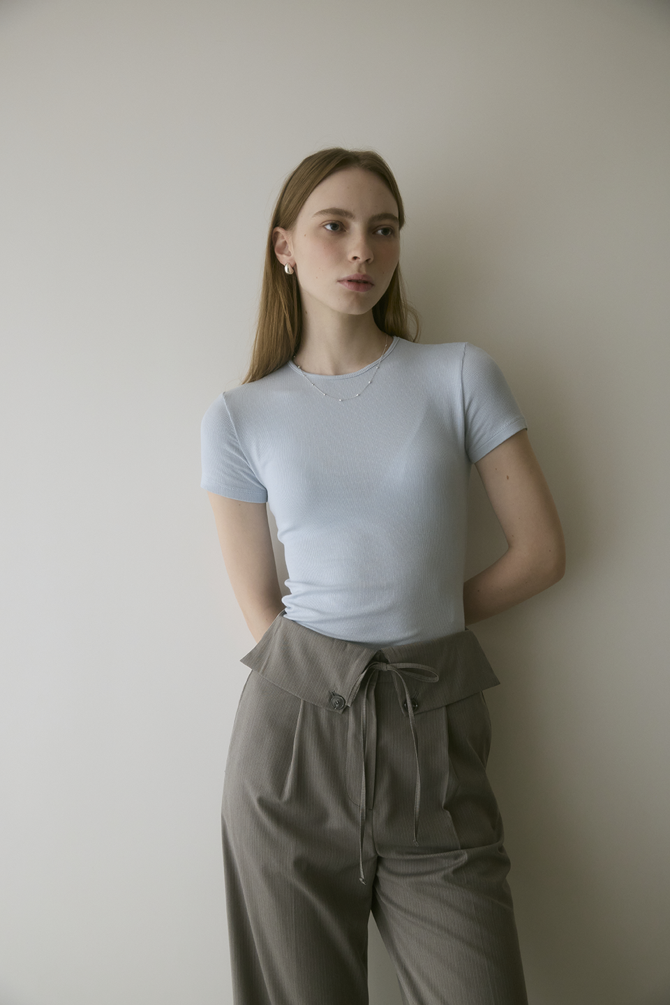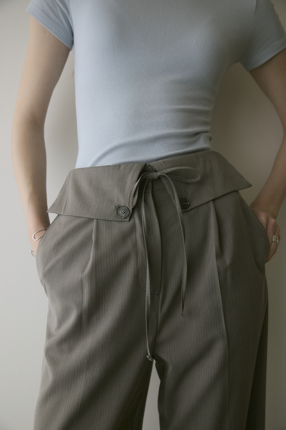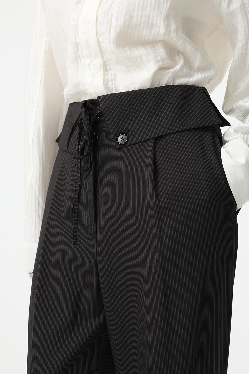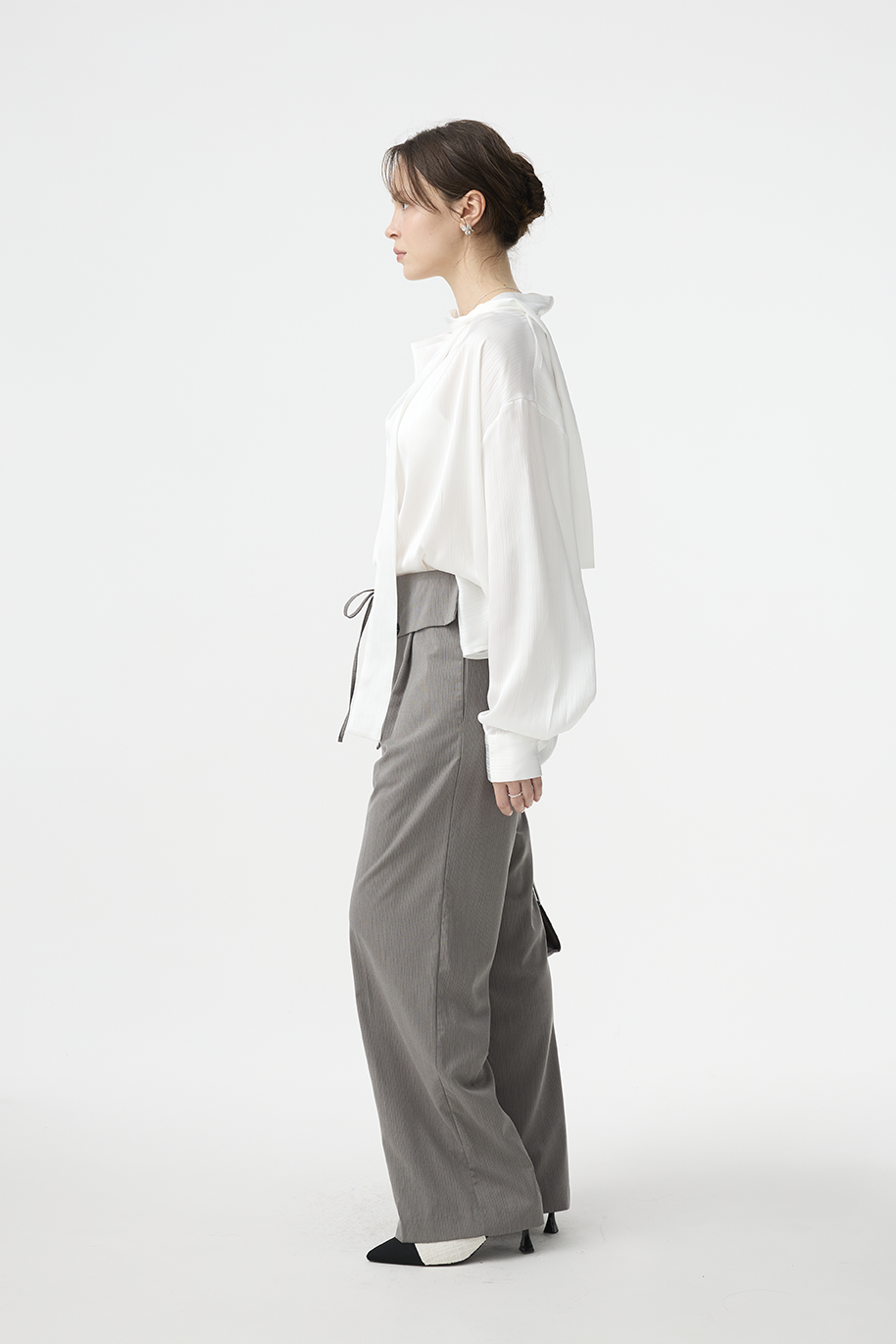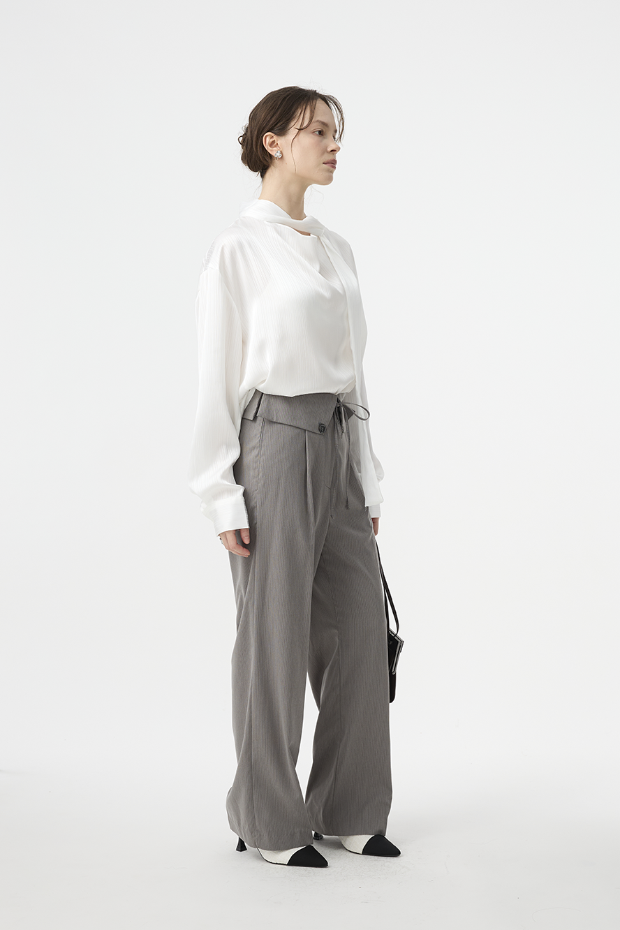 前片打褶設計自然釋放空間,弱化胯寬與腿部肉感,打造俐落流暢輪廓。