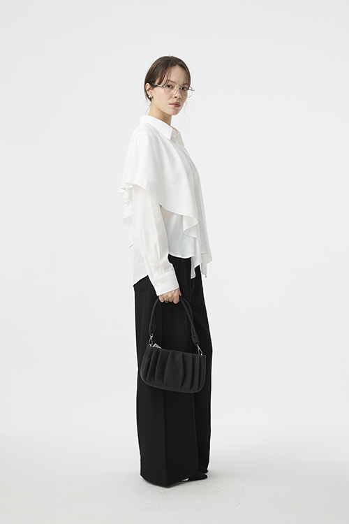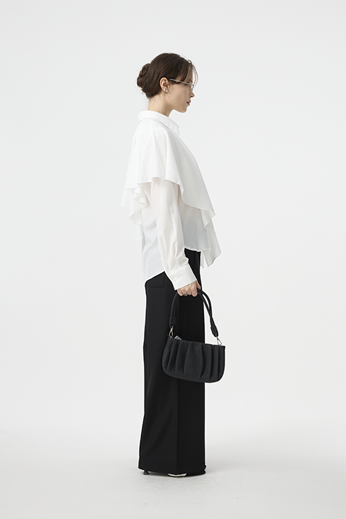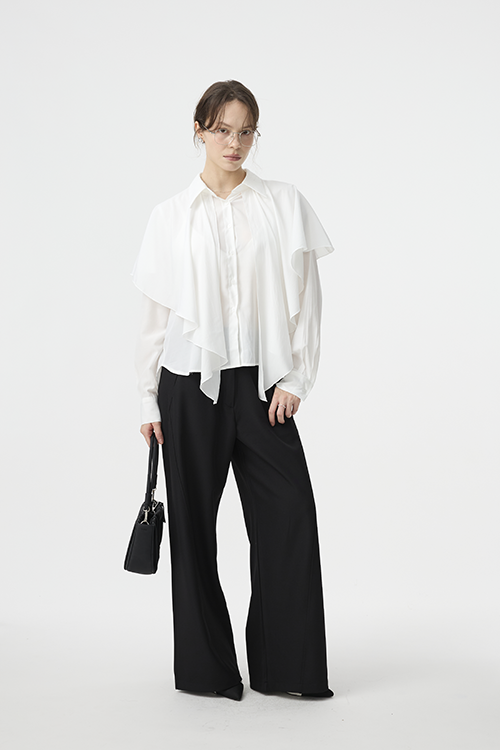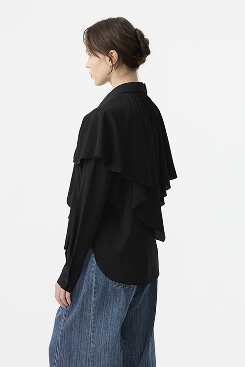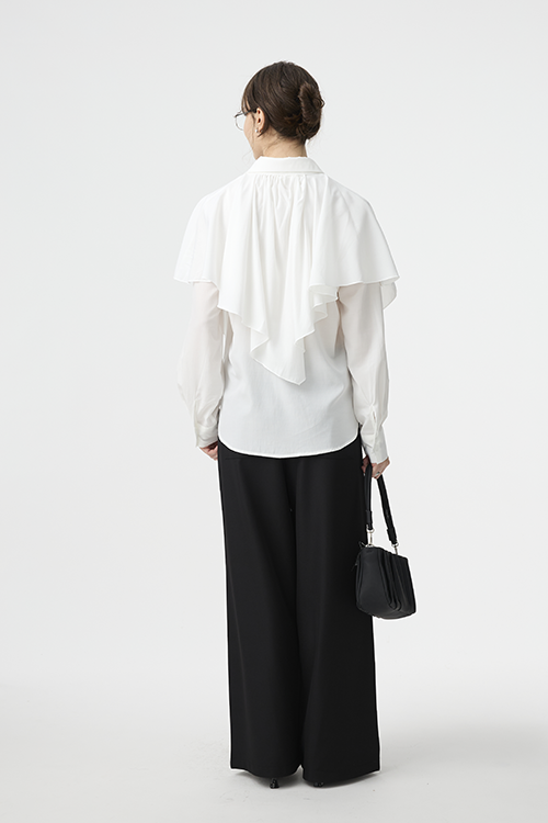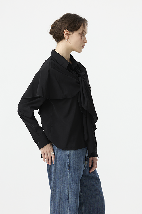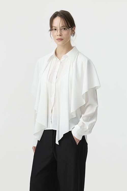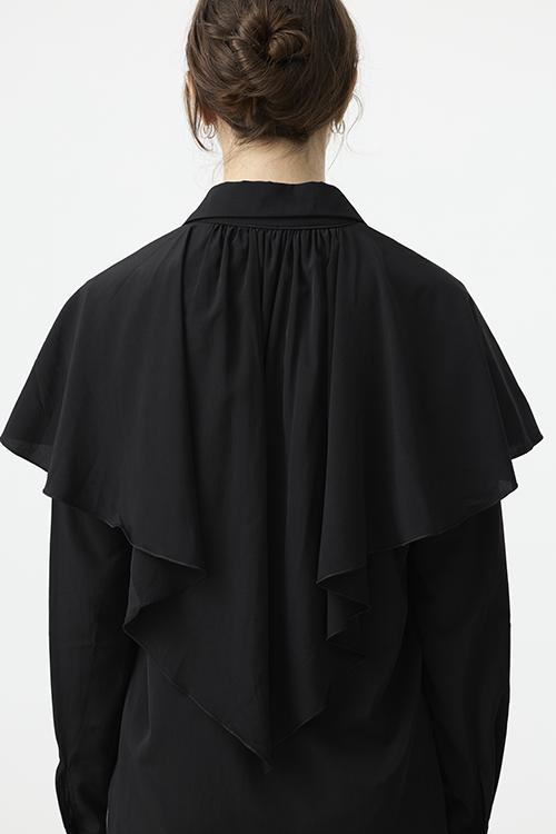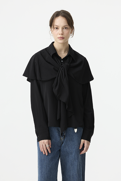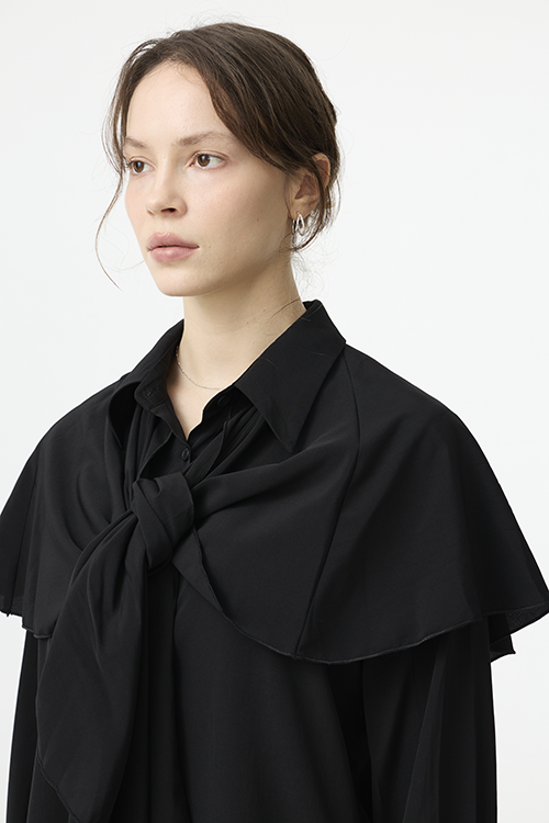 可作為披覆式層次穿搭,增添立體造型;或綁起披覆造型,呈現另一種簡潔襯衫輪廓,一件打造兩種比例。