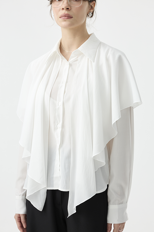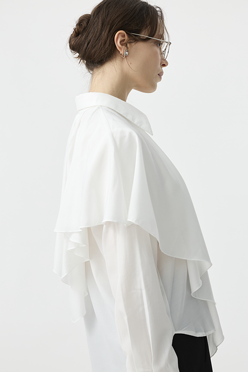 自然垂落的披覆結構,有效弱化手臂與肩部厚度,讓整體更顯輕盈纖細。