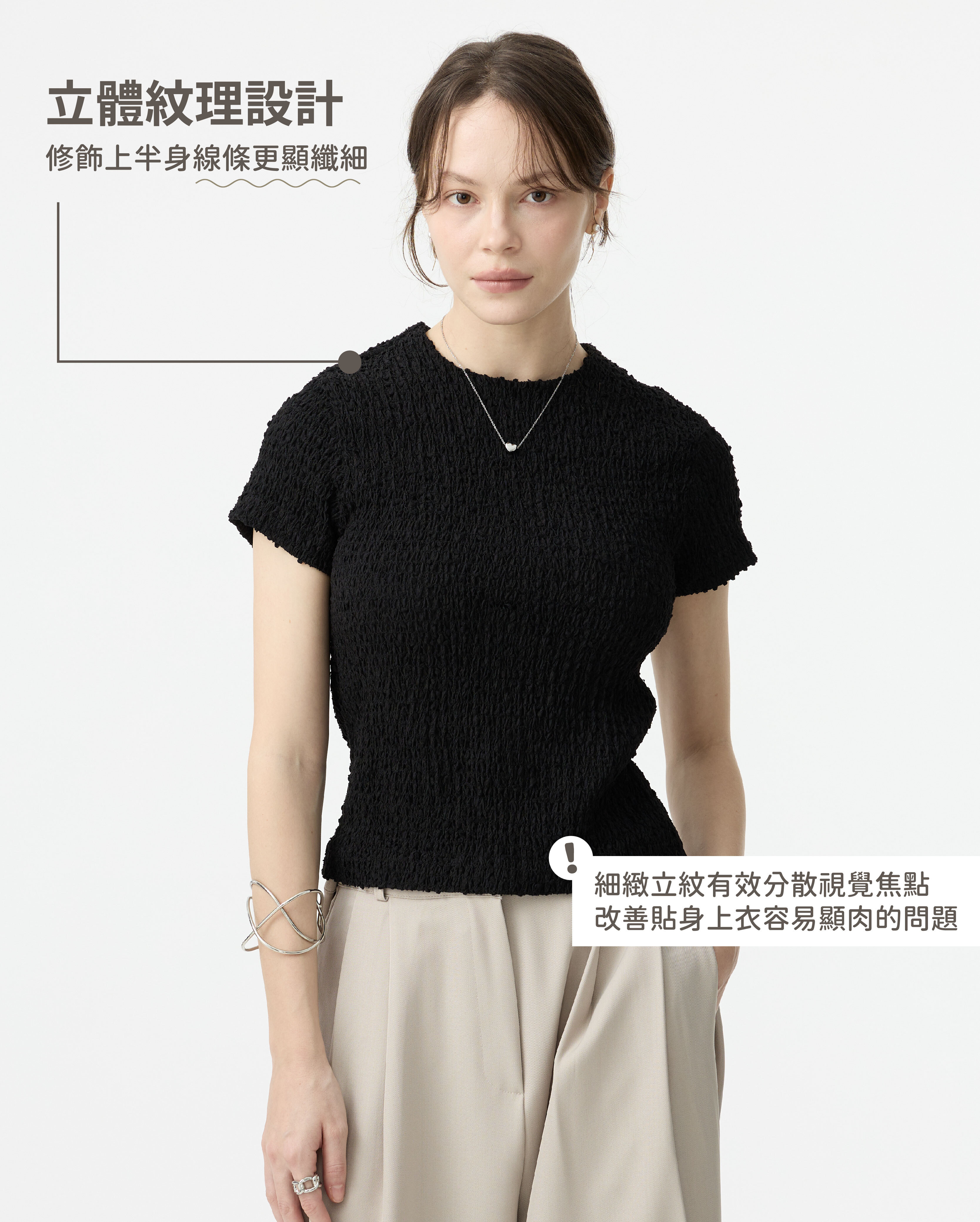 細緻立紋有效分散視覺焦點,改善貼身上衣容易顯肉的問題。