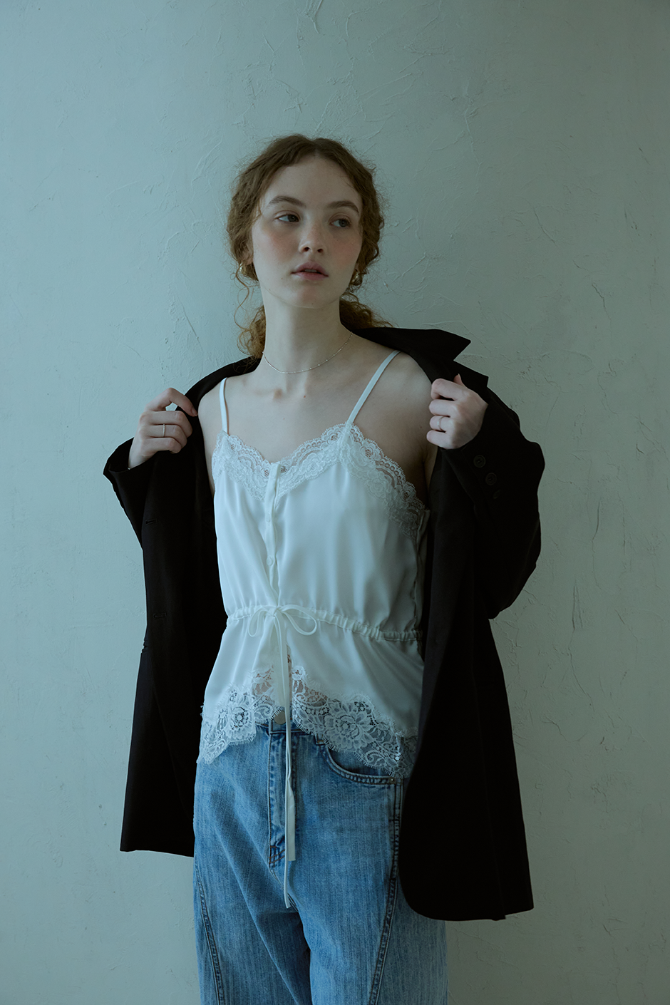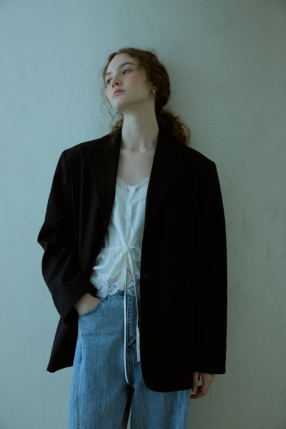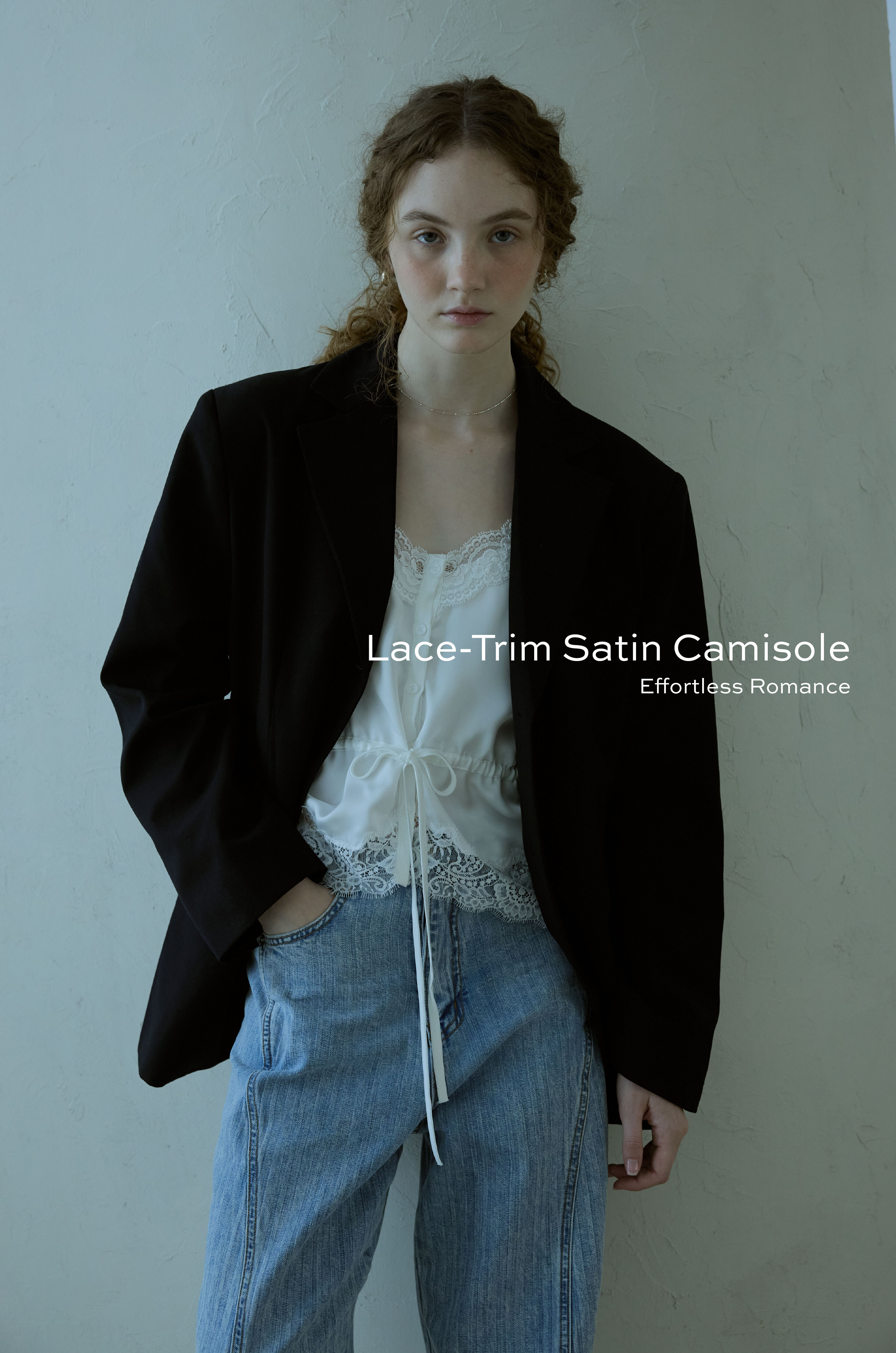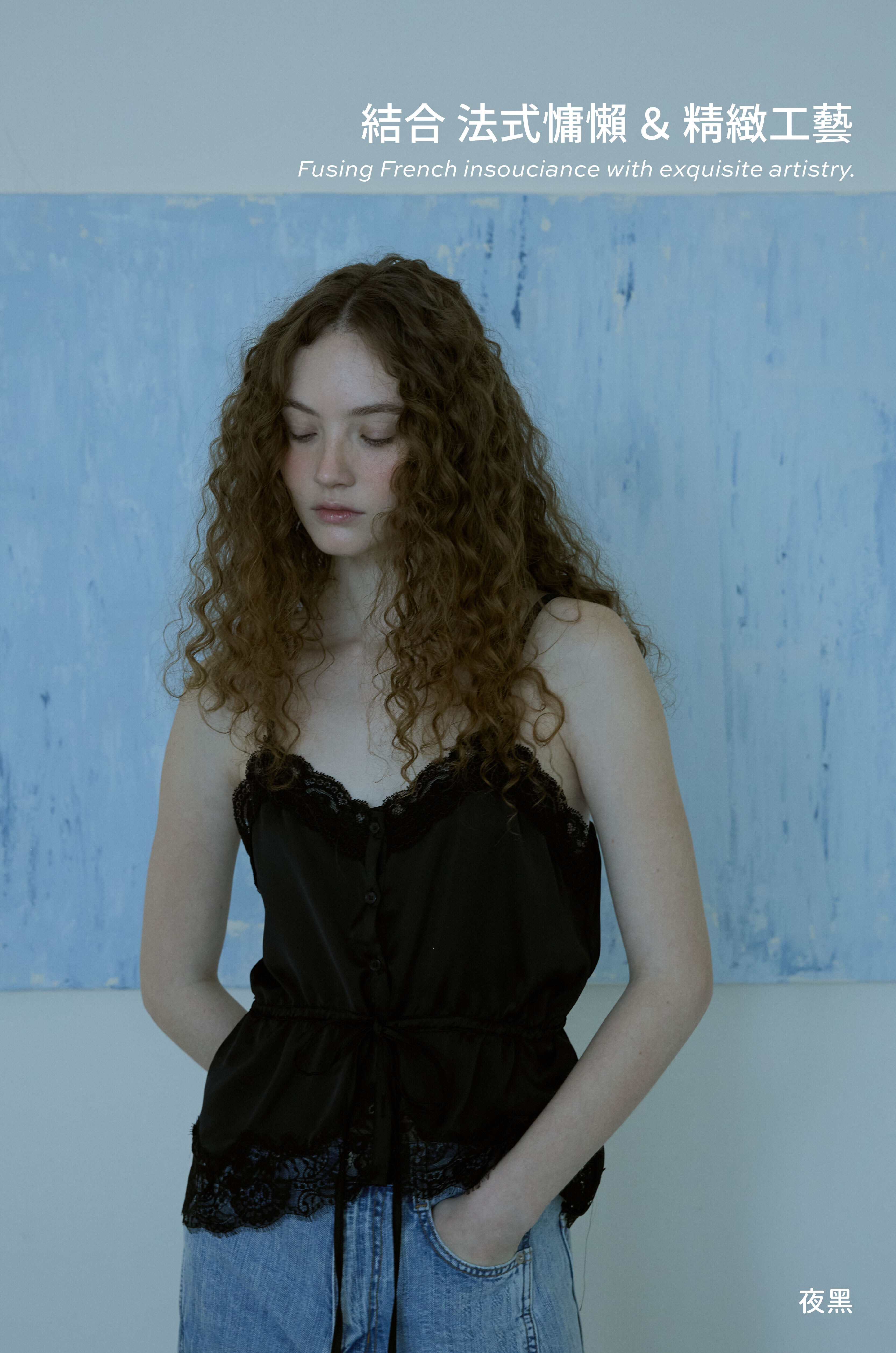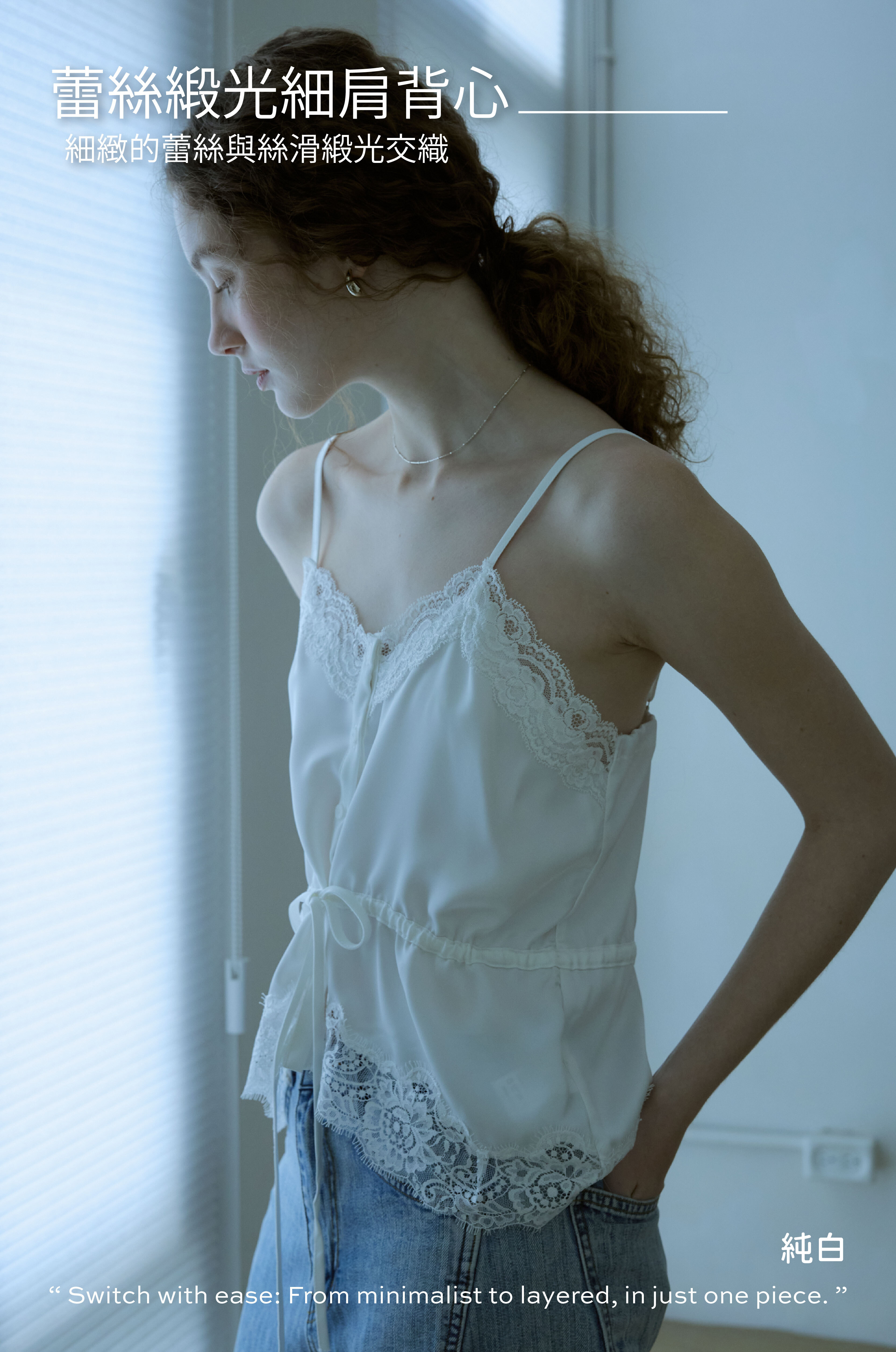 多層次穿搭核心:極具辨識度的外露蕾絲設計,非常適合作為西裝外套或針織衫內的層次點綴。