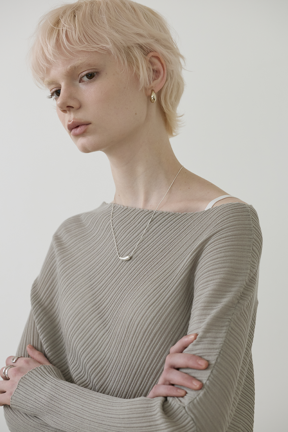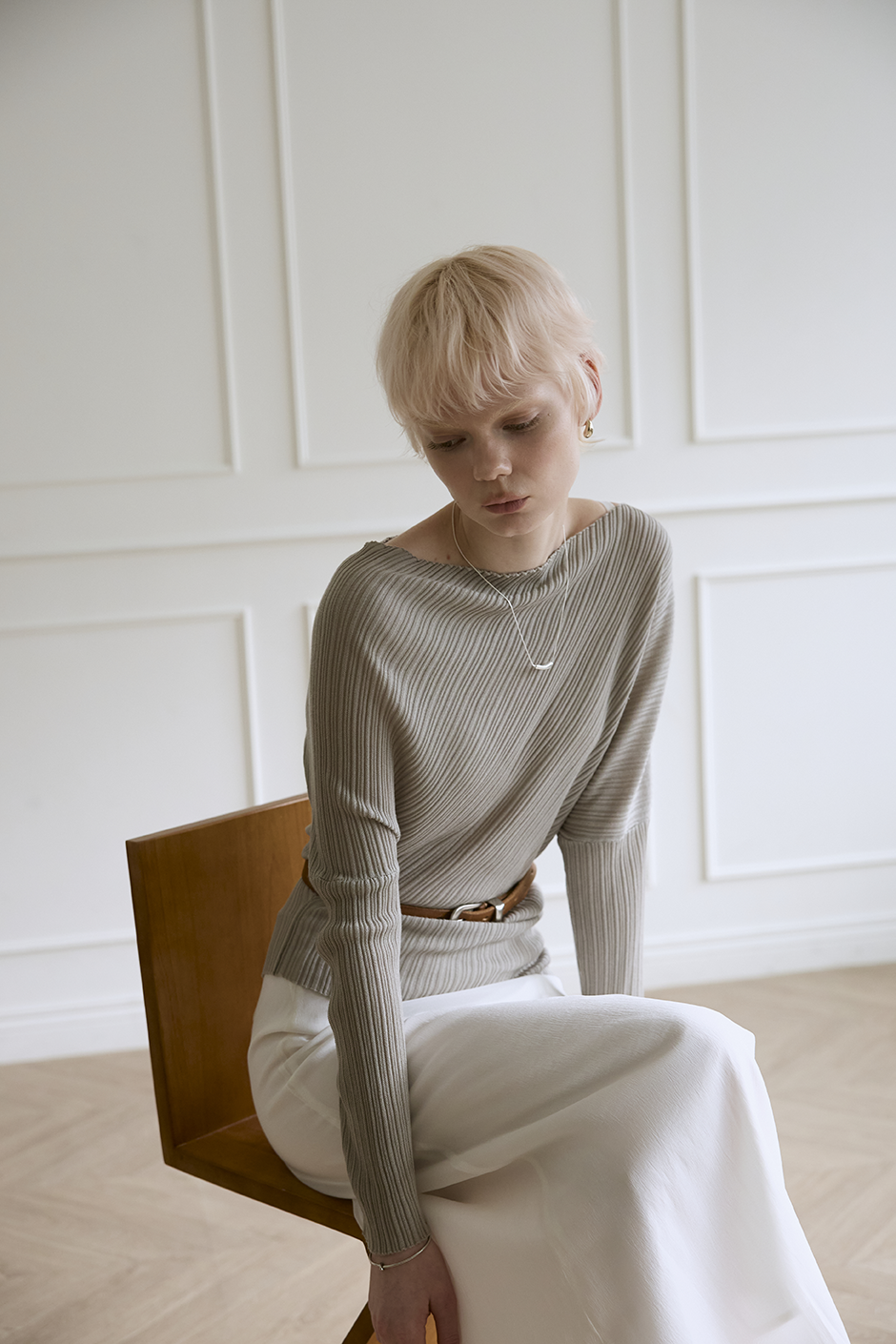 延伸肩頸比例: 微寬領口設計自然展露鎖骨,讓上半身線條更顯輕盈修長。